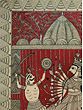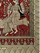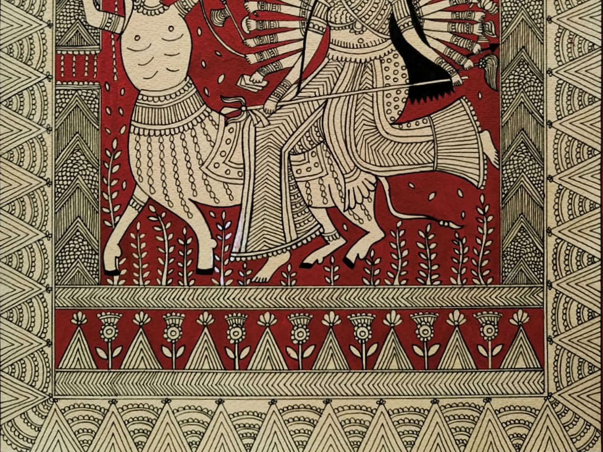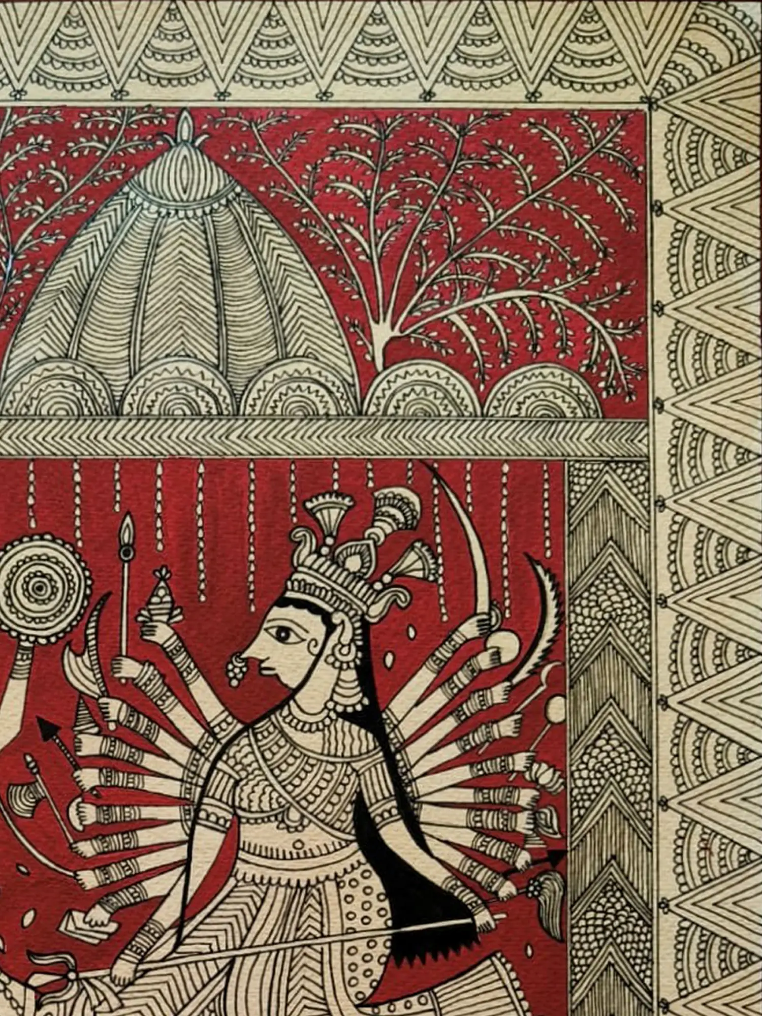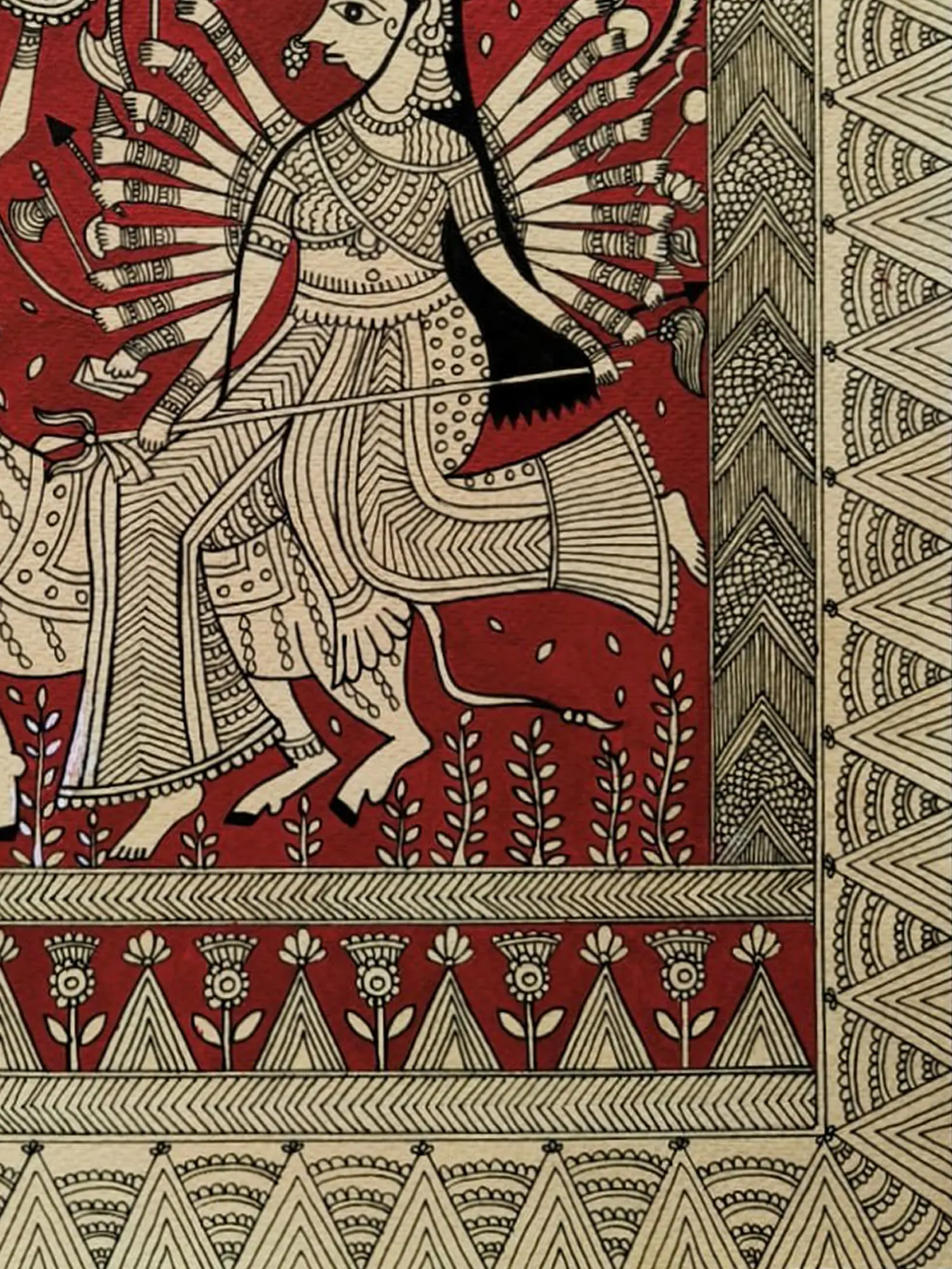 The composition is framed by intricate borders, drawing your eye towards the central figures. You'll appreciate the detailed rendering of the divine feminine, with her myriad of arms poised for action, and the fierce warrior facing her. The artist’s use of stark black outlines against the deep red backdrop creates a dramatic and dynamic contrast, enhancing the visual storytelling. The earthy tones and organic patterns in the surrounding elements further enrich the overall aesthetic appeal.