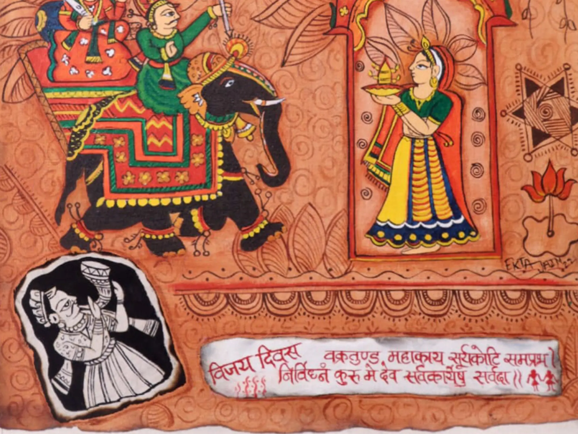 This artwork draws inspiration from India's rich cultural heritage, evoking the spirit of festivals and revered deities. The inclusion of Sanskrit script, potentially a mantra or blessing, adds a layer of spiritual significance. The narrative style, reminiscent of folk art traditions, conveys stories and beliefs passed down through generations, offering a tangible connection to the past.