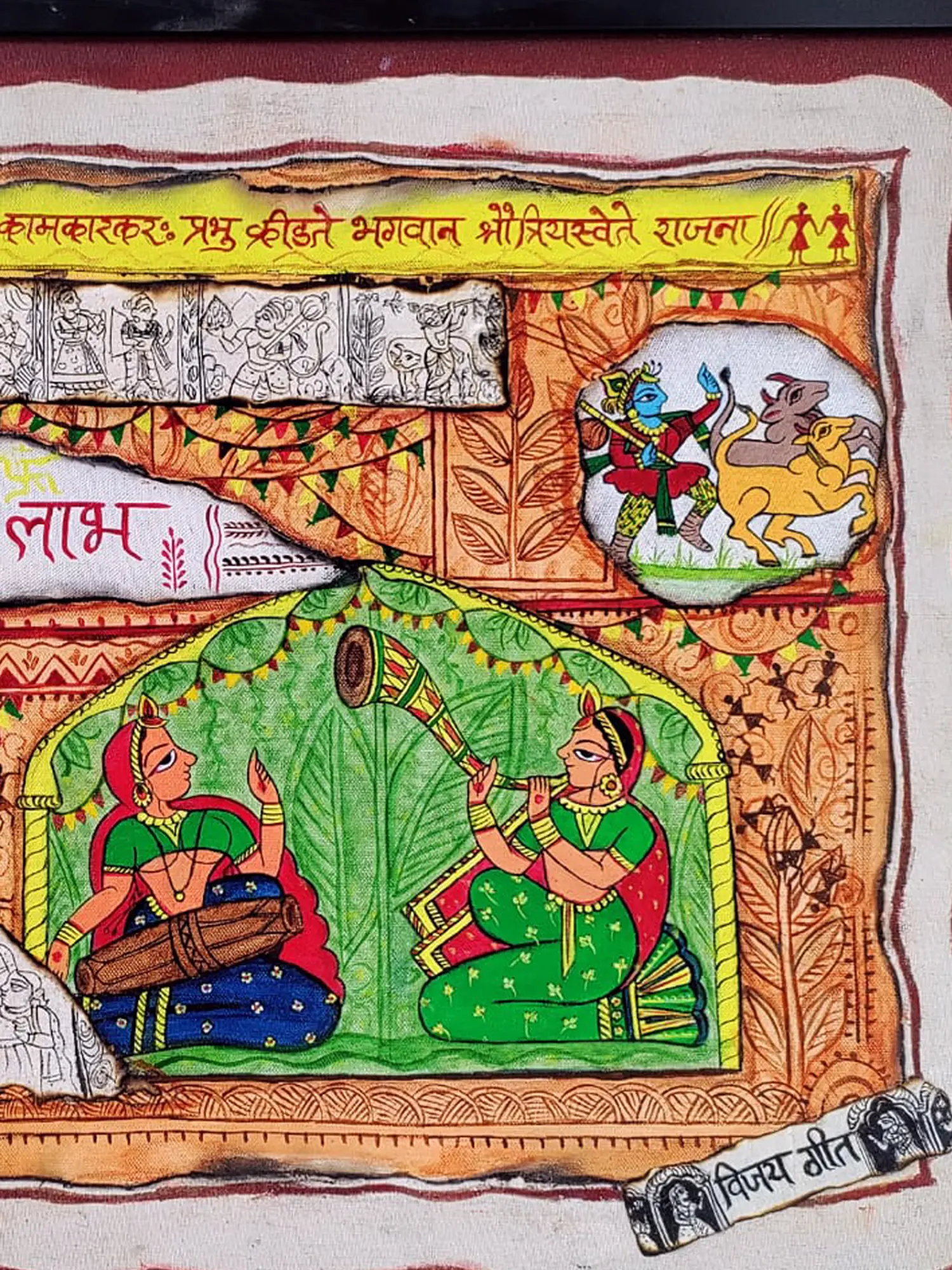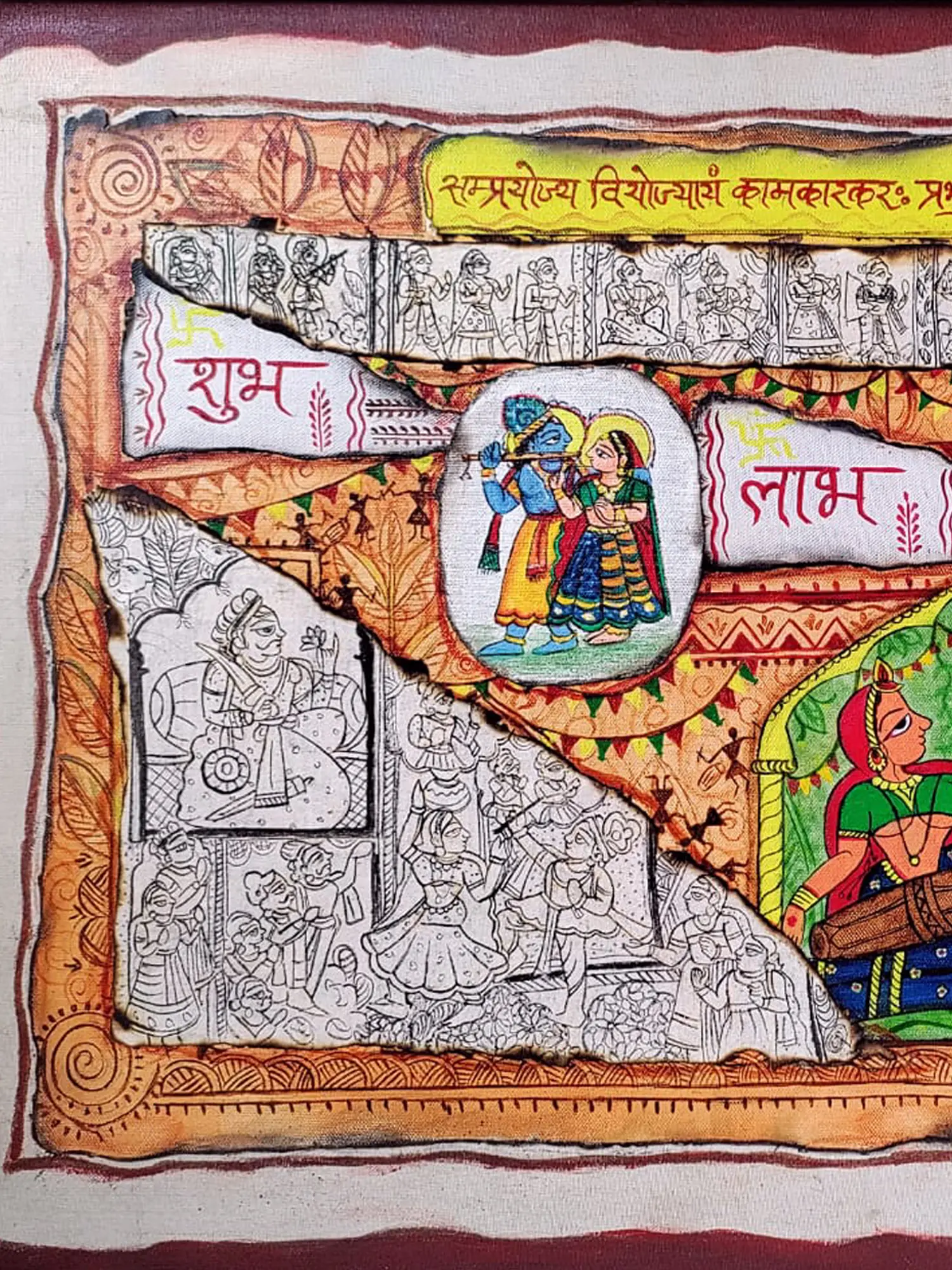 Drawing inspiration from the rich mythology of Hindu culture, this creation features depictions of Lord Krishna and Radha, a timeless symbol of divine love. The inclusion of motifs signifying prosperity and good fortune, such as "Shubh" and "Laabh," places this work firmly within a tradition of auspicious art intended to bring blessings. You'll find a profound connection to ancient narratives and cultural significance within its visual language.