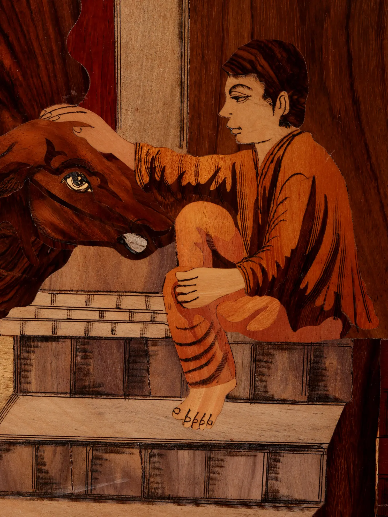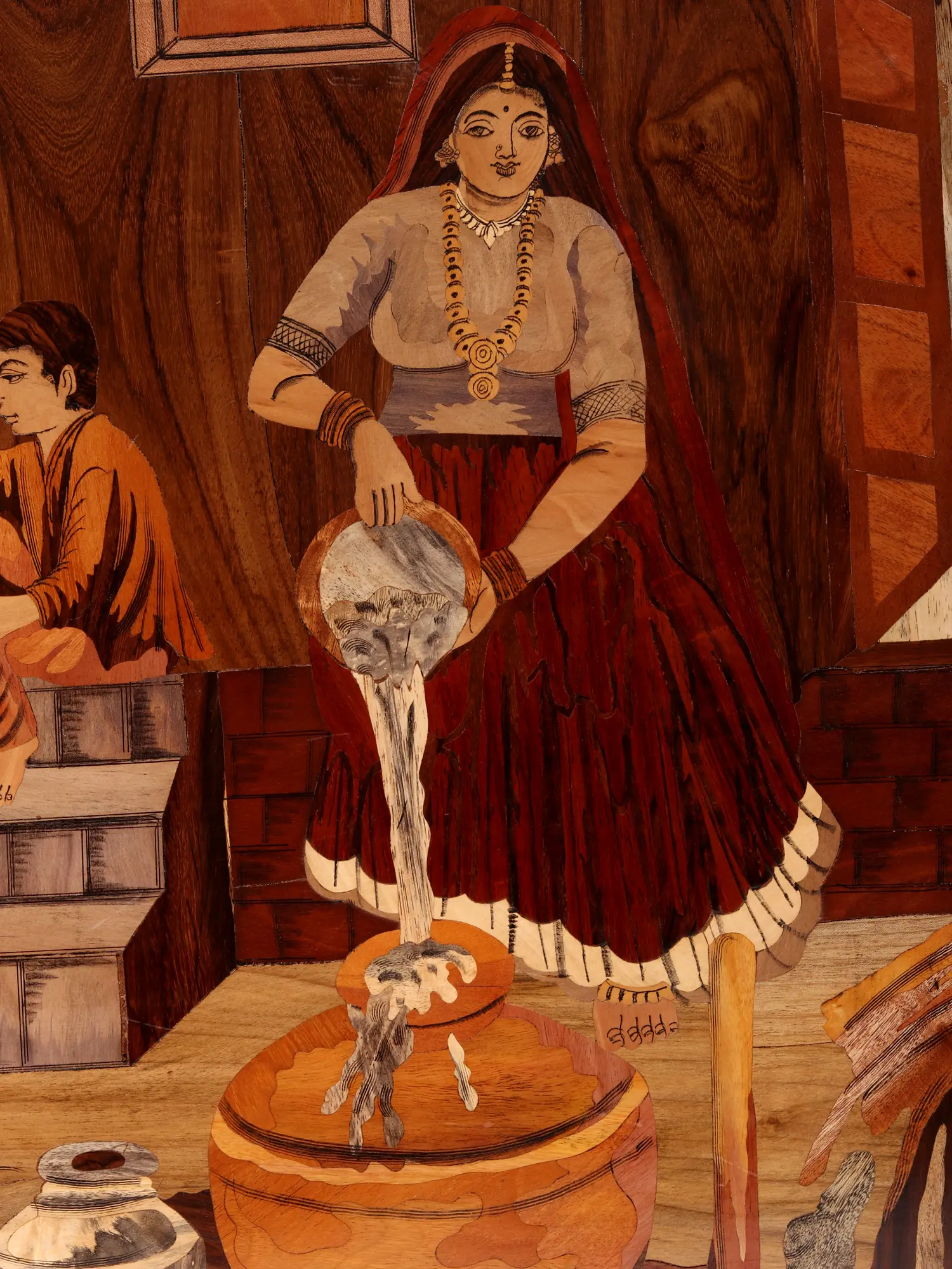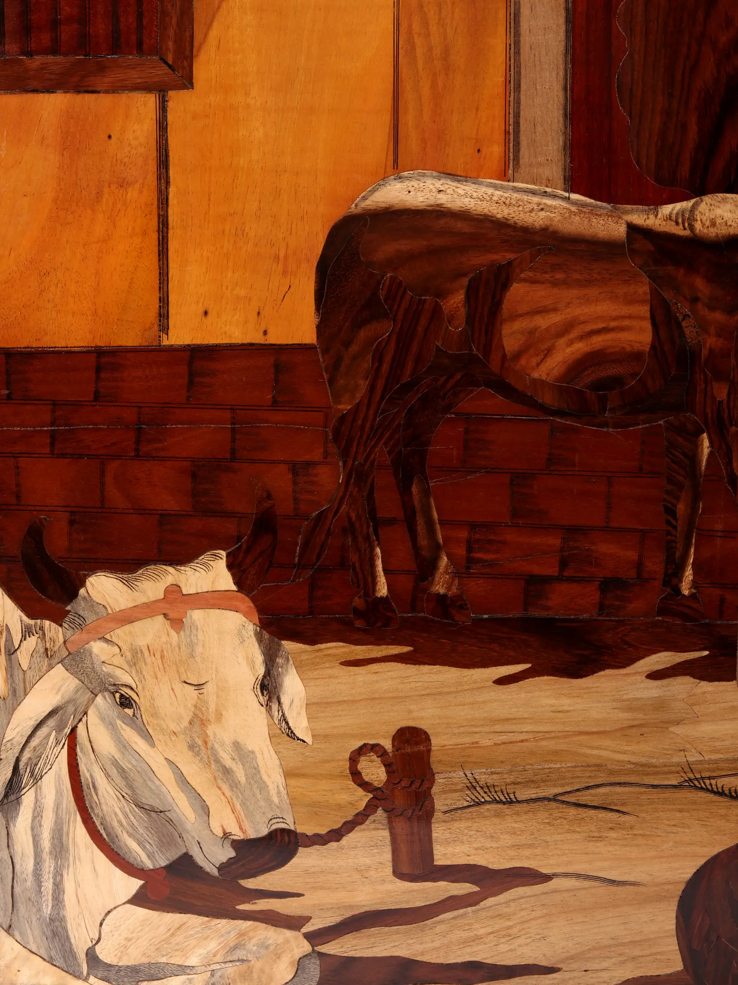 Immerse yourself in the idyllic charm of a traditional village scene, meticulously crafted using the ancient art of Mysore wood inlay. This piece captures a moment of everyday life, radiating warmth and a sense of peaceful simplicity. The natural hues of the wood bring the scene to life, depicting a woman pouring water, a young boy seated near a cow, and the subtle details of rural architecture. It's a glimpse into a world where life moves at a gentler pace, where the connection to nature and family is paramount. The scene feels authentic, inviting reflection on the values of community and simple living. The artist has paid great attention to capturing the serene and peaceful character of such a place.