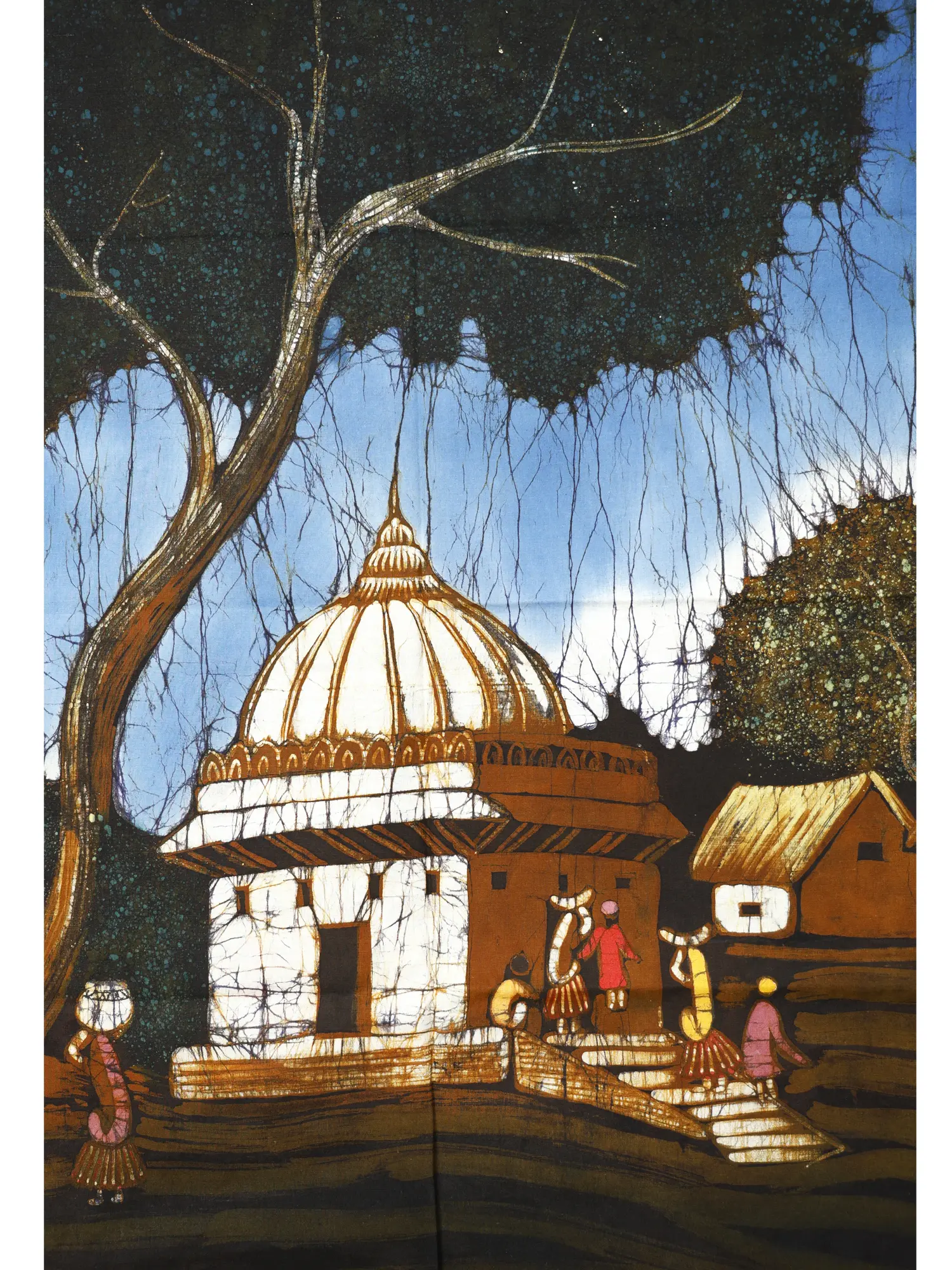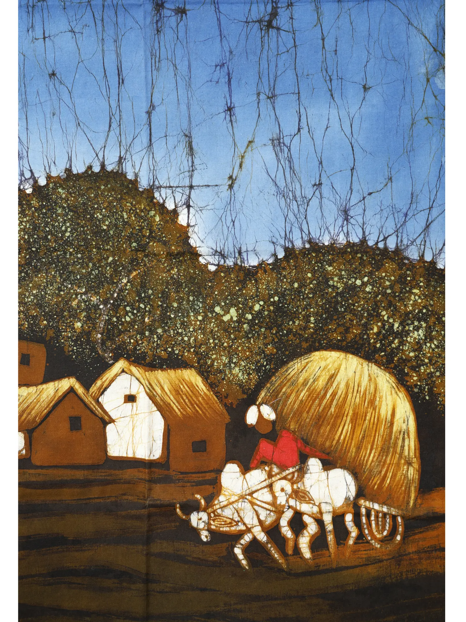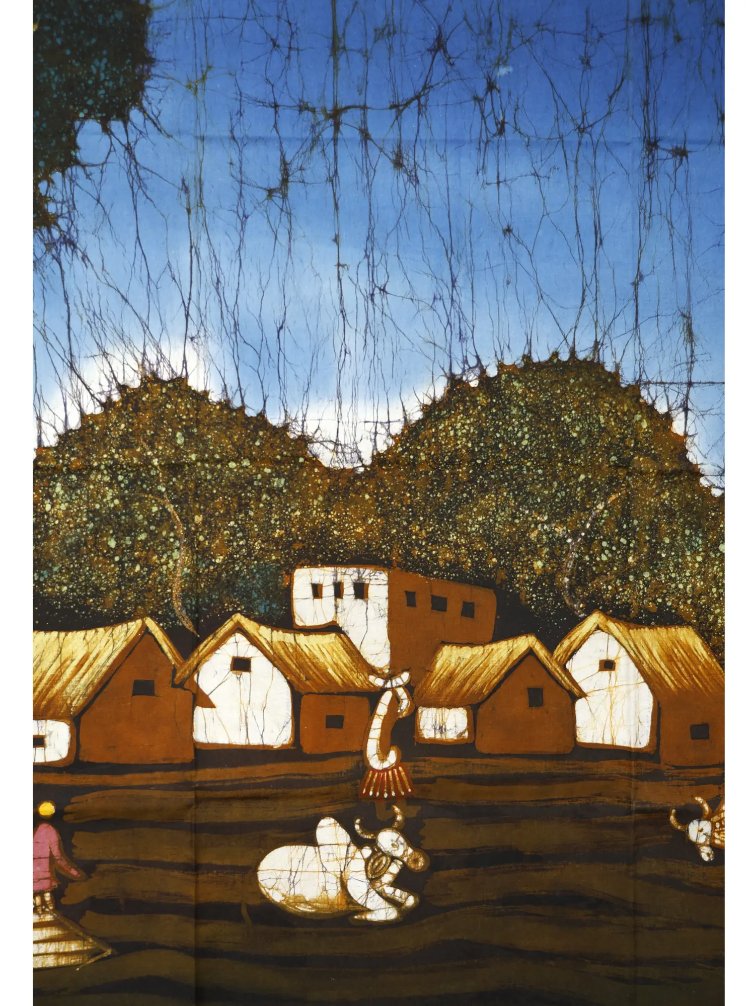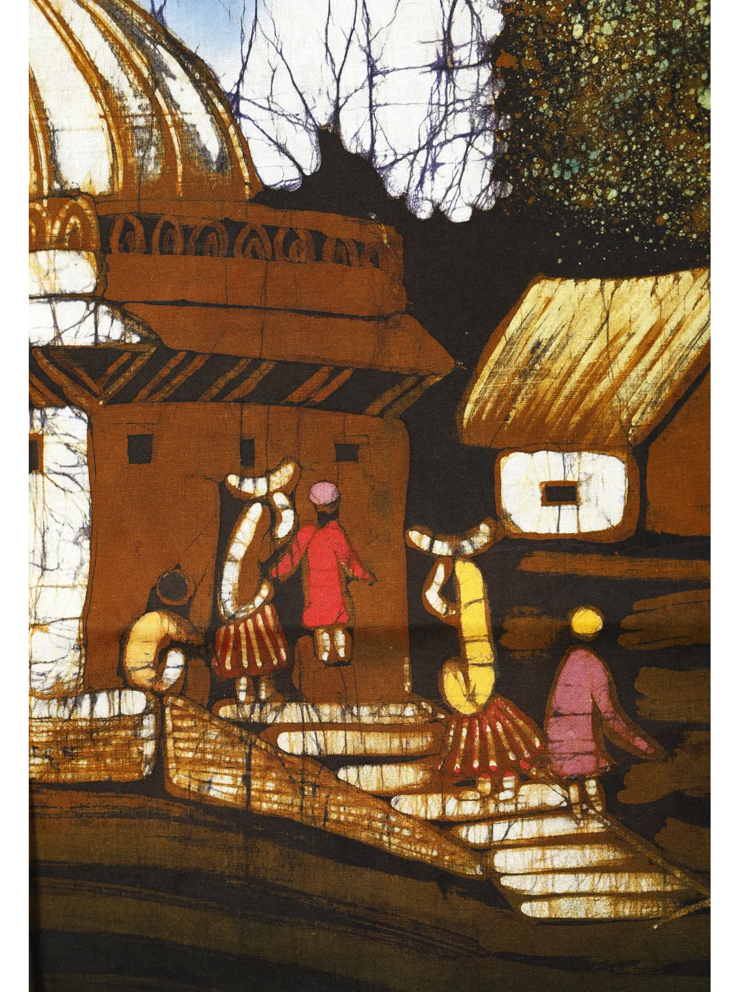 This Village Scene Batik Painting beautifully captures the essence of rural life, featuring a temple as the focal point. Village inhabitants engage in their daily activities around the sacred space, with farmers cultivating the land nearby. The traditional crack pattern in batik adds a cultural touch, while the use of natural tones enhances the painting's overall beauty.