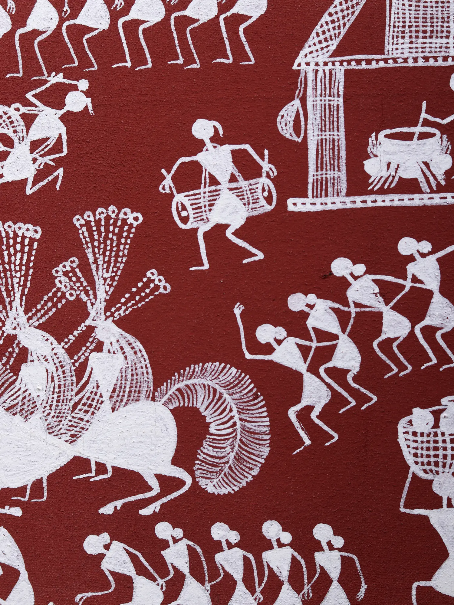 Warli art is characterized by its powerful symbolism. Circles represent the sun and the moon, while triangles are used to depict mountains and trees. These geometric forms, combined with the simple human and animal figures, create a visual narrative that's both compelling and deeply meaningful. The dynamic composition, with its many moving figures, captures the energy and vibrancy of a thriving community. The use of the earthy red background and stark white figures creates a beautiful contrast, reflecting the harmonious relationship between the Warli people and their environment. The painting's overall aesthetic exudes peacefulness, representing the community's deep connection with nature and their spiritual beliefs.