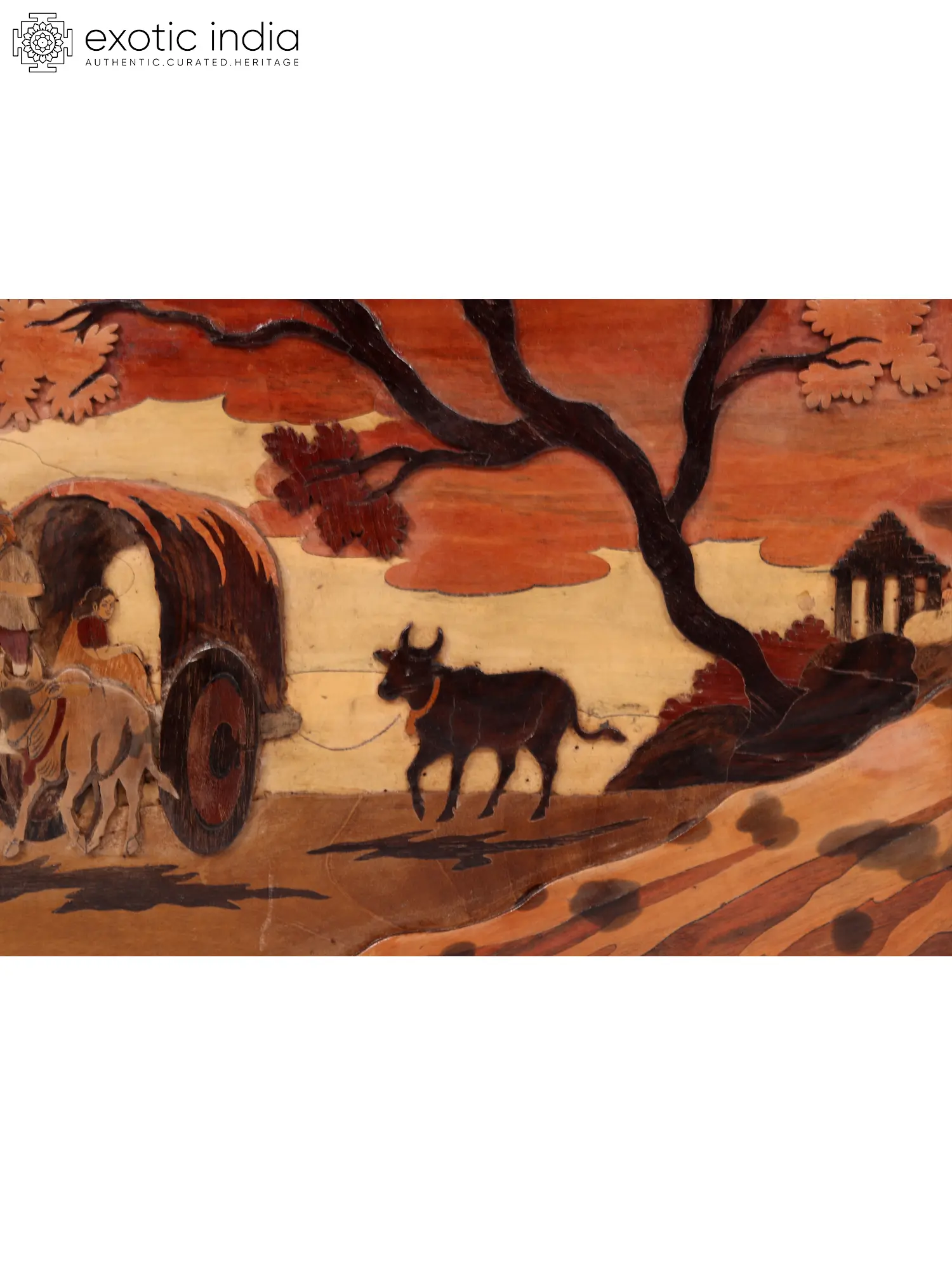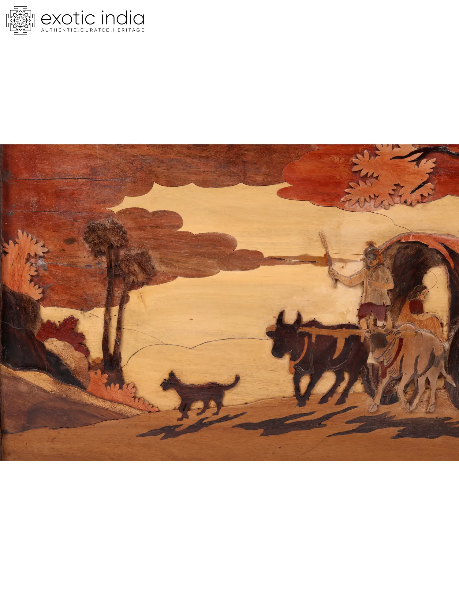 The scene unfolds across a generous canvas, measuring 13.5 inches in height and 26.5 inches in width, with a subtle depth of 1.25 inches that adds to its tactile presence. You'll notice the masterful use of natural wood tones, ranging from warm earth hues to rich, amber shades, creating a harmonious palette. The composition draws your eye to a central procession, where a cart, pulled by sturdy bullocks, carries its occupants through a stylized landscape. A watchful dog trots ahead, completing the idyllic tableau.