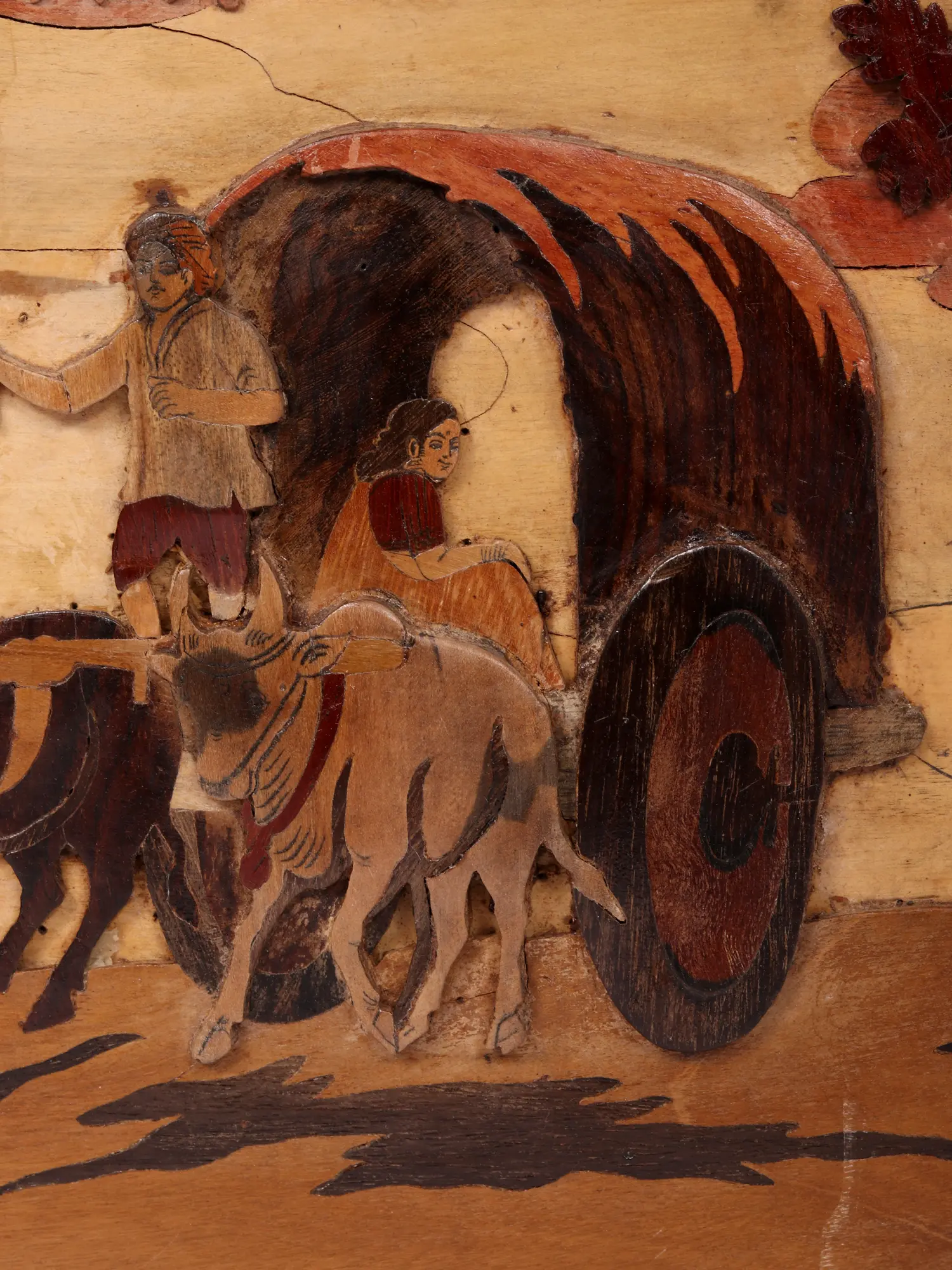 Villager Riding Bullock Cart | 3D Wood Panel with Inlay Work