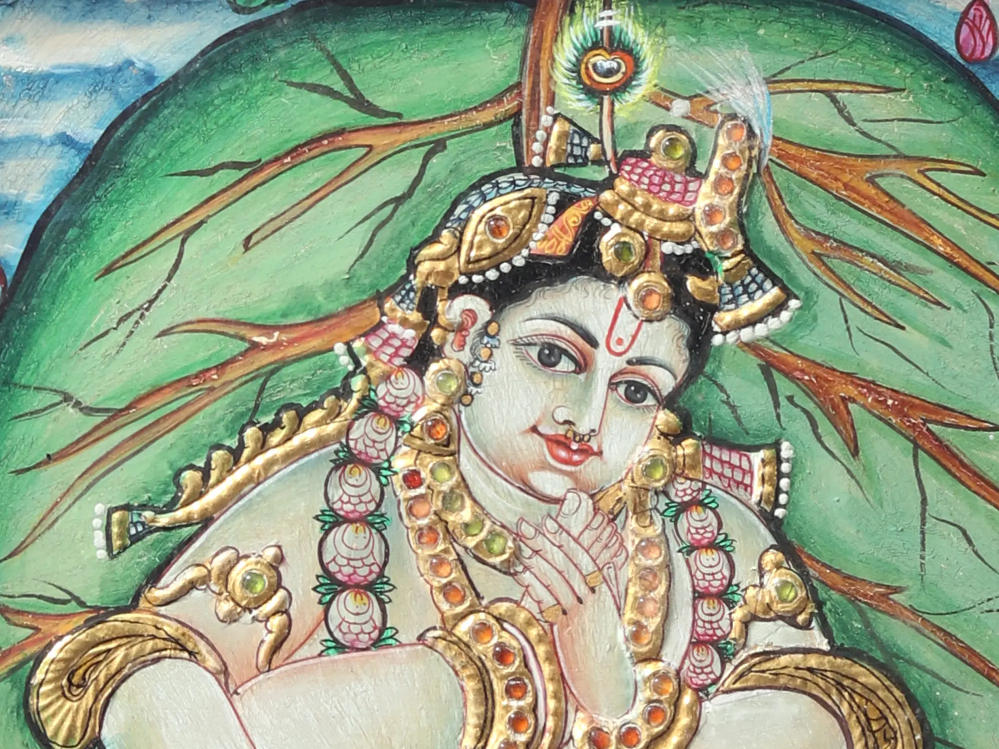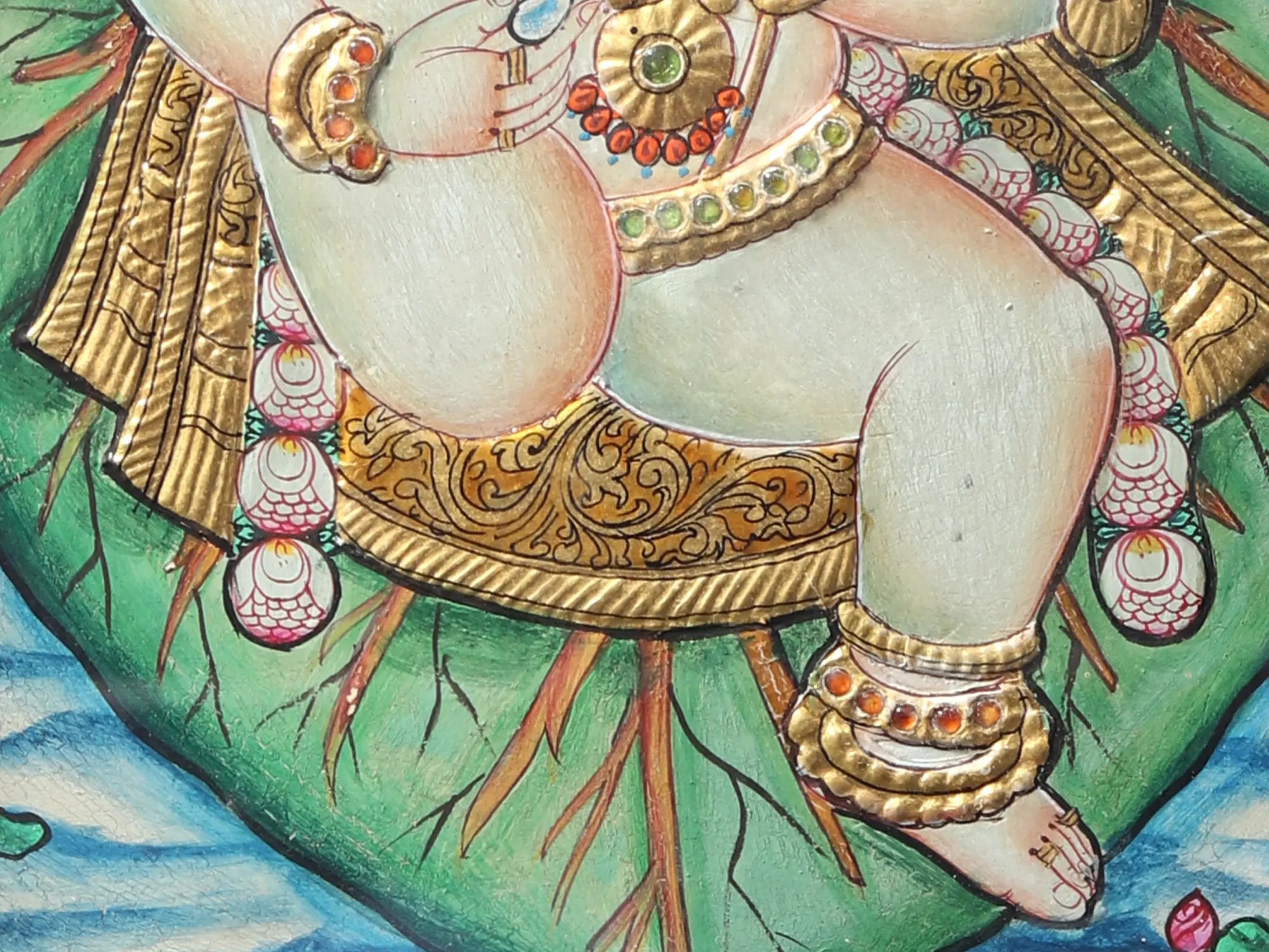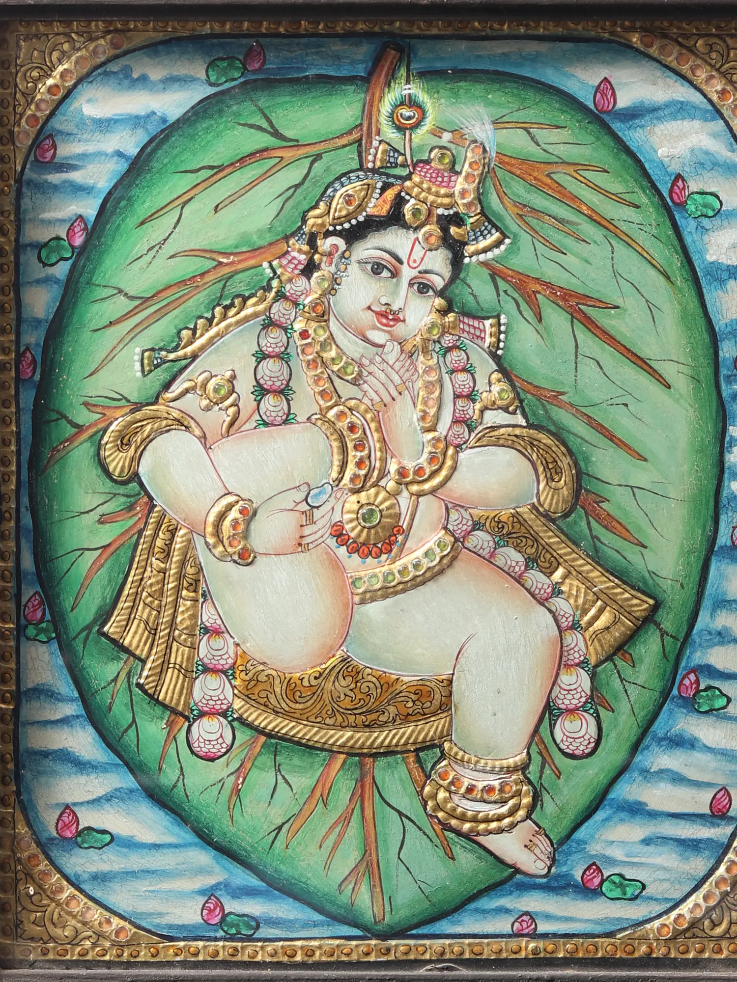 Seen in his Bala roopa\avatar - Krishna who’s the son of Devki and Vasudeva and brought up by Yashoda is presented laid on a ficus\Banyan leaf, holding his foot upto the mouth to suck on his little toe. Aila Kannan, as we know this form of Krishna is mentioned in the Markandeya Purana while some tales interpret the imagery to be the first form of human life as arriving from the higher heavens. Floating on waves, surrounded by buds of Lotus - Krishna is beautifully decked in jewelry, complimented by a Mor Pankha in this traditional Tanjore piece in a Teakwood frame.