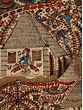 The central focus of this particular Pachedi depicts the goddess Visat Mata, a revered figure in the region, possibly riding a chariot drawn by oxen. She is surrounded by the everyday life of the village—villagers going about their daily routines, participating in ceremonies, engaging in trade, and enjoying their simple lives. The artwork includes scenes of farming, animal husbandry, and village gatherings. The lively colors and intricate details capture the energy and vibrancy of rural life in Gujarat. Observe the detailed depictions of the houses, the lush greenery, the oxen, and the individual figures; each meticulously rendered to contribute to the artwork's overall storytelling prowess. This piece reflects both the spiritual and temporal lives of the people, emphasizing the close bond between the divine and the earthly realm. The inclusion of various traditional motifs, symbolic elements, and details adds to the artwork's rich cultural context.