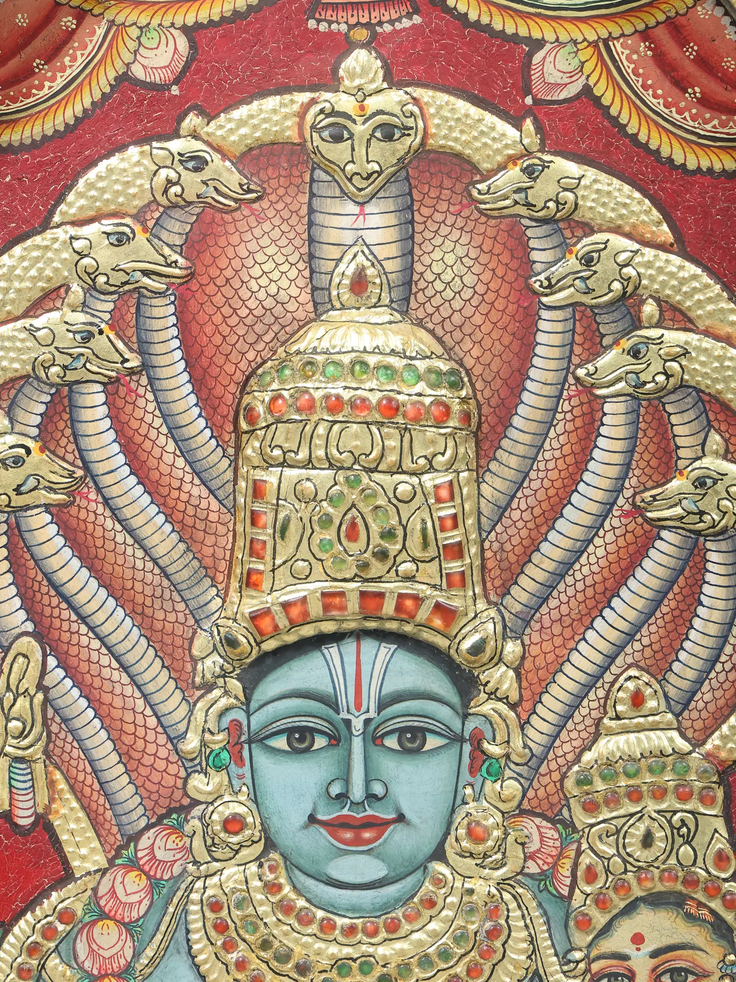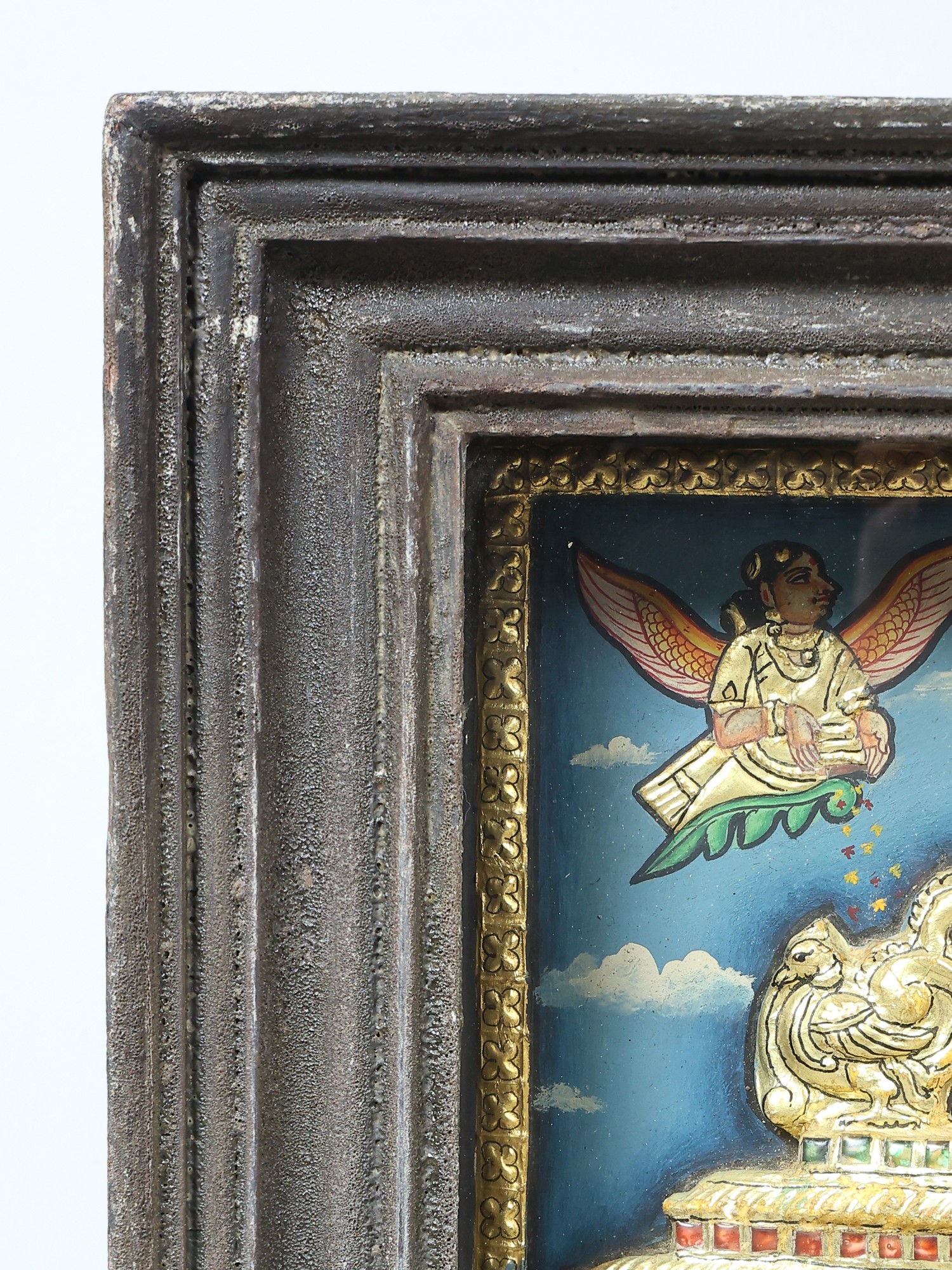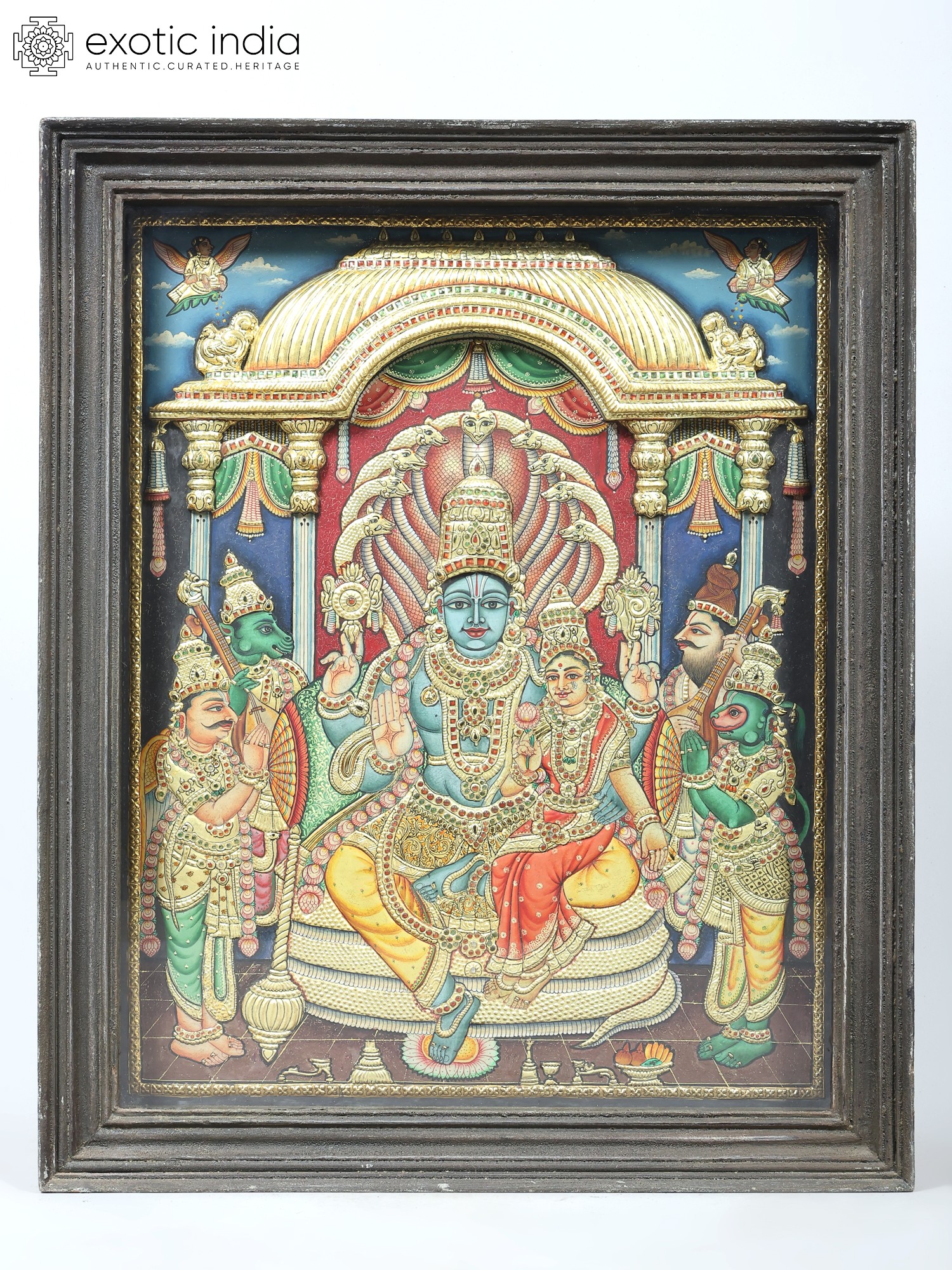 Lord Narasimha Seated on Sheshnag Throne with Goddess Lakshmi | Traditional Colors with 24 Karat Gold | Tanjore Painting with Frame
