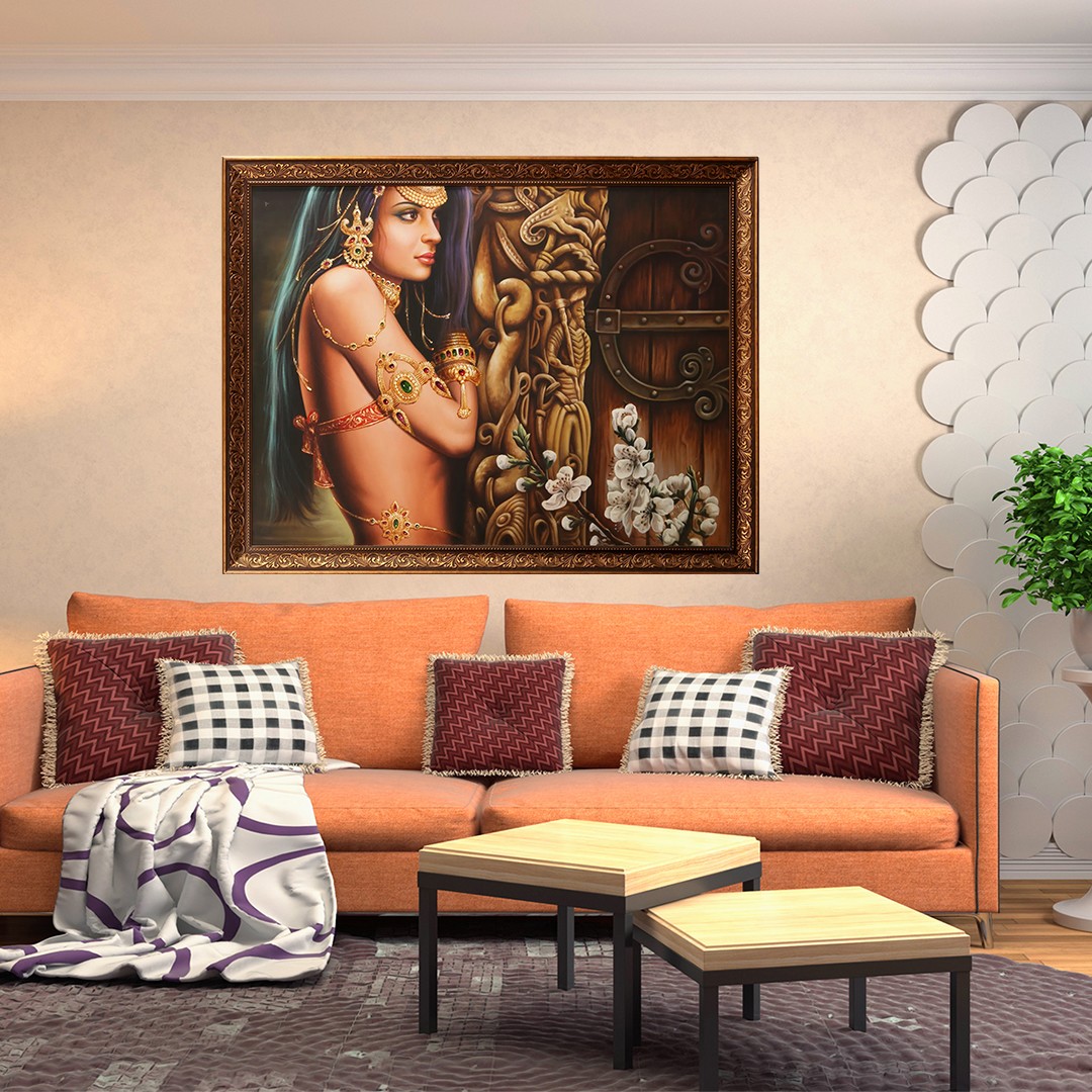 Waiting by the door, bedecked enchantingly from head to toe, the moon-faced heroine of this oil on canvas painting reminds one of the Vasaksajja Nayika- one of the Ashta Nayikas, who is a woman beautifully dressed up for her union with her beloved.