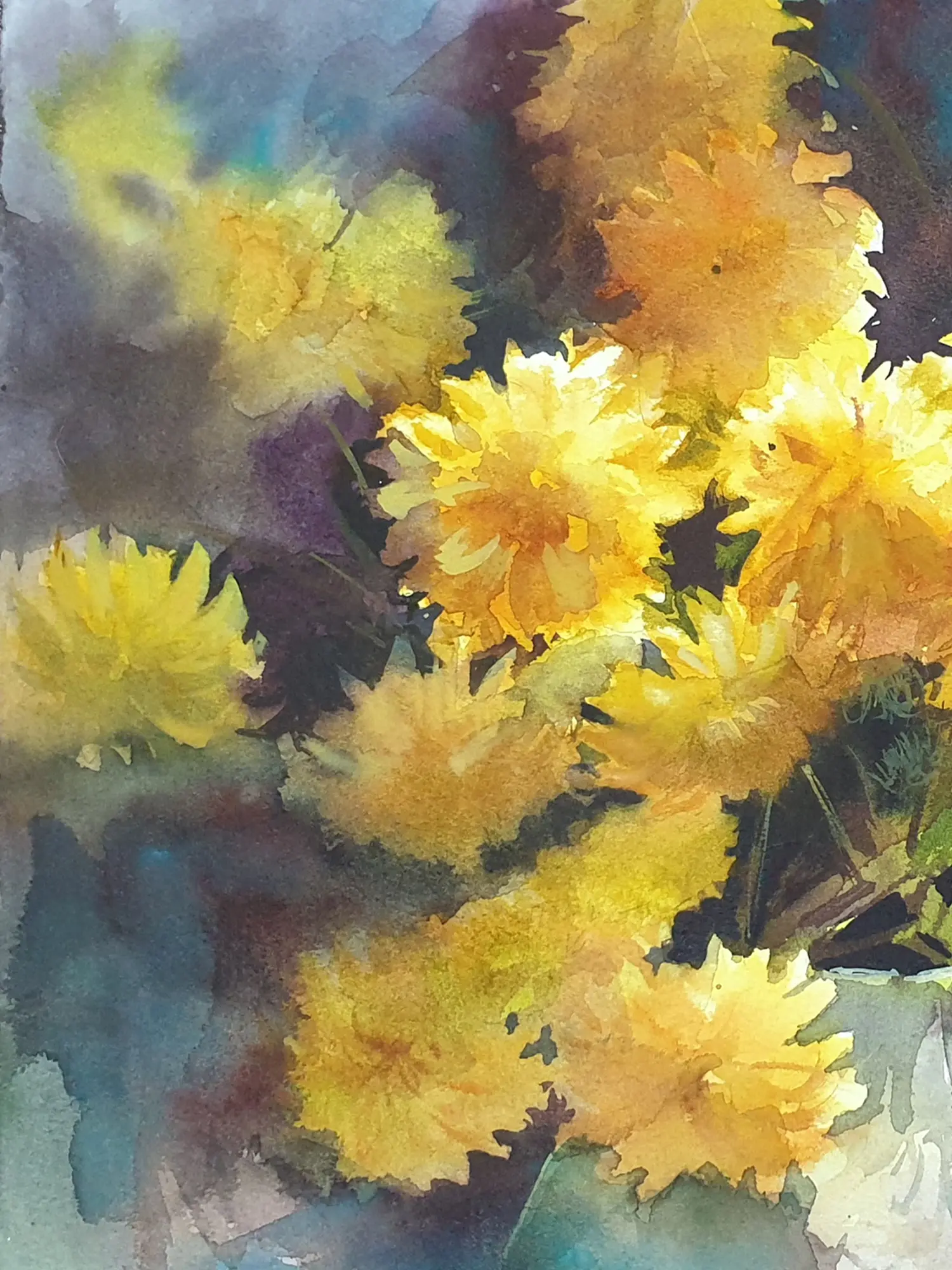 Measuring 11.00 inches in height and 15.00 inches in width, this piece offers a harmonious balance of scale and detail. The interplay of vibrant yellows against a moody, atmospheric background creates a captivating focal point. You'll notice how the artist employs a loose, expressive style, allowing the colors to bleed and blend organically, enhancing the feeling of natural growth and movement within the composition.
