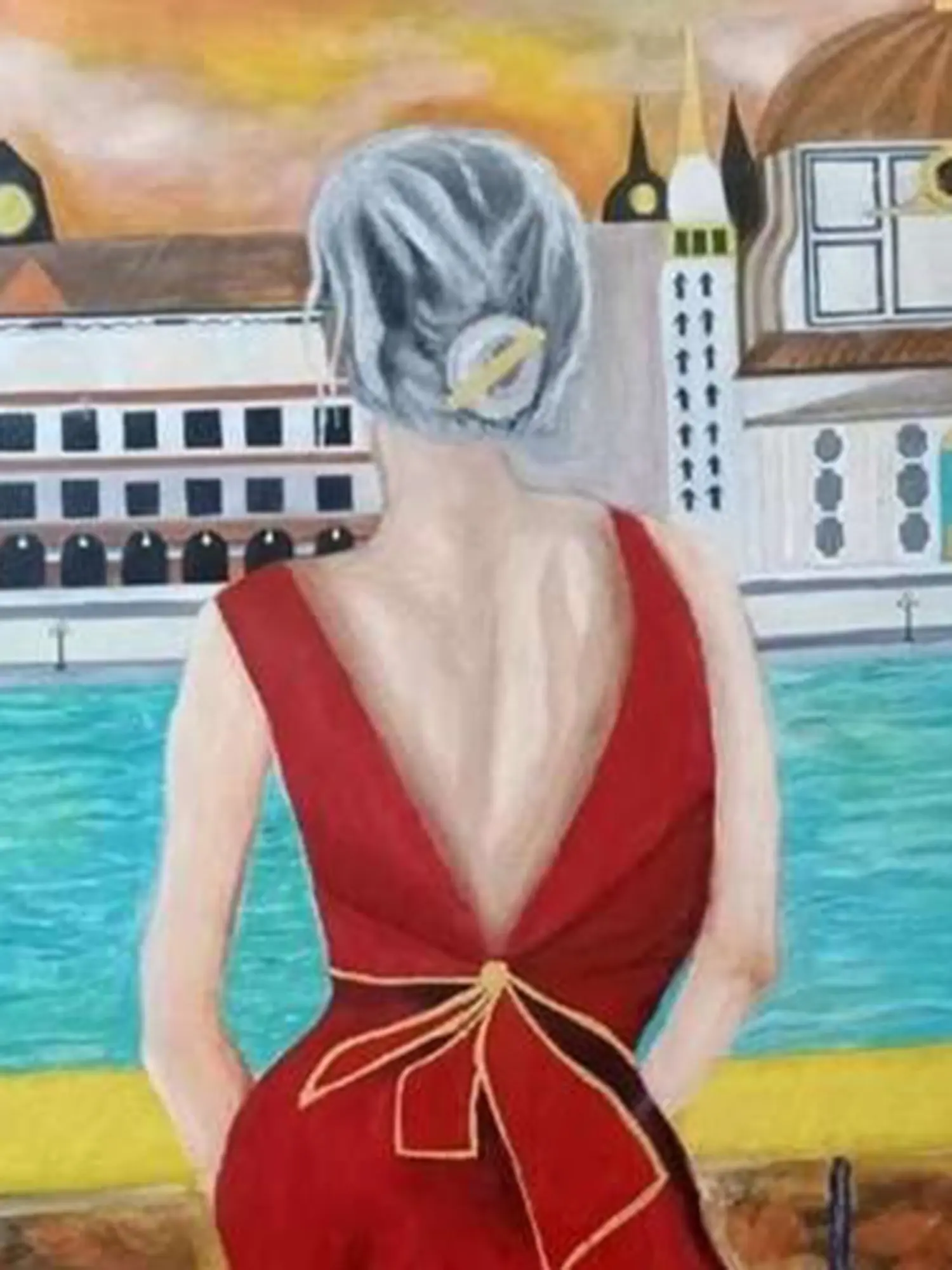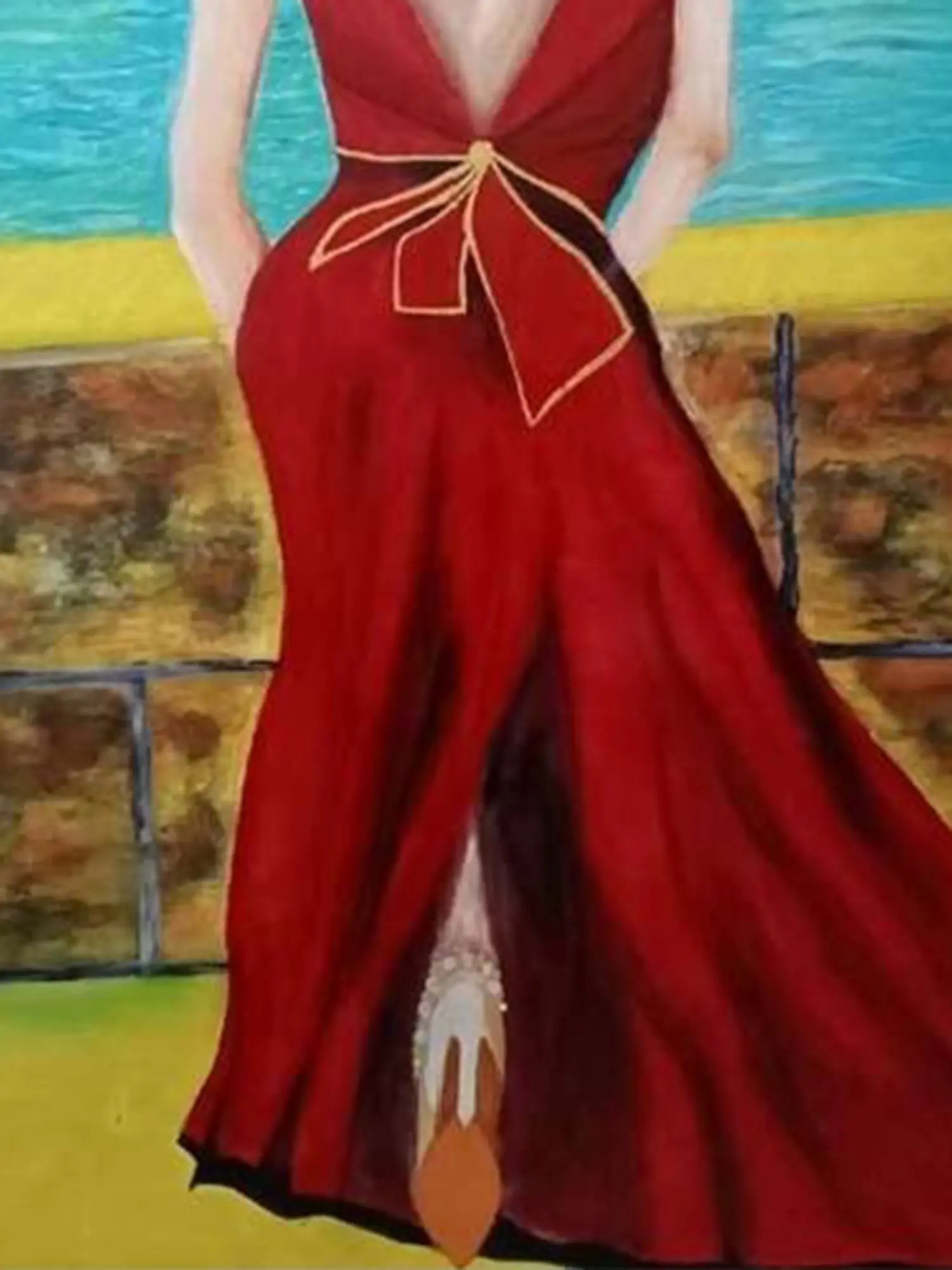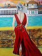 The striking silhouette of the woman, draped in a flowing crimson gown, immediately commands attention. Her posture suggests a moment of quiet introspection, her gaze directed towards a distant, elegant cityscape that hints at European charm. The interplay of light and shadow across the canvas creates a dramatic focal point, drawing your eye to the delicate bow cinching the back of her dress. This artwork is substantial, measuring 47.24 inches in height and 35.43 inches in width, allowing it to make a significant statement in any setting.