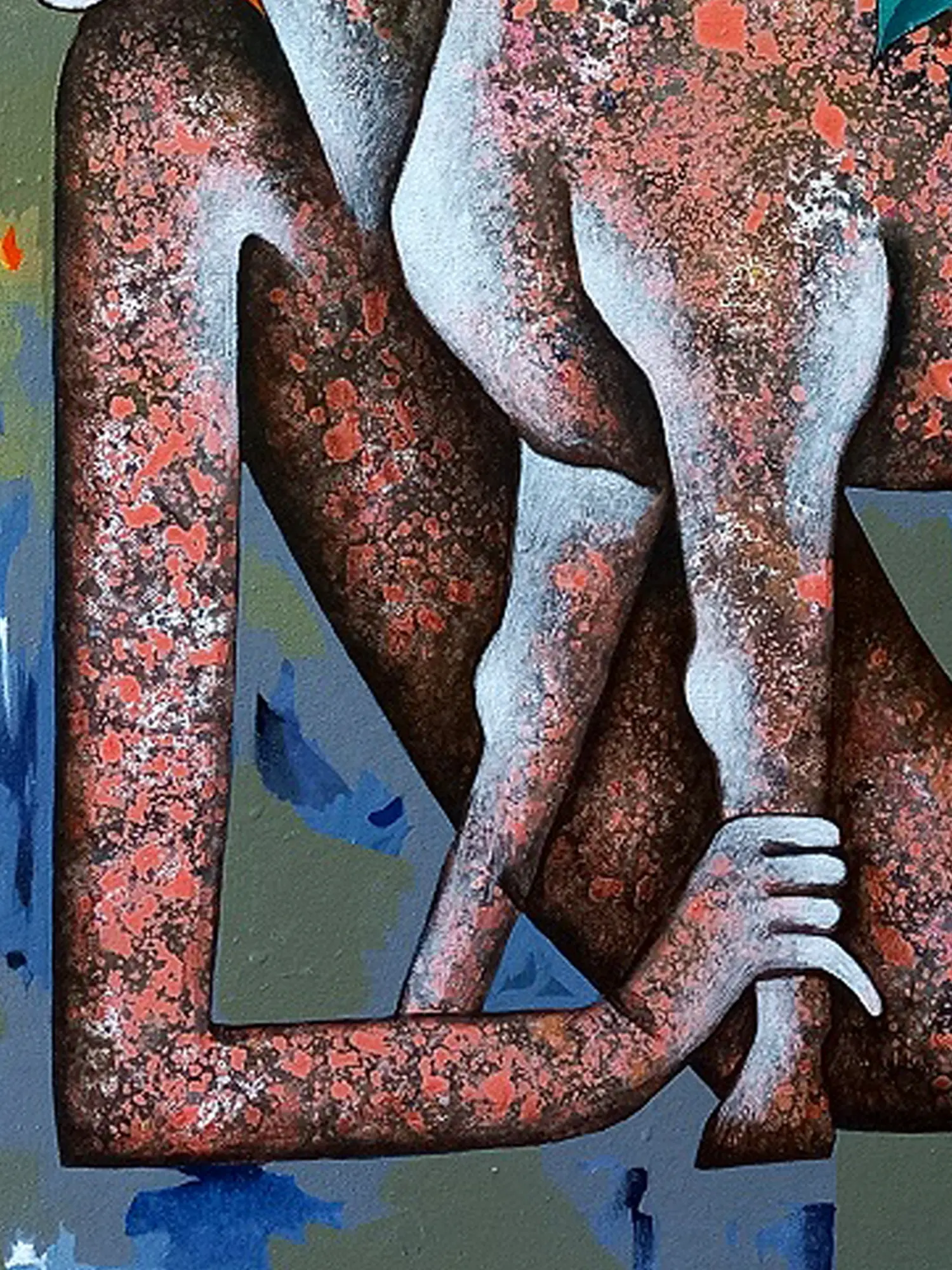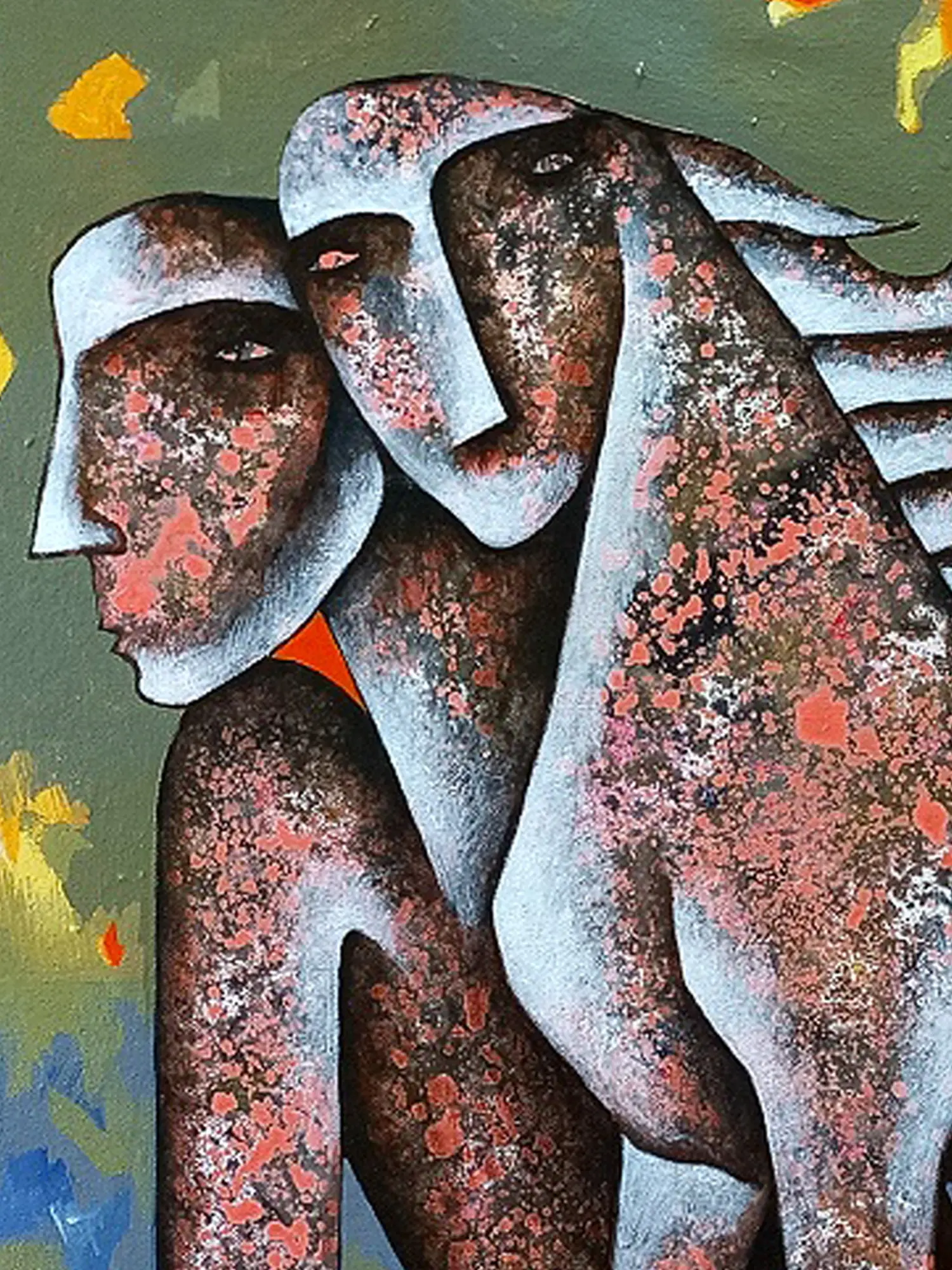 While abstract in its execution, the composition hints at universal archetypes and the fundamental forces of existence. You might discern echoes of ancient myths where strength and vulnerability, desire and conflict, are inextricably linked. The raw, expressive quality of the figures, coupled with the symbolic elements, invites personal interpretation and connection to deeper human narratives.