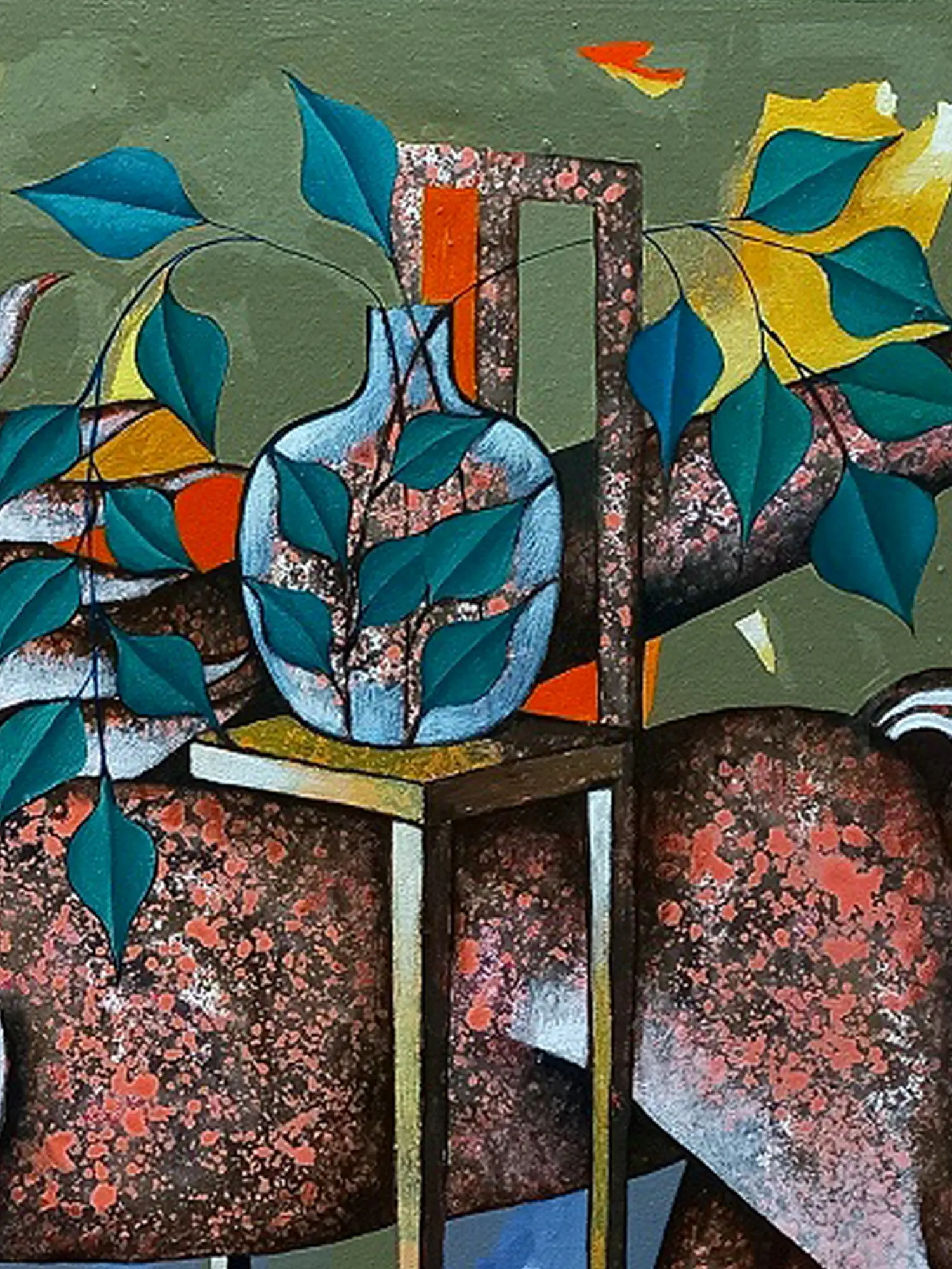 Measuring a substantial 30 by 42 inches, this piece commands attention without overwhelming its surroundings. The interplay of figures, rendered with a blend of stark simplicity and nuanced texture, draws the eye across the canvas. Notice how the artist uses bold lines and contrasting colors to define form, while a subtle speckling effect adds a unique, almost organic quality. The inclusion of elements like the delicate leaves and the contemplative vase suggests a dialogue between the tangible and the ephemeral.