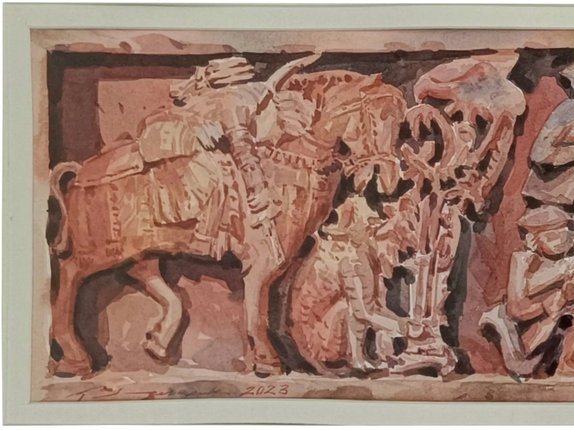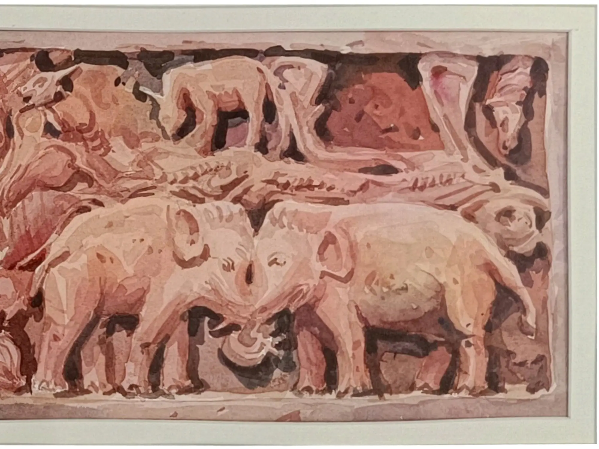 Experience the exquisite craftsmanship of Mainak Bhowmick, who translates the tactile depth of sculpture into the ethereal beauty of watercolor on paper. Each element is meticulously rendered, revealing an understanding of form, shadow, and texture that transcends traditional painting. You will appreciate the layered washes and subtle tonal variations that give the figures and animals a palpable presence, as if they were carved from stone.