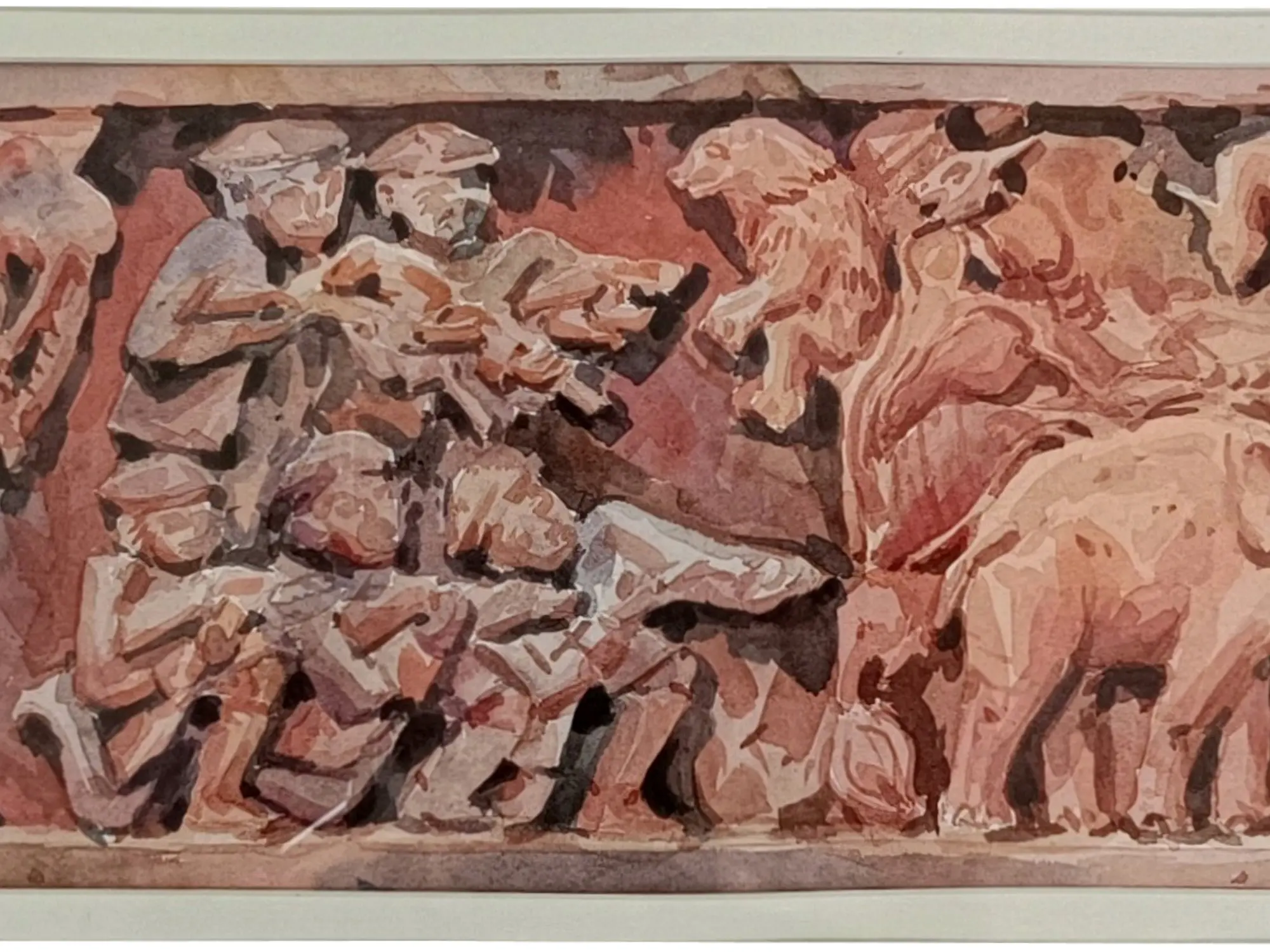 Immerse yourself in a dramatic narrative captured with masterful brushstrokes. You'll be drawn into a scene depicting the intensity of conflict, rendered with a remarkable ability to convey form and movement through the delicate medium of watercolor. This evocative work invites contemplation of history and the enduring spirit of human endeavor.