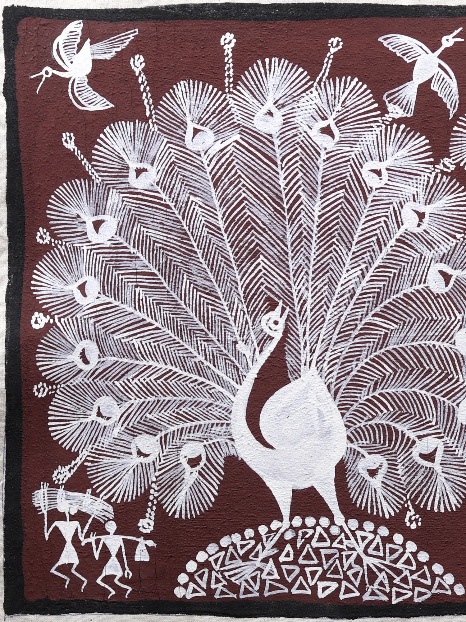 Observe the dynamic composition that unfolds across the 9.7-inch height and 16.7-inch width of the cotton. Majestic peacocks with fanned tails stand regally amidst a flurry of activity, their white forms outlined against the deep hue of the canvas. Human figures, rendered in characteristic Warli style, engage in communal dances and daily chores, their geometric simplicity conveying a powerful sense of connection. Delicate depictions of trees and animals further enrich the scene, creating a harmonious tapestry of rural existence.