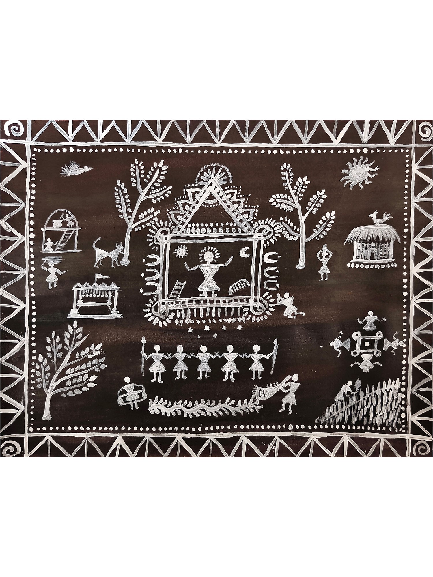 The Rural Celebration - Warli Art by Pravin Mhase | Terracotta, Cow Dung and White Acrylic