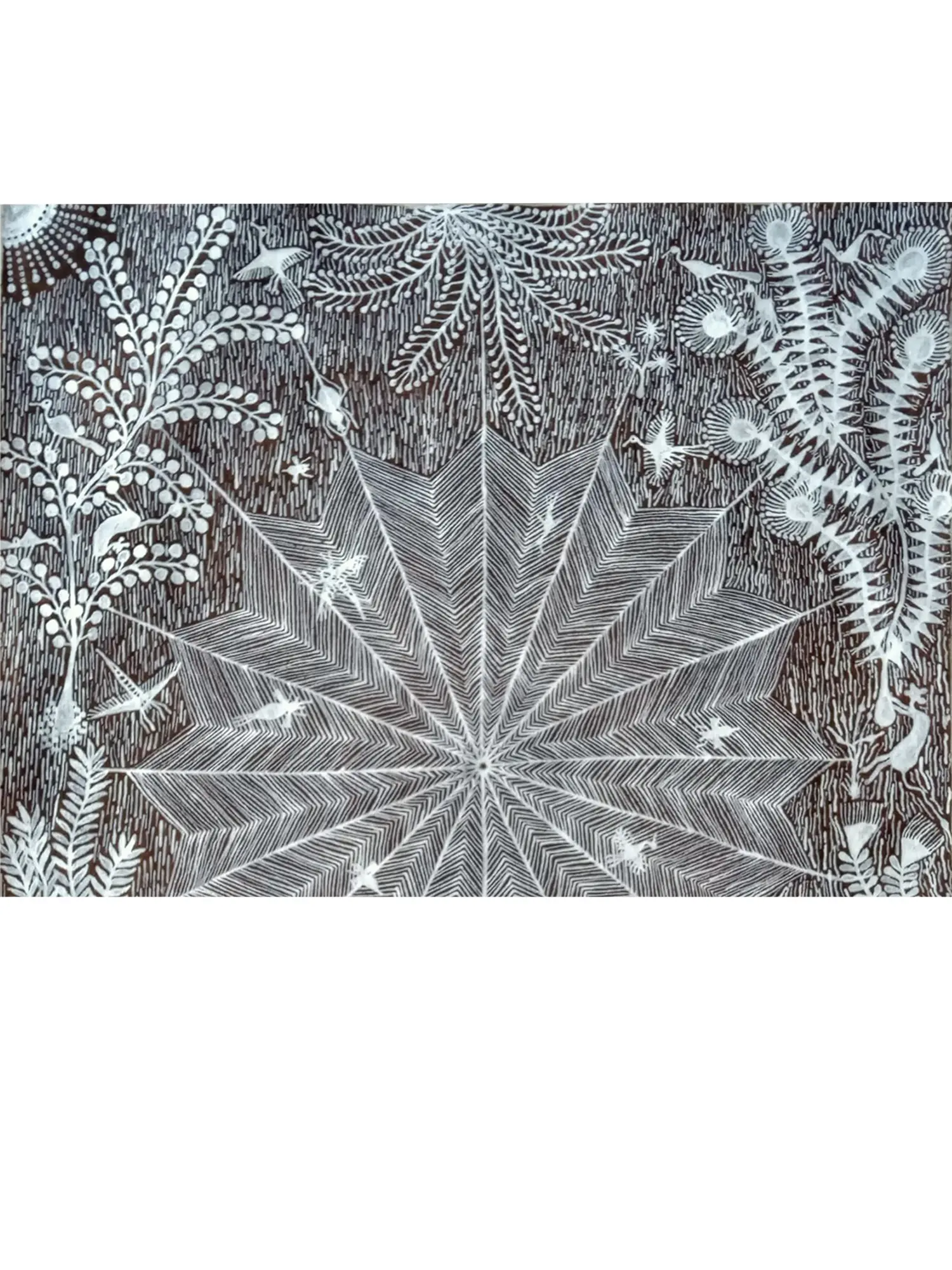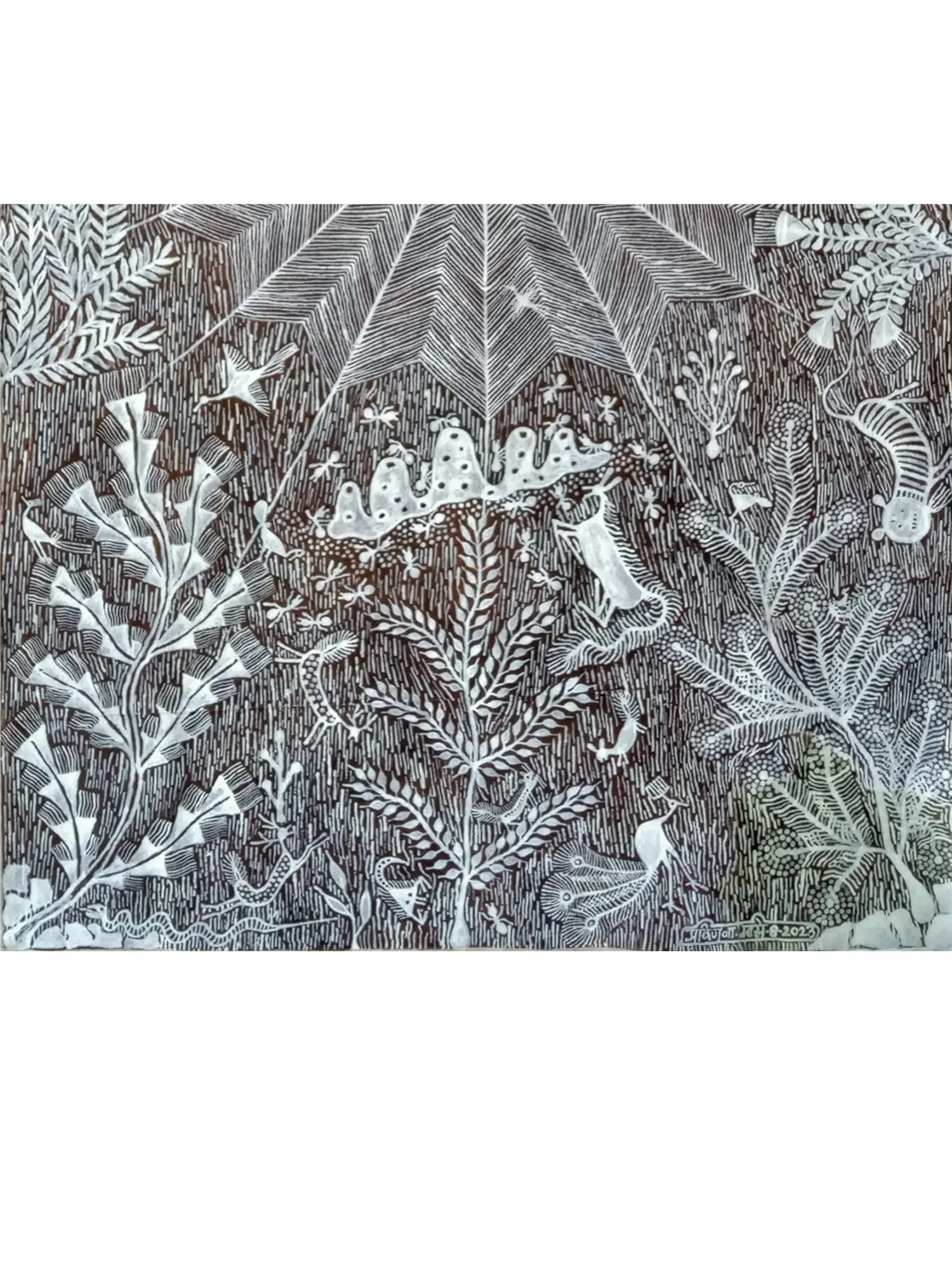 Explore the interconnectedness of all existence with our Tribal Art piece, The Web of Life. Crafted with cow dung and acrylic on Manjarpat cloth, this mesmerizing artwork celebrates the tapestry of life. From the delicate balance of nature to the bonds of community, each element weaves together to form a vibrant tableau of existence. Inspired by tribal wisdom, the painting invites contemplation on the interdependence of all living beings.