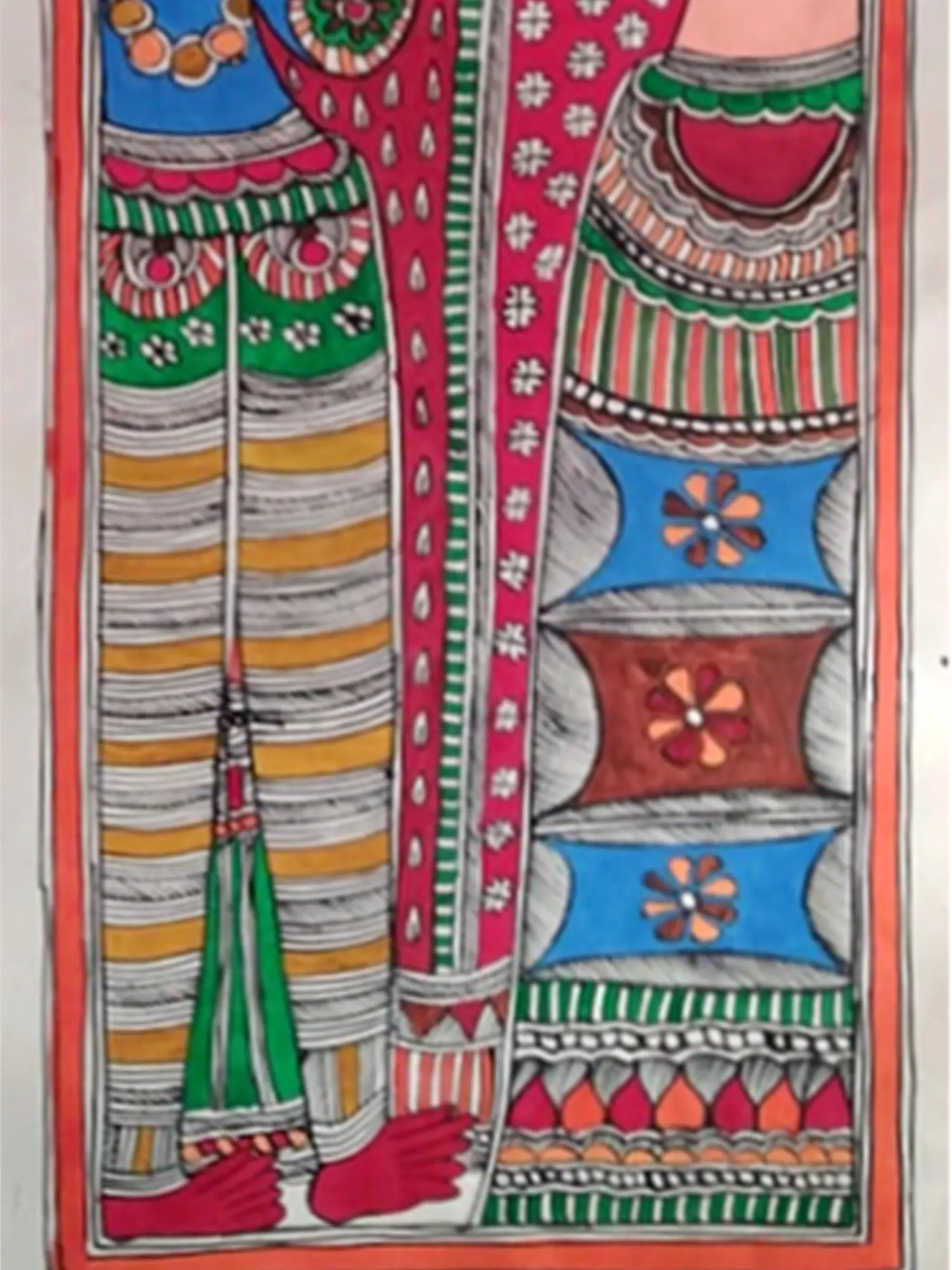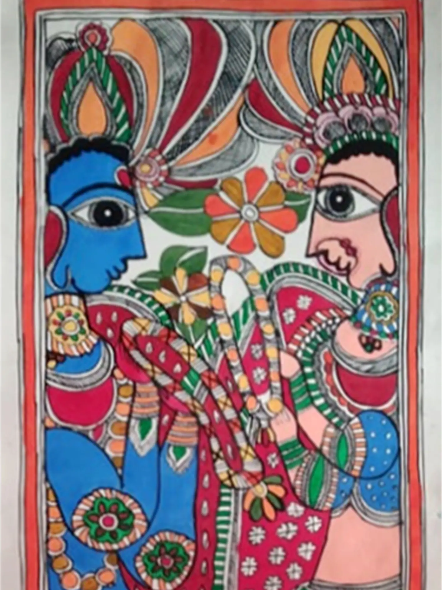 Archana Jha's painting, "Wedding of Lord Ram and Sita," crafted with natural colors on handmade paper, beautifully attributes to this belief and culture. The artwork, adorned with traditional elements, not only honors the sacred union but also reflects the cultural significance of Mithila, encapsulating the essence of familial ties and regional pride in its portrayal.