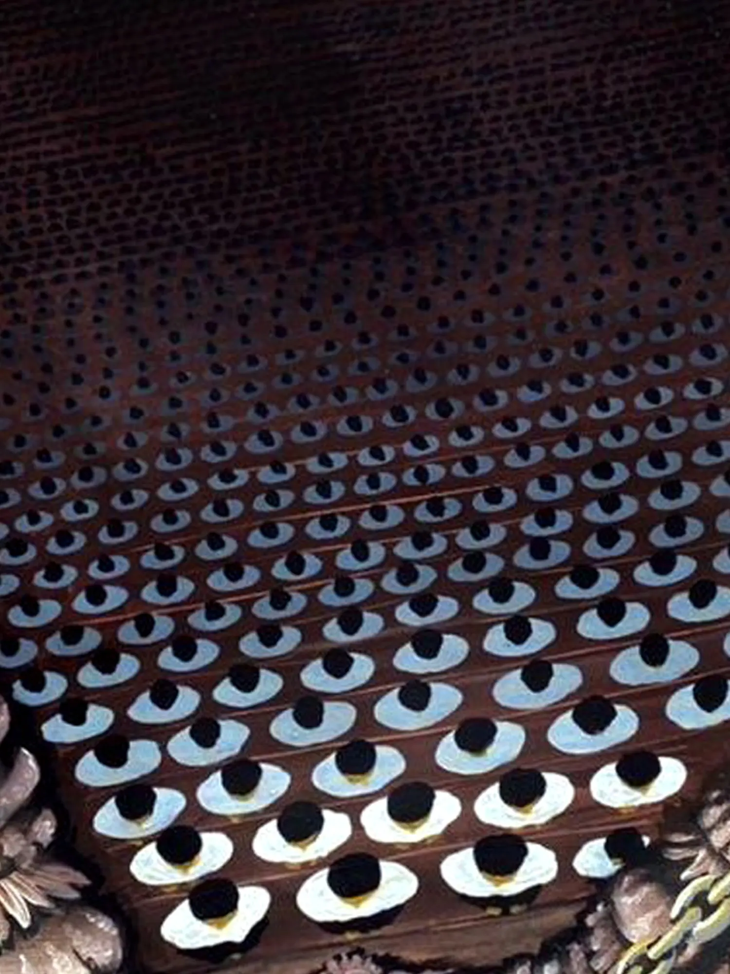 The sheer verticality of this composition, measuring 72 inches in height and 24 inches in width, commands attention and draws the viewer into its unfolding story. Above, a celestial panorama unfolds with Saturn and its rings suspended amidst a star-dusted void, a breathtaking testament to the boundless universe. Below, an intricately rendered architectural space, filled with watchful eyes and ancient motifs, provides a richly textured terrestrial stage for the divine encounter.