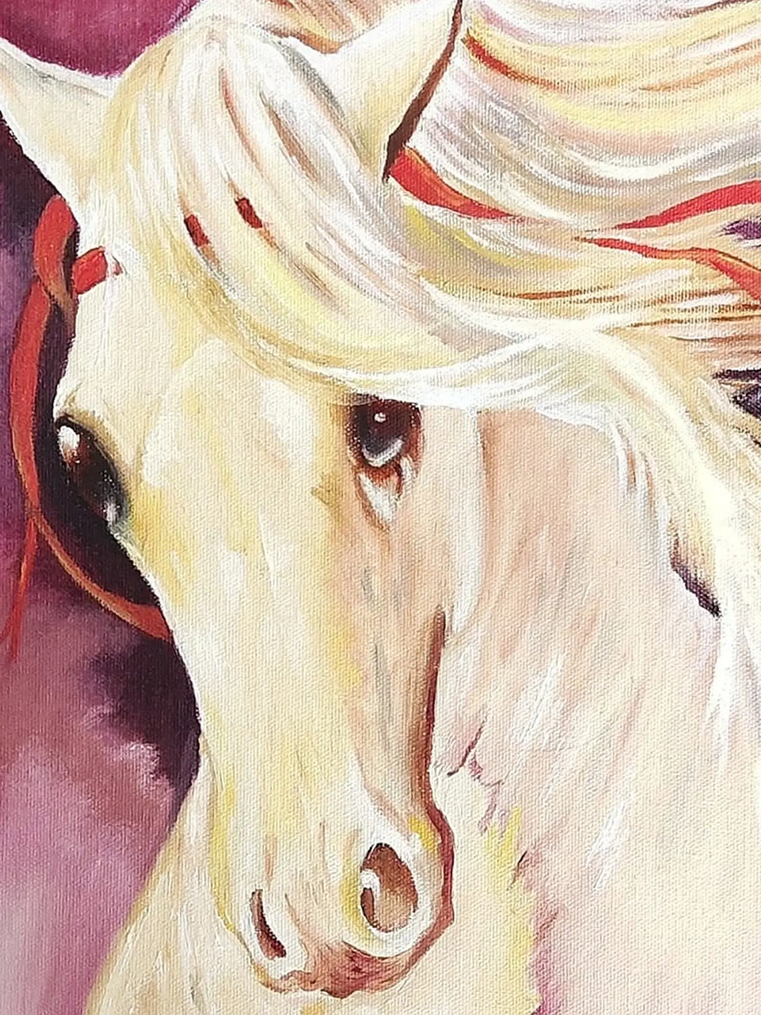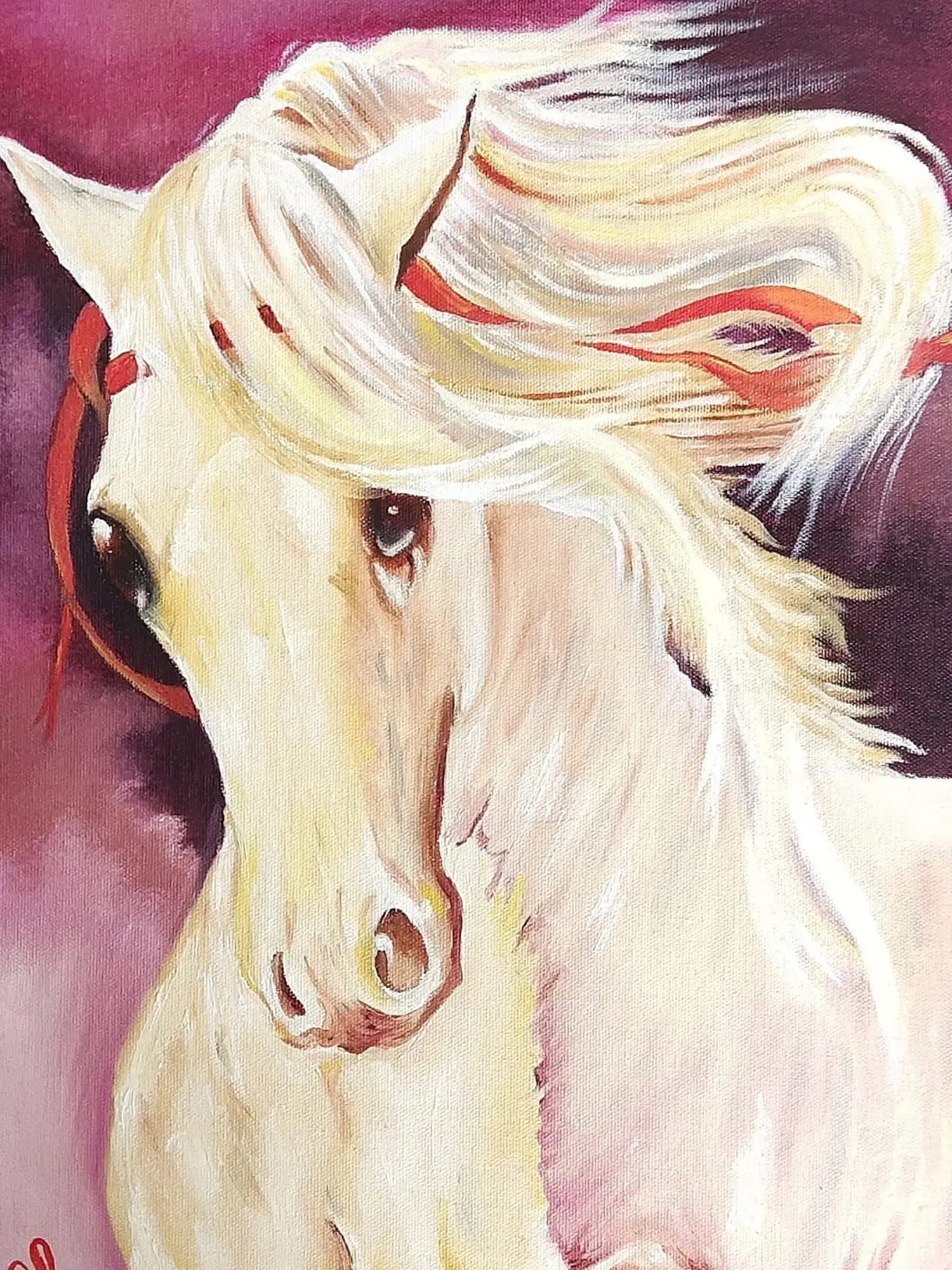 In this mesmerizing Oil on Canvas painting, a White Horse with a striking red hairband commands attention, its flowing mane resembling billowing white clouds. Against a rich purple backdrop, the contrast enhances the majestic presence of the equine subject. The artist's meticulous brushstrokes capture the essence of movement, with the horse's mane gracefully dancing in the imaginary breeze.