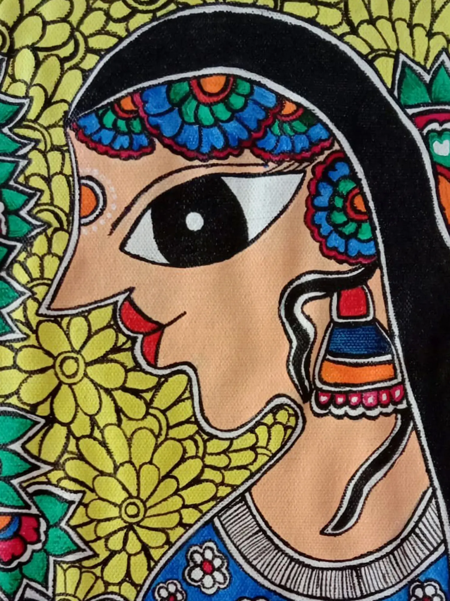 Additionally, the composition may allude to the universal theme of longing for companionship, portraying the poetic intertwining of human emotion and nature. Gupta's use of the Madhubani art style adds cultural depth to the piece, enriching it with tradition and storytelling. The painting becomes a visually compelling exploration of emotion and symbolism.