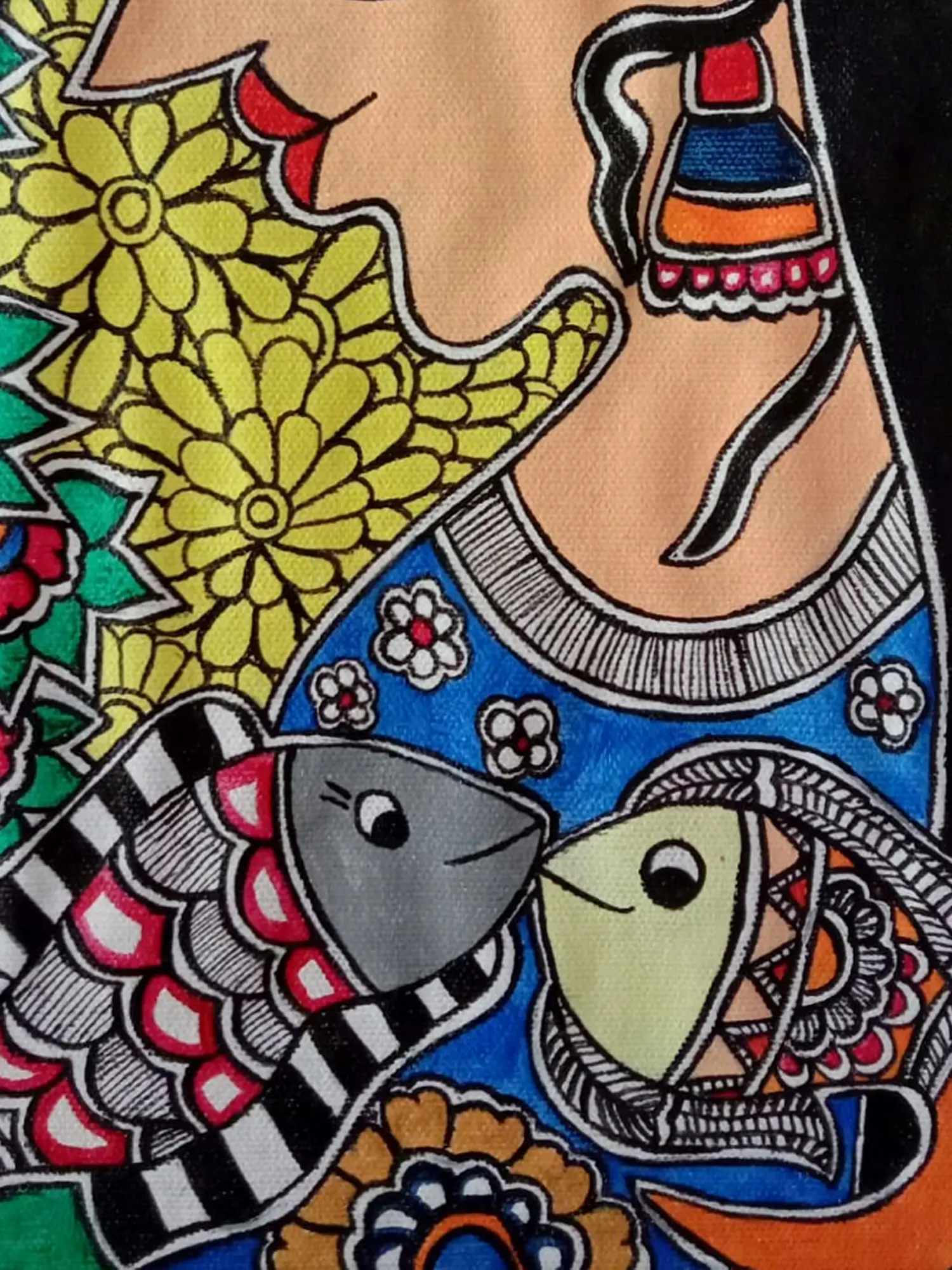 Kush Gupta's "Woman and Fishes - Madhubani Art," an acrylic on canvas without a frame, intricately weaves a symbolic narrative. The creative depiction of a woman and two fishes engaged in a tender kiss hint at multifaceted interpretations. The artwork could symbolize fertility, evoking the primal connection between life and water-dwelling creatures.