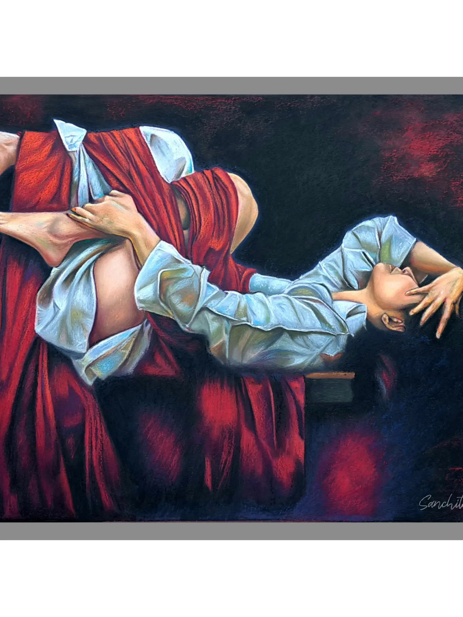 Sanchita Agrahari's artistic style is characterized by a profound understanding of the human form and a masterful command of colour. Her works consistently demonstrate a remarkable ability to evoke emotion and tell a story through her art. The artist's signature is subtly placed, a final flourish on a work that is both captivating and evocative. This piece is a perfect example of her talent and artistic vision. It is a beautiful representation of strength, vulnerability, and feminine power—a timeless piece that transcends the boundaries of culture and time. This stunning artwork, measuring 18 inches in height and 24 inches in width, is a striking addition to any art collection or home décor. It is perfect for those seeking to add a touch of dramatic flair and artistic sophistication to their living space.