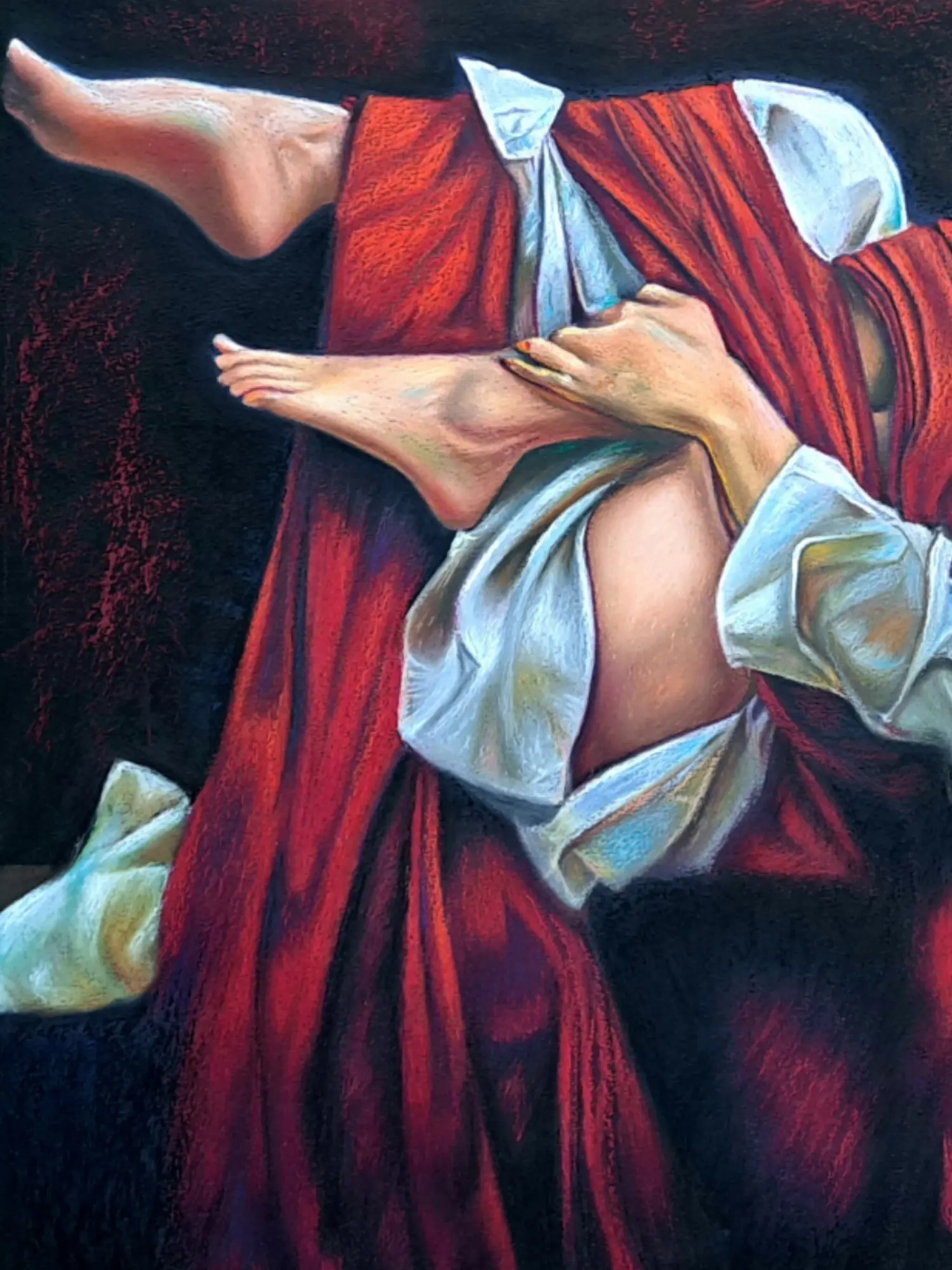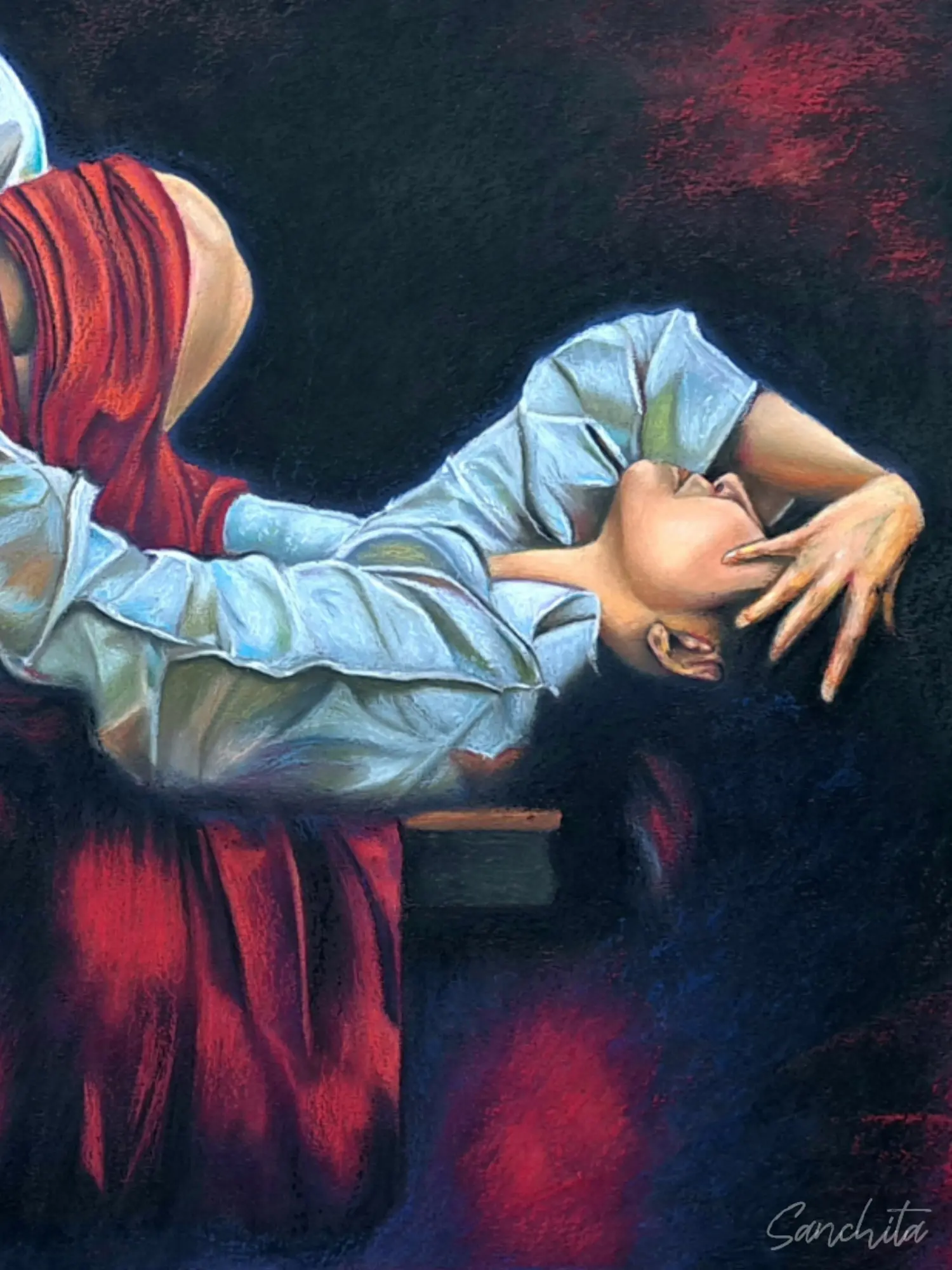 The composition is both elegant and dynamic. The woman's body forms graceful curves, a visual poem that speaks of both repose and latent energy. This style is reminiscent of the classical depictions of reclining goddesses and nymphs, often found in Greco-Roman sculpture and Renaissance paintings. The artist has skillfully utilized the interplay between the body's form and the flowing fabric to create a sense of movement and fluidity. The colour palette, primarily focused on fiery reds, deep blacks, and soft whites, enhances the overall dramatic impact. It recalls the artistic movements that emphasized the expression of emotion and the power of color, such as Romanticism and Expressionism. The piece speaks of a certain timeless beauty, drawing on artistic traditions across continents and centuries, while maintaining a uniquely modern sensibility. The dark background serves as a canvas for the rich colours to shine, further emphasizing the central figure and the emotional depth of the scene.