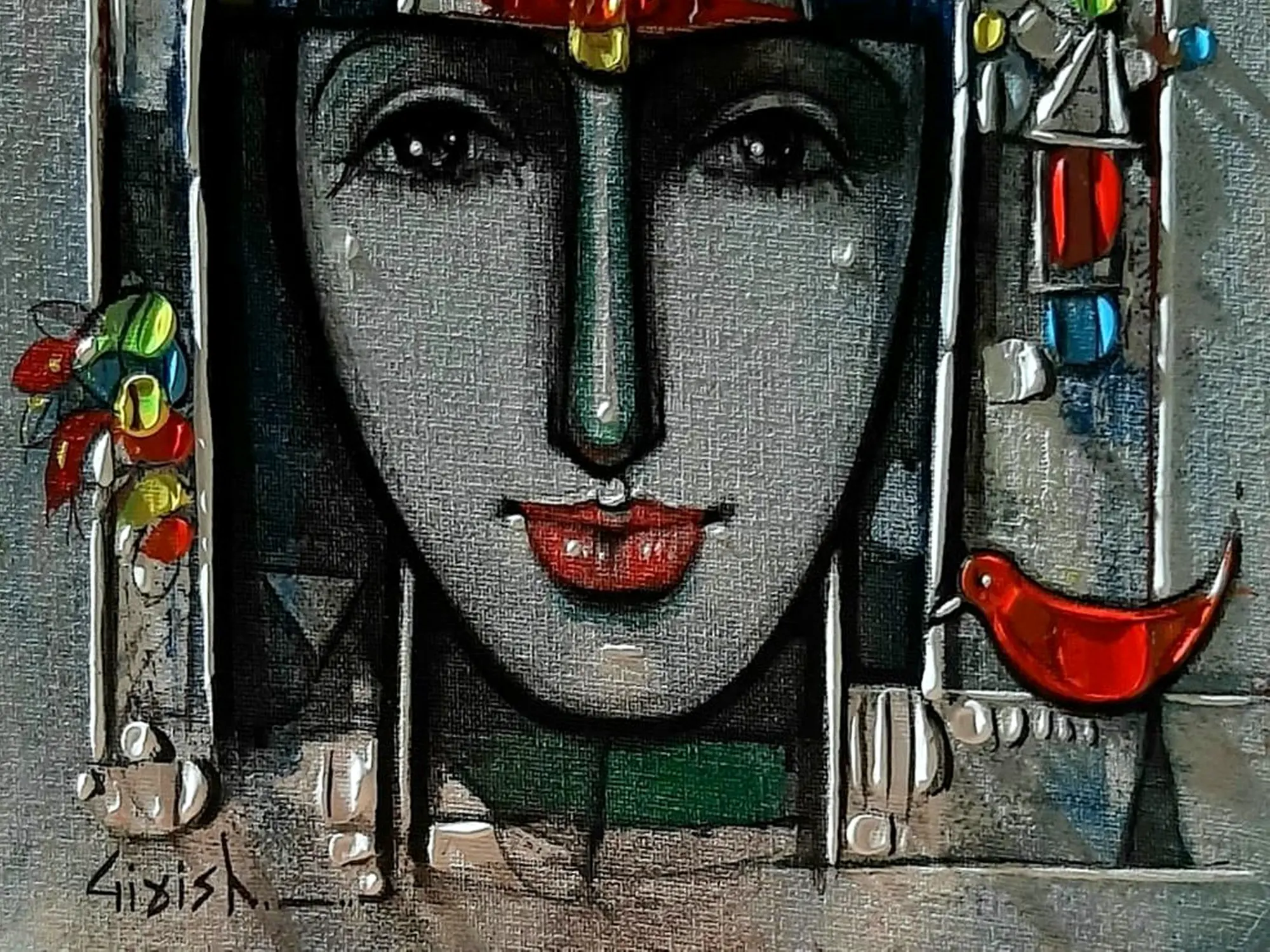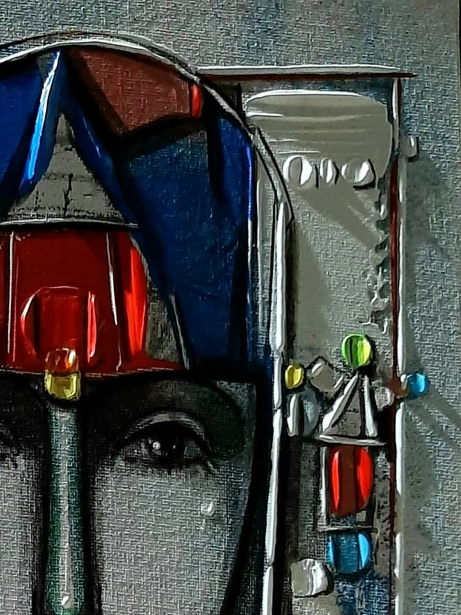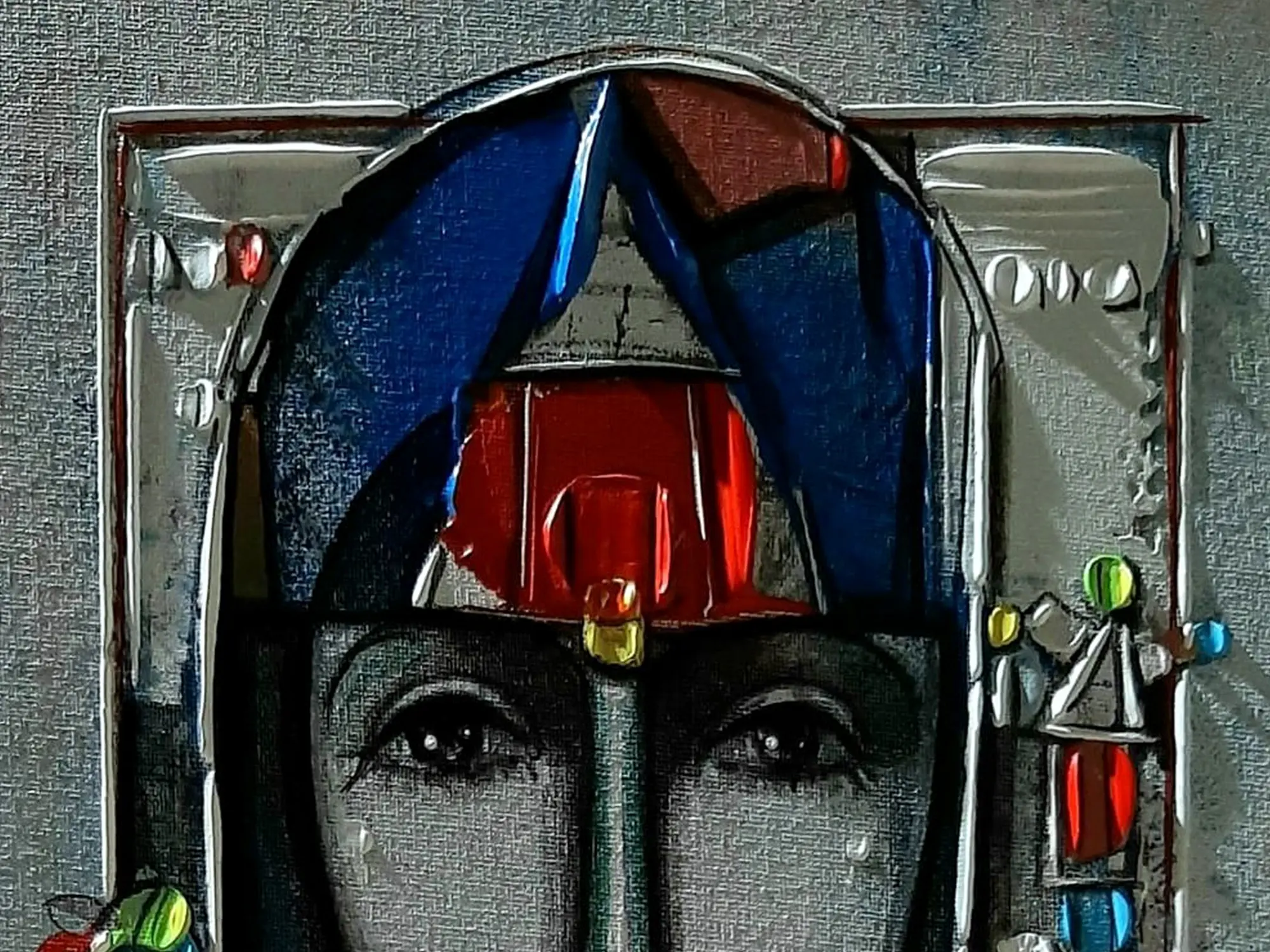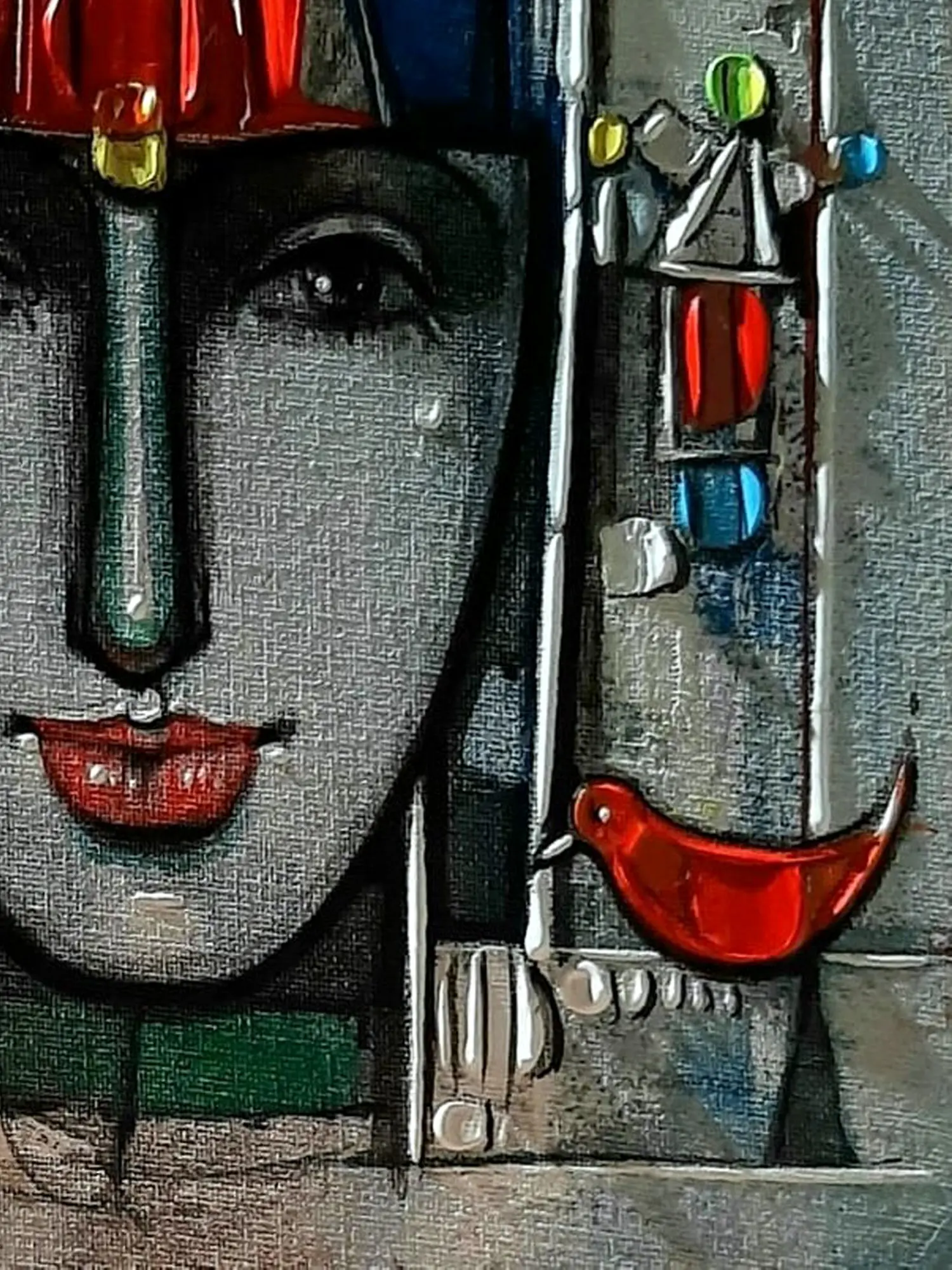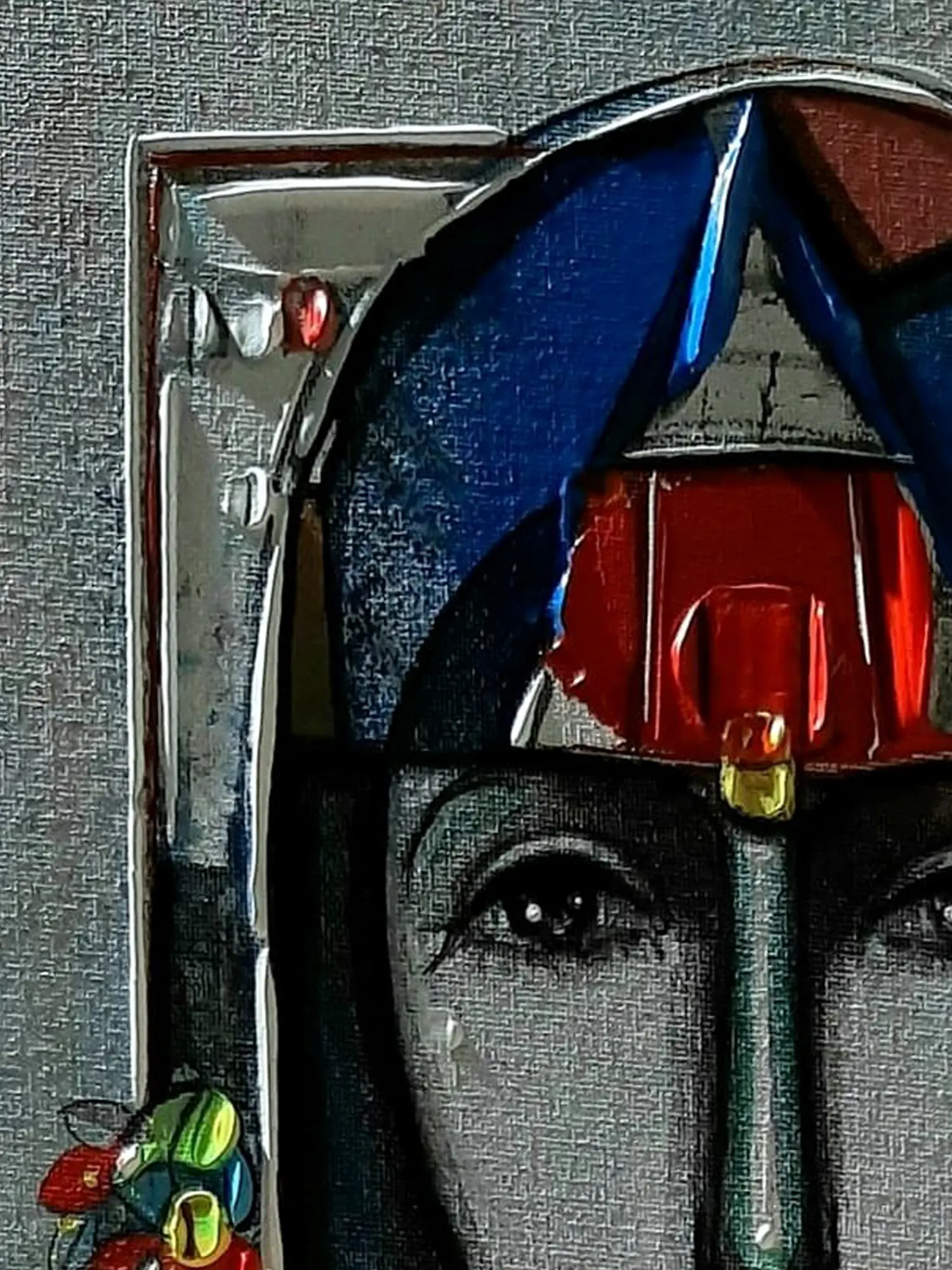 The 12 by 10 inch canvas presents a mesmerizing visage, its features both familiar and strikingly stylized. The interplay of light and shadow, along with the bold use of color, creates a dynamic visual experience that draws the eye deeper into its intricate details. Notice the subtle nuances in the rendering of the eyes, conveying a depth of emotion, and the bold strokes of red that define the lips, suggesting a quiet strength and allure. The abstract elements framing the face add a contemporary flair, enhancing its overall impact.