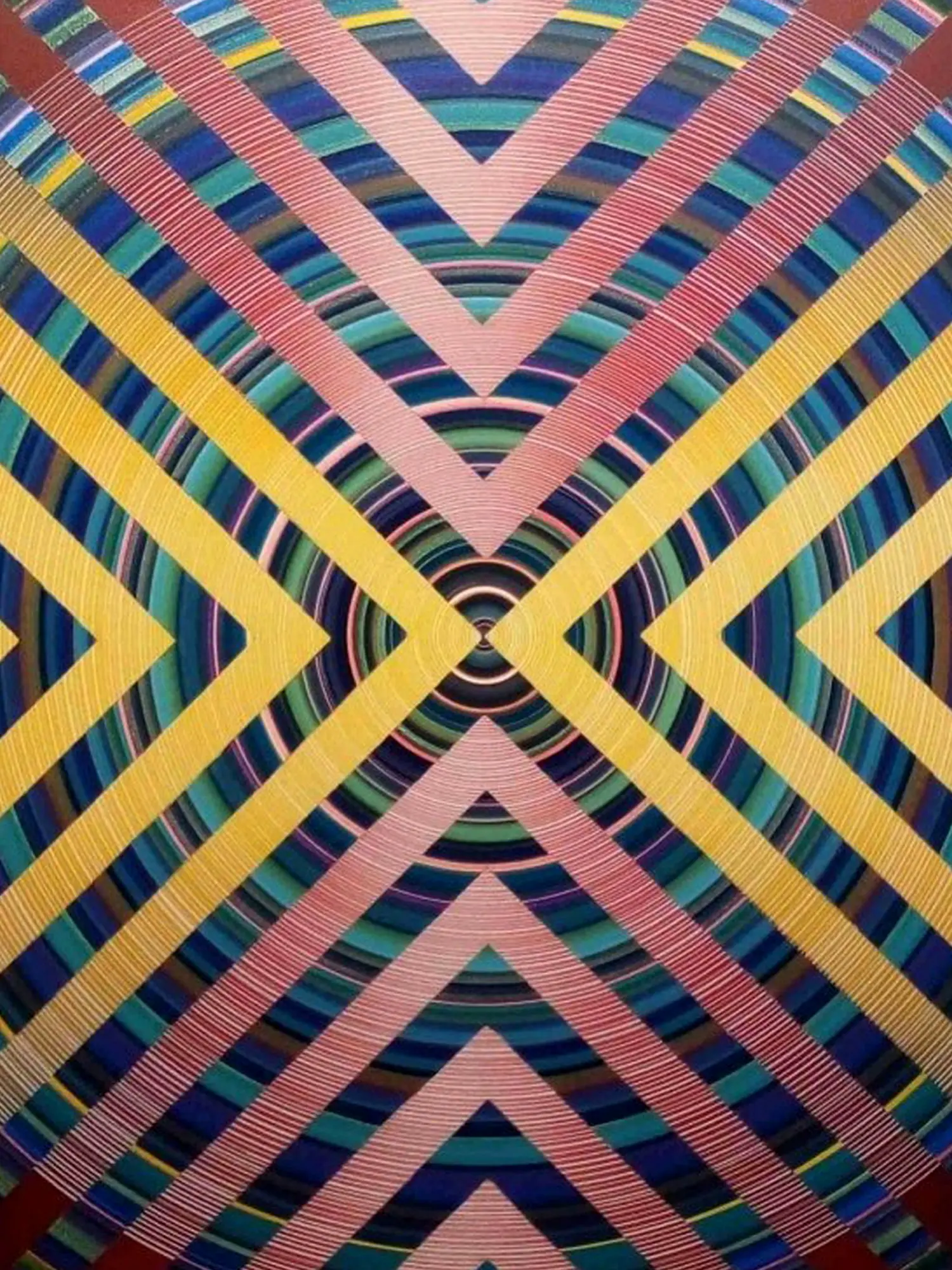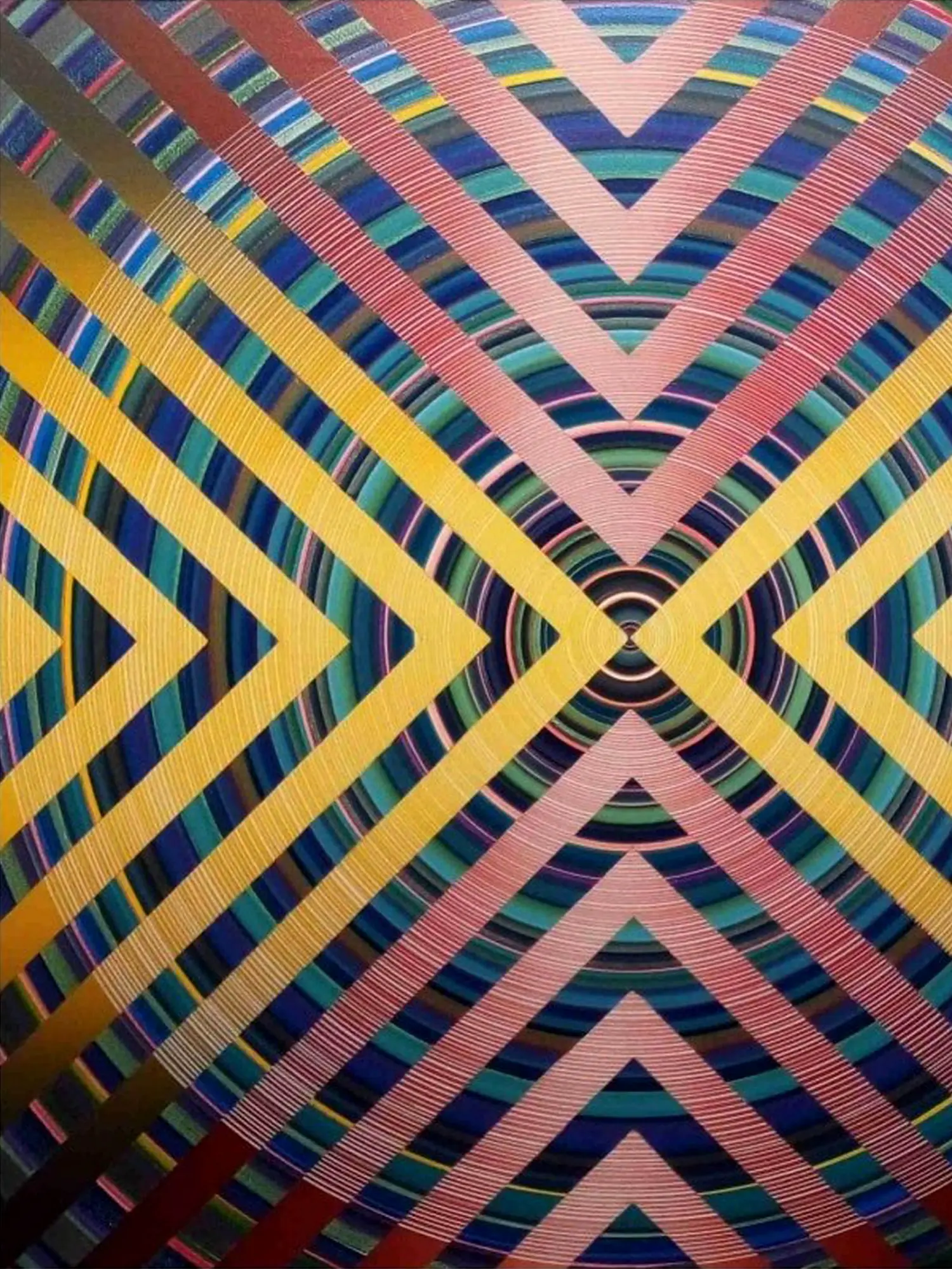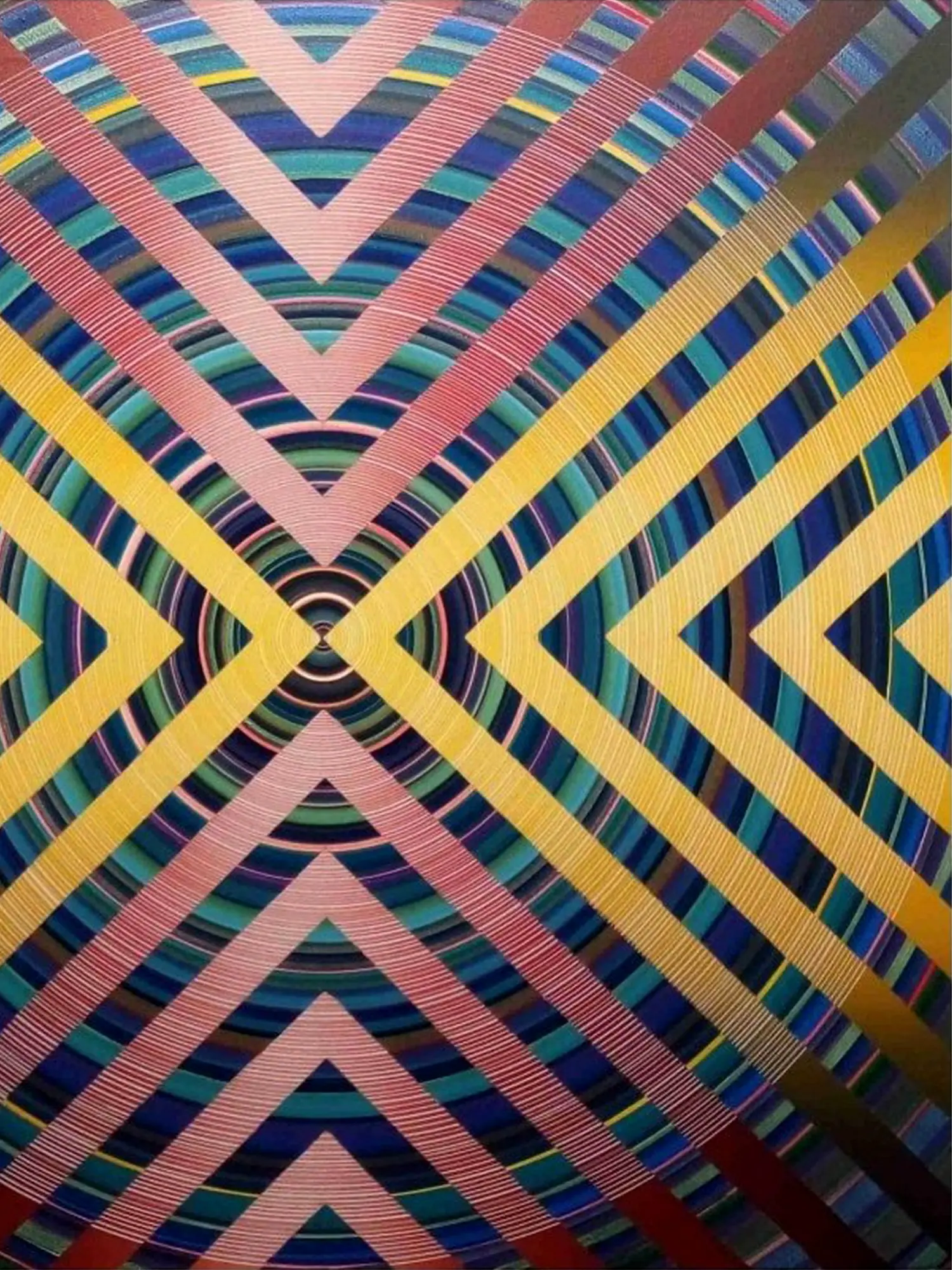 The precise geometry of the artwork evokes mandalas, sacred symbols used in various spiritual traditions to represent the universe and aid in meditation. Mandalas, derived from ancient Indian traditions, often feature intricate geometric patterns arranged around a central point. The act of creating and contemplating a mandala is believed to promote inner peace and spiritual growth. The geometric precision in the painting also resonates with Yantra, a symbolic representation of deities and cosmic forces. Yantras are used in meditation and ritual practices to invoke specific energies and qualities.