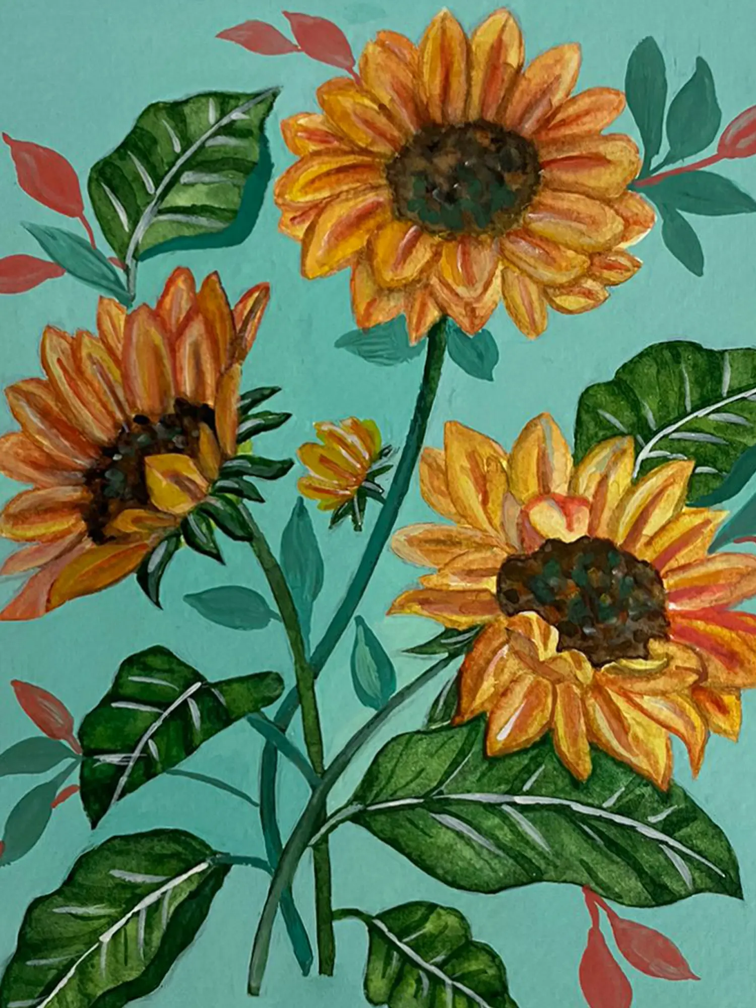 Bask in the warm glow of summer with our Sunflowers painting. Capturing the vibrant energy and radiant beauty of these iconic blooms, this artwork invites you to revel in the joy of sunshine and nature's bounty. Each sunflower, with its golden petals and cheerful demeanour, exudes warmth and vitality, brightening any space with its radiant presence. The interplay of light and shadow adds depth and dimension to the composition, evoking a sense of wonder and awe.
