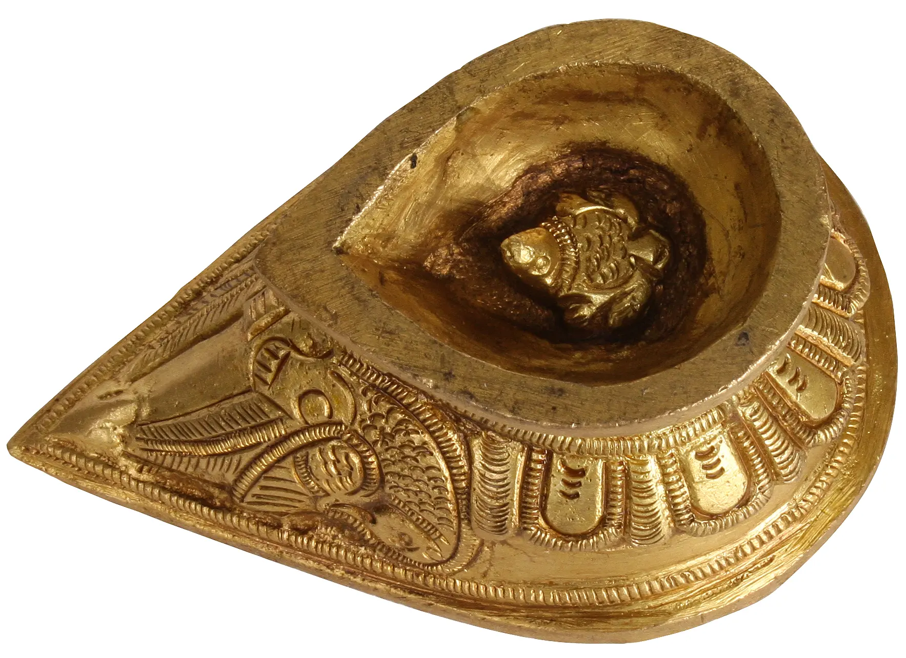 Portable lights are frequently classified as Mada Vilakkus; nevertheless, they can also be wall niche lamps, which does not alter their structure. This portable metal lamp with a golden tinge bears various holy themes on its body. On the neck is a parrot sign, and on the bottom is a tortoise emblem. This lamp also has an elevated stand that increases its beauty. The tortoise symbol at the bottom represents equilibrium since Lord Vishnu's Kurma Avatar assisted in balancing the Mandar Mountain during the Samudra Manthan. It is an excellent complement to a personal worship area since Vastu considers ritual artifacts with a tortoise motif to bring equilibrium into one's life.