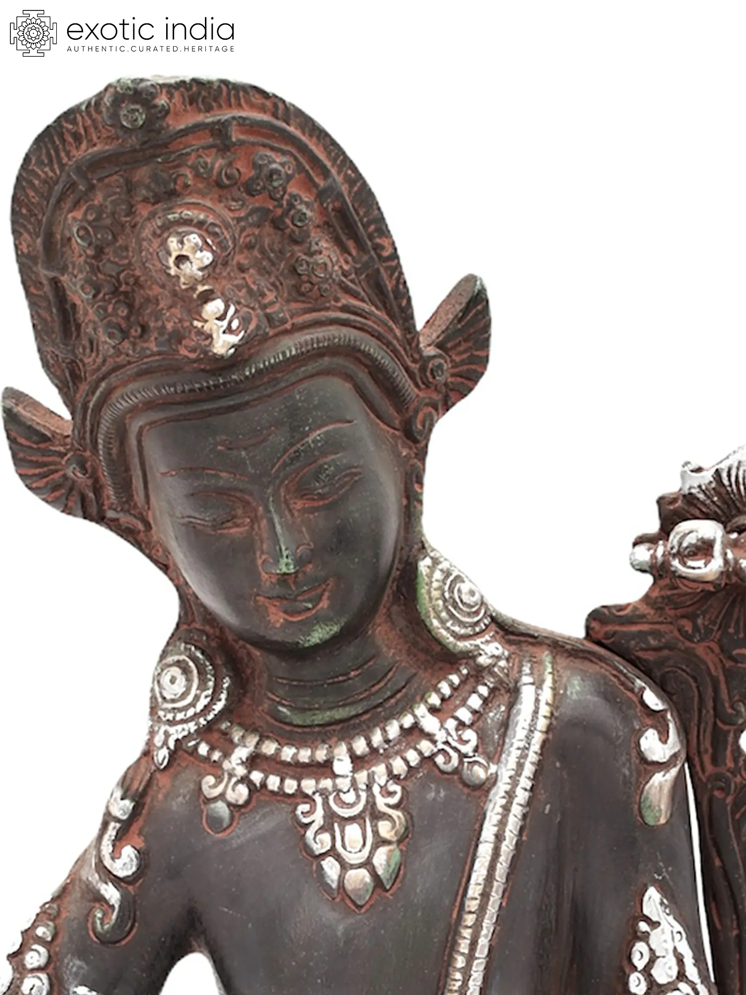 This exquisite brass statue captures Lord Indra, the king of the gods in Hindu mythology, in a moment of profound contemplation. Seated in a relaxed yet regal posture, his head is gently bowed, conveying a sense of deep thought or humility. The rich, dark patina of the brass is accentuated by the intricate detailing and the subtle silver inlay work that adorns his elaborate headdress, necklaces, armbands, and anklets. Each element, from the delicate patterns on his garment to the serene expression on his face, speaks to the mastery of the artisan who brought this divine form to life.