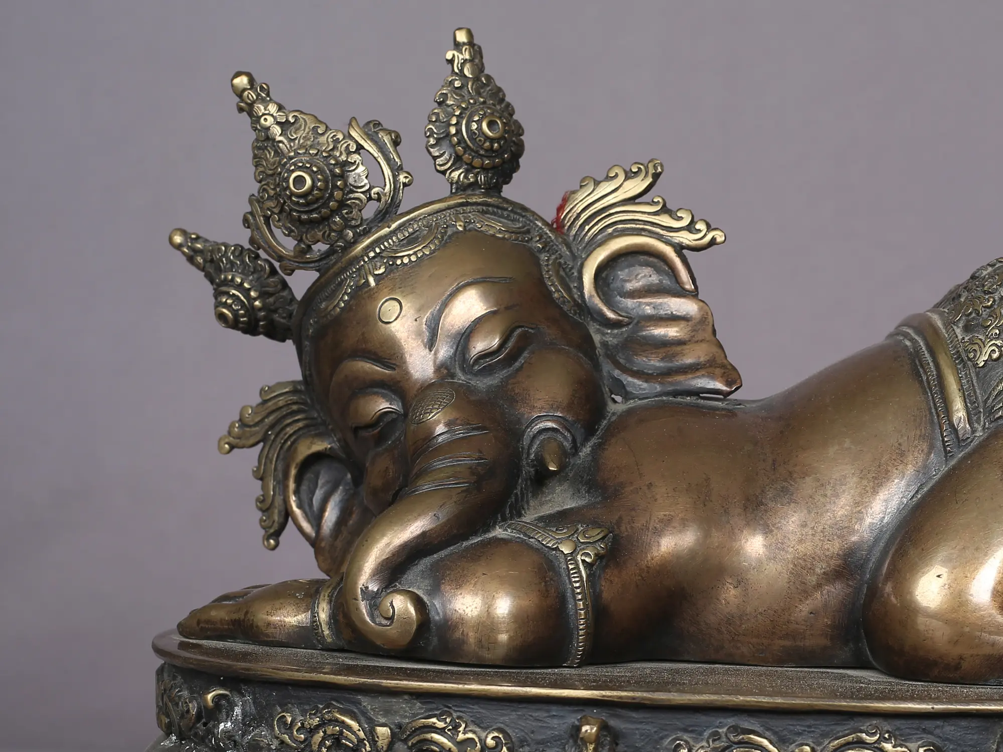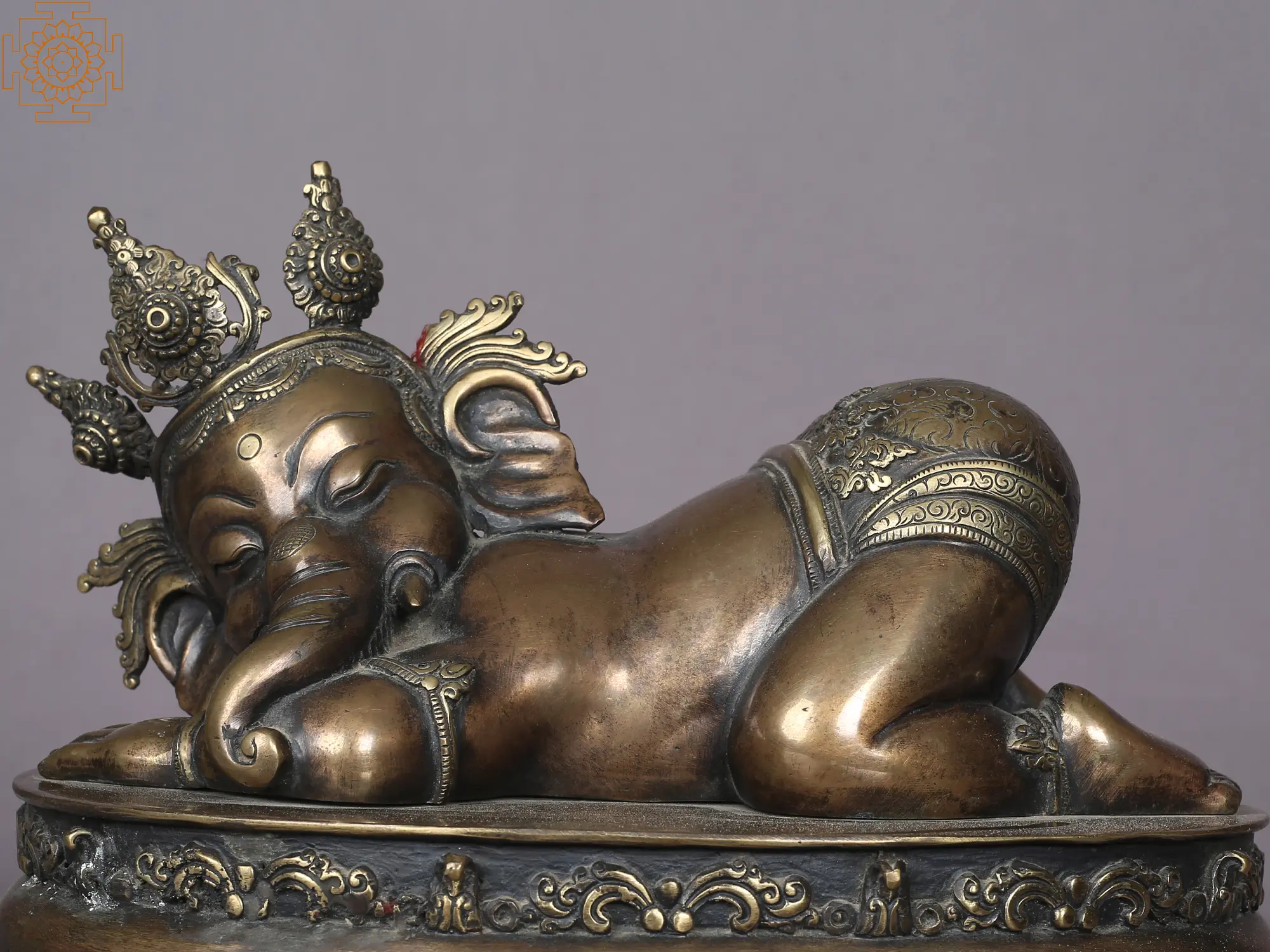 The form of Bal Ganesha, in which the Lord is depicted as a child, represents innocence. Lord Ganesha, is renowned as the deity of wisdom, a symbol of intellect, and the remover of obstacles. The serene and composed portrayal of Lord Ganesha in a sleeping posture conveys connotations of opulence, ease, and affluence. Lord Ganesh in slumber often features him leaning against a pillow or bolster. Ganesha in a sleeping position is emblematic of indulgence and regal comfort, as he is portrayed in a relaxed posture on his throne, complete with a pillow.