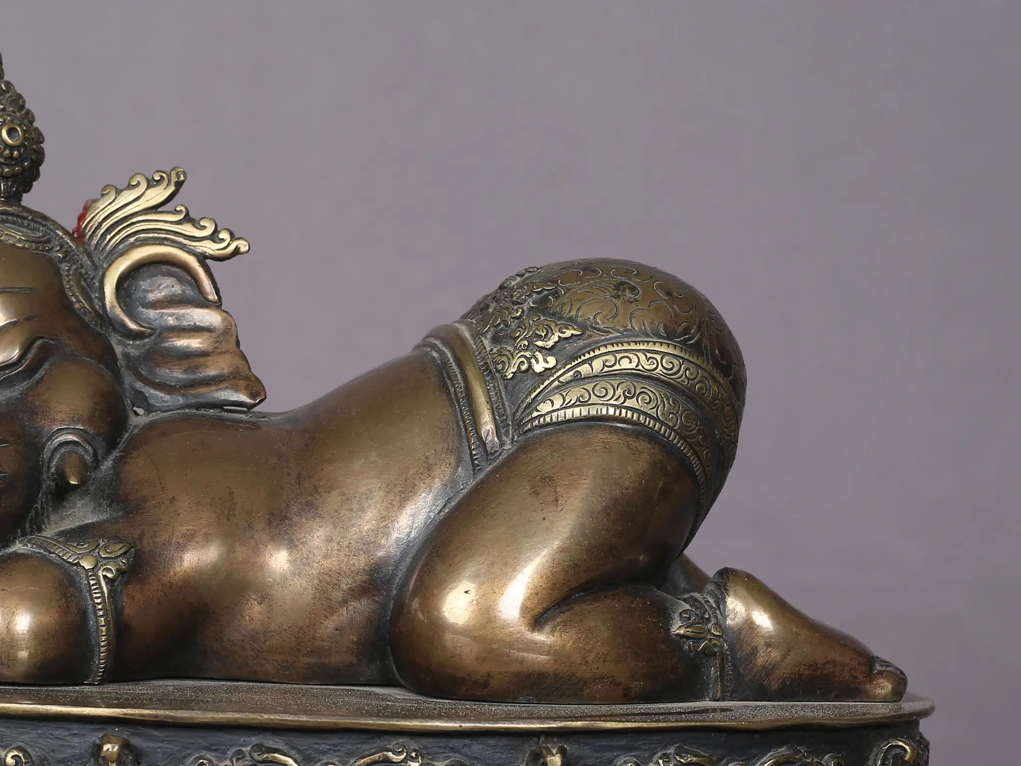 He is also adorned with his huge and precious crown, signifying regal attributes and opulence. His huge ears signify his capacity to attentively listen to the prayers of his devotees.