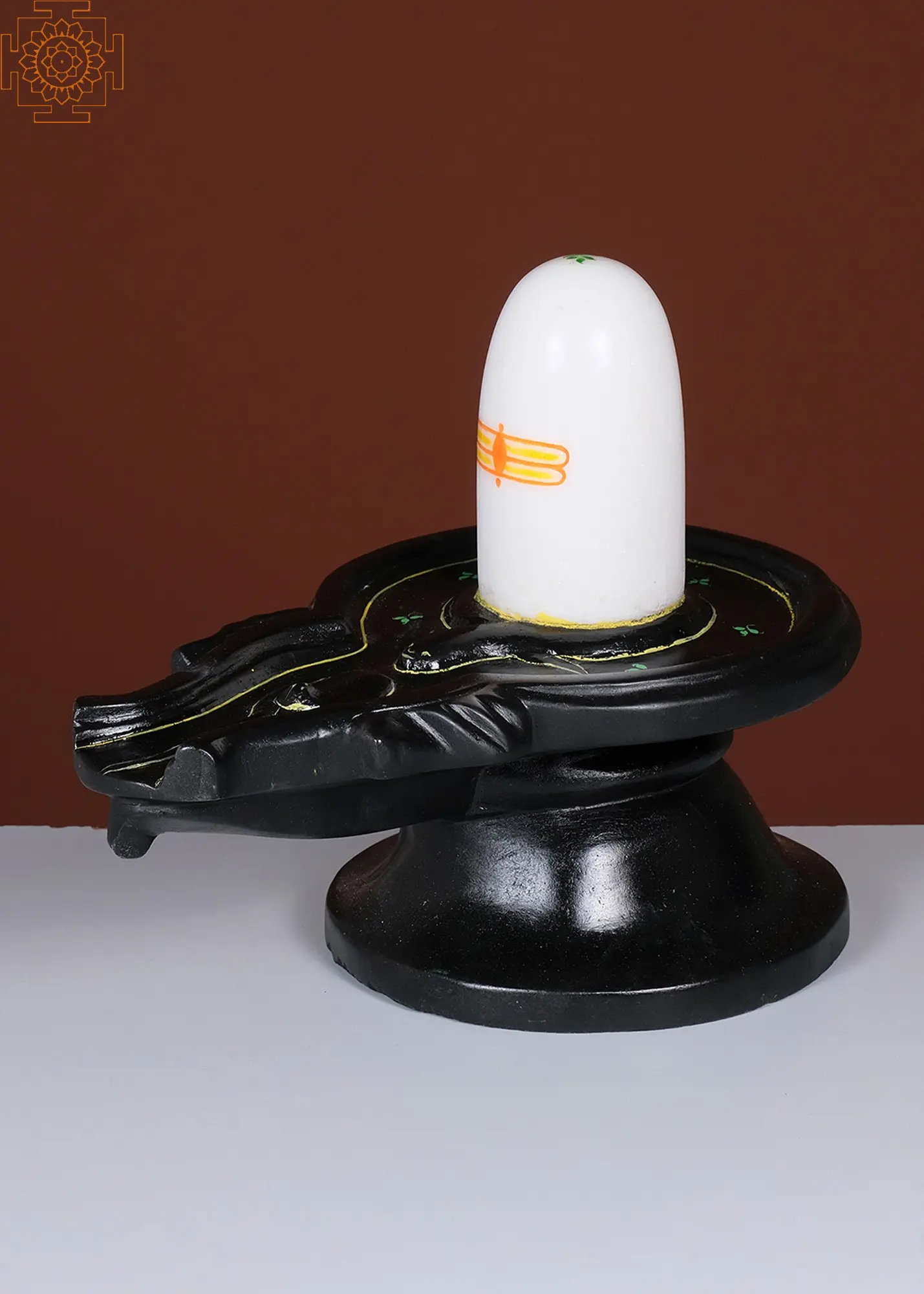 The Shiva Lingam is a profound and ancient symbol representing the formless, omnipresent, and ultimate reality of Lord Shiva. It is not an idol in the conventional sense, but rather an abstract representation of the cosmic creative energy that permeates the universe. This exquisite piece, crafted from deep black marble, is a testament to the devotion and artistry inspired by this sacred form. The pristine white marble of the lingam itself, adorned with the traditional orange and yellow *tilak* (a sacred mark), stands in striking contrast against the dark, intricately carved base, symbolizing the union of the divine masculine and feminine energies.