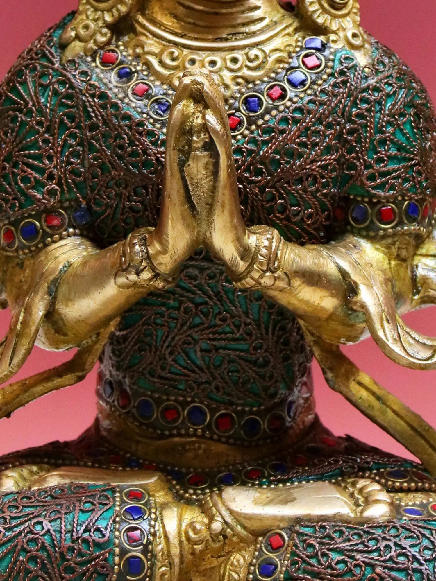 Crafted from lustrous brass, this statue is a testament to meticulous artistry and devotion. The rich patina of the brass speaks of tradition and reverence, while the intricate inlay work elevates it to a true masterpiece. The Bodhisattva's robes are adorned with vibrant, inlaid stones—deep blues, fiery reds, and rich greens—arranged in a mesmerizing pattern. These gemstones not only enhance the visual splendor of the piece but also symbolize the various qualities and aspects of the enlightened mind. The delicate filigree work that overlays the inlaid sections adds a layer of depth and texture, suggesting the intricate tapestry of existence that Chenrezig surveys with compassion.