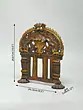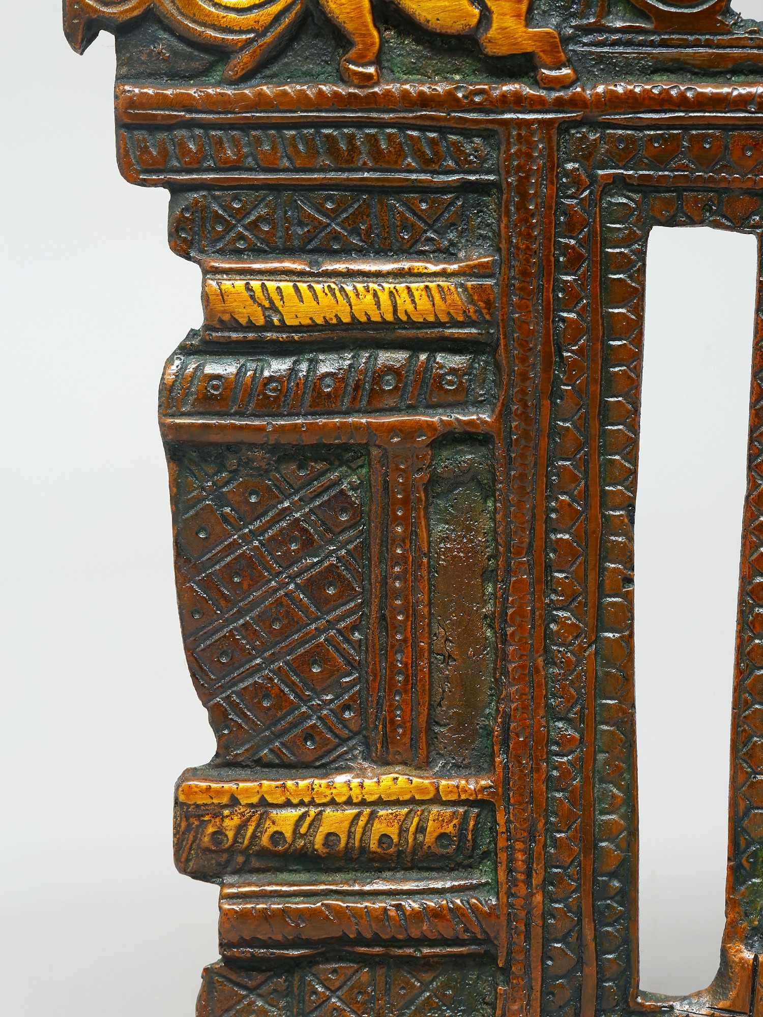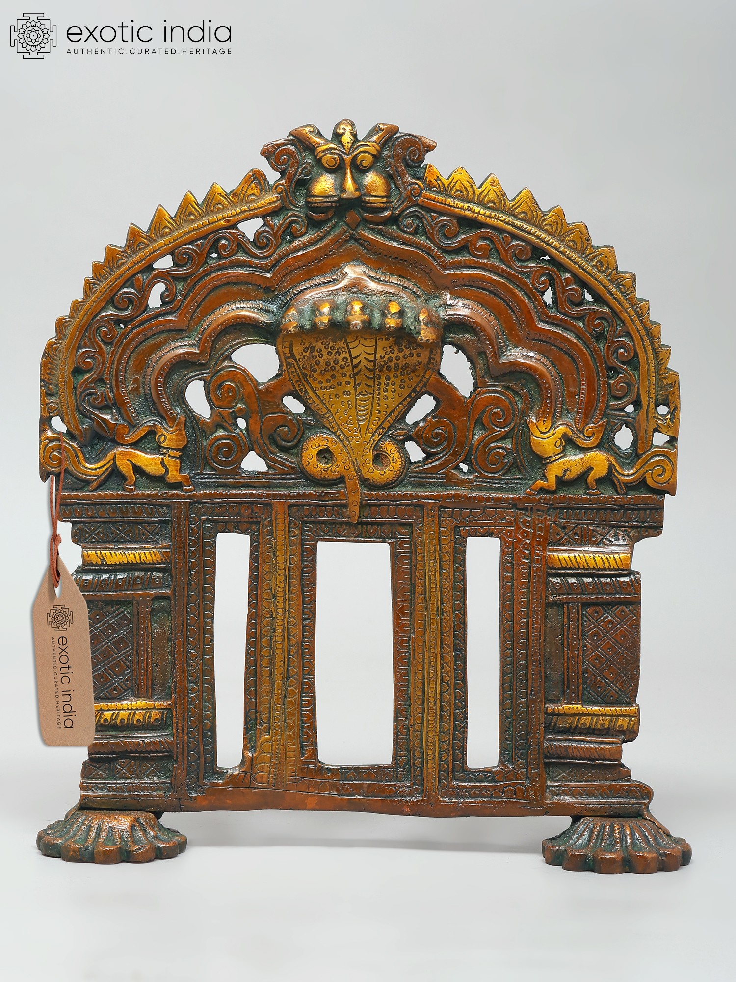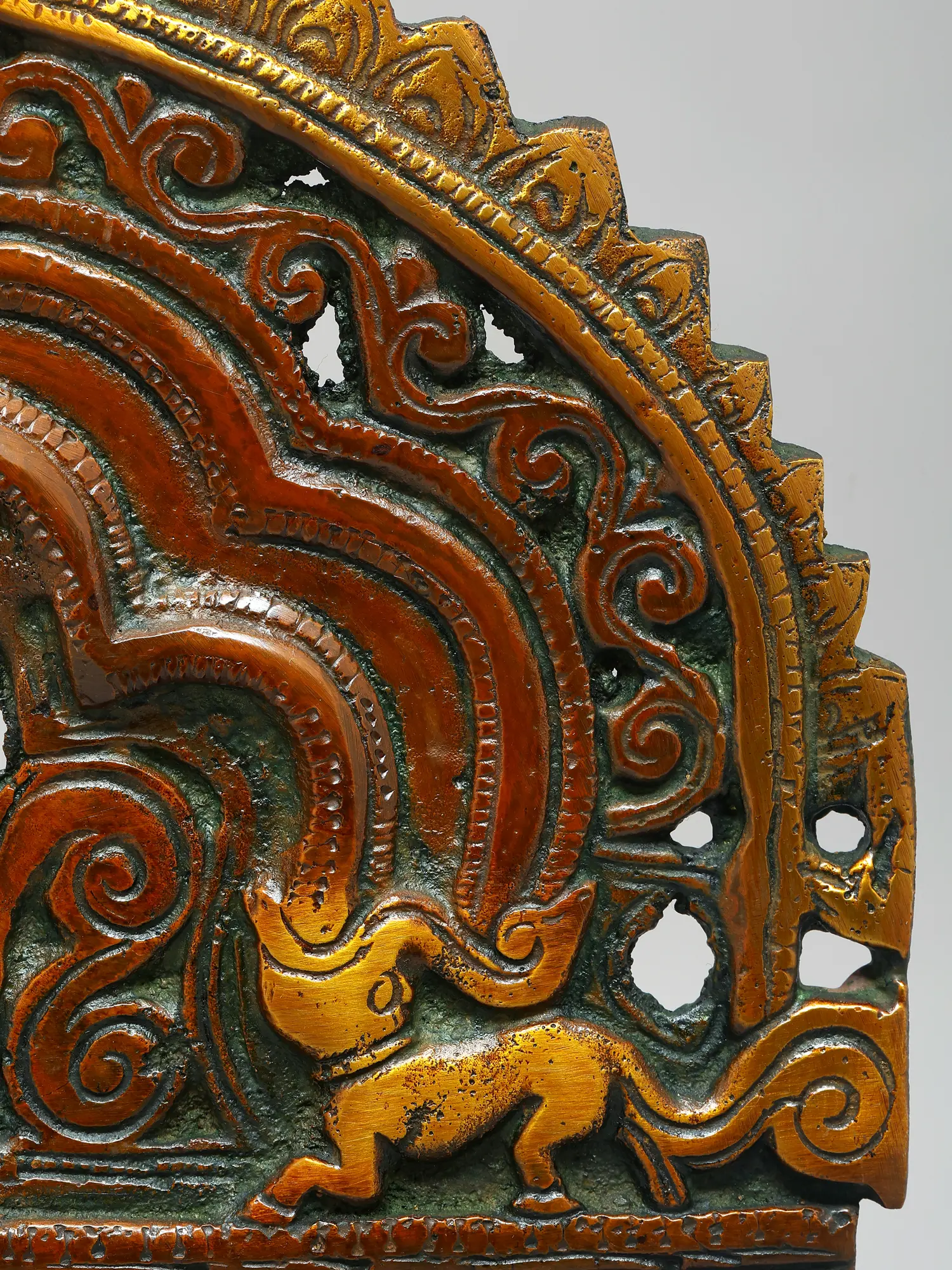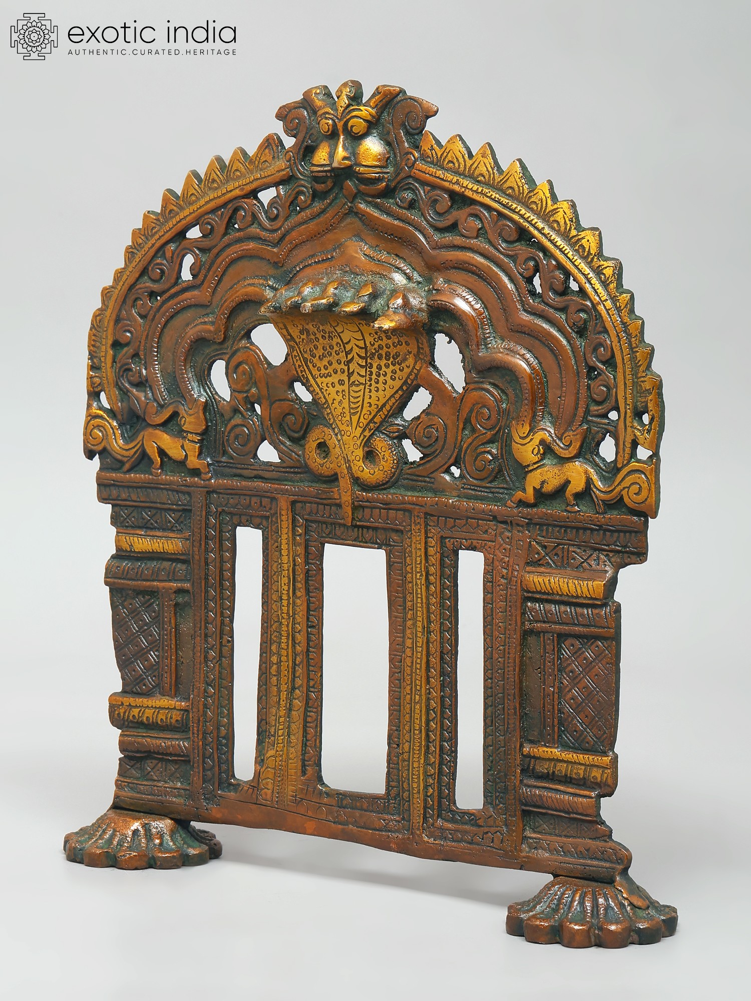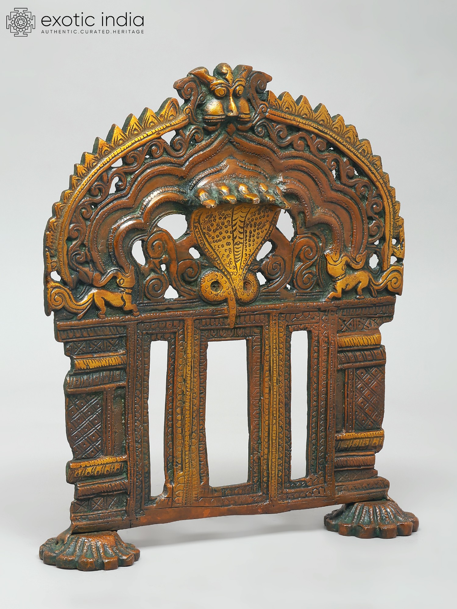 A prabhavali, often translated as "halo," "aureole," or "arch," is an ornamental surround frequently used in Hindu and Buddhist iconography. These intricately crafted frames serve as more than mere decoration; they function as a visual declaration of the deity's divine status and power. The prabhavali directs the gaze of the devotee, focusing attention and reverence on the enshrined image. Its presence elevates the statue from a representation to a manifestation of the divine. This particular prabhavali is crafted from brass, a metal long revered for its auspicious qualities and its association with divine energy. Skillfully worked by artisans in India, the piece showcases traditional techniques passed down through generations. The warm, golden hue of the brass lends an ethereal quality to the prabhavali, enhancing its sacred aura. The meticulous detailing, achieved through careful carving and casting, embodies the dedication and artistry invested in creating a fitting backdrop for the divine.