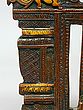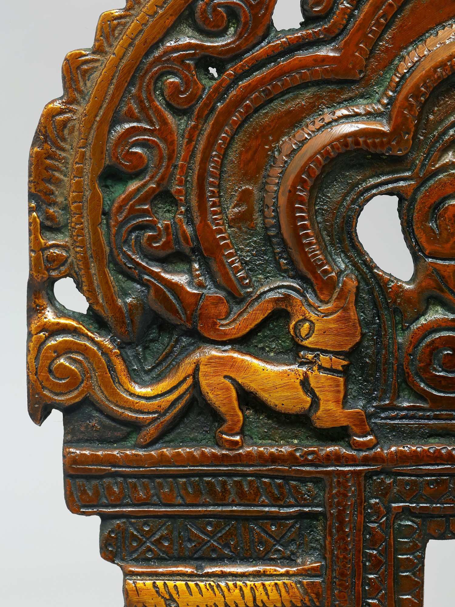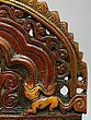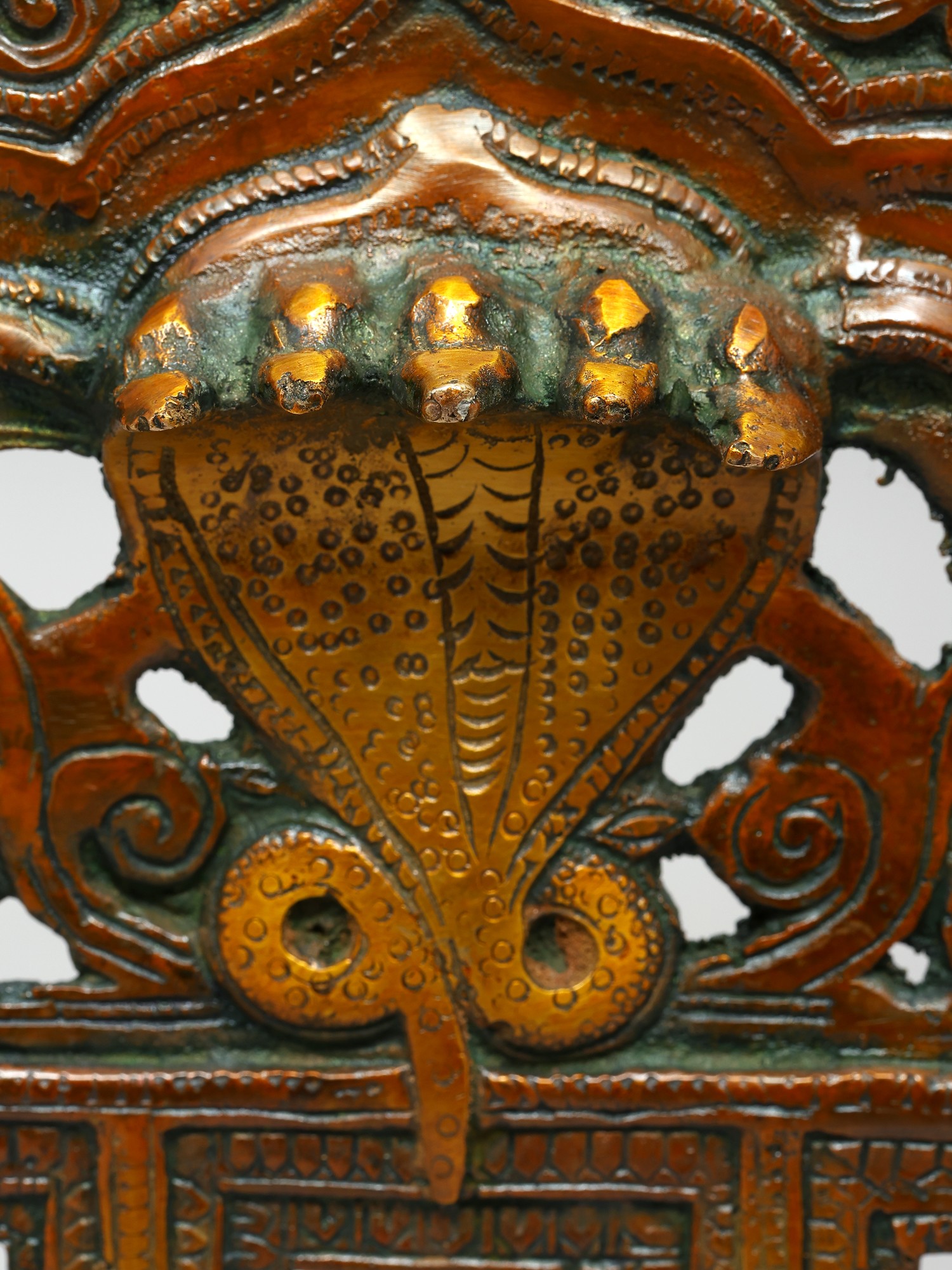 Dominating the apex of this prabhavali is the fearsome Kirtimukha. A ubiquitous motif in Hindu and Southeast Asian art, the Kirtimukha, also known as the "Face of Glory," is a monstrous, lion-like face often depicted devouring its own tail. This symbolic act represents the all-consuming nature of time, the cyclical nature of existence, and the ultimate triumph of the spiritual over the material. Legend has it that the Kirtimukha originated from a demon sent by Shiva to devour Rahu, who had tried to steal the nectar of immortality. However, the demon instead devoured itself, impressing Shiva with its devotion and earning a permanent place as a guardian figure, warding off evil and negativity. Below the Kirtimukha, a majestic cobra rises, its hood flared in a protective gesture. The serpent holds a significant place in Indian mythology, often associated with divine power, protection, and fertility. The cobra, in particular, is linked to nagas, serpentine deities who are guardians of treasures and sources of life-giving water. Its presence on the prabhavali further amplifies the sanctity and protective qualities of the piece, reinforcing the divine energy radiating from the deity it frames. Flanking the structure are mythical guardian creatures, adding another layer of protection and auspiciousness. Each element works in harmony, creating a powerful and evocative representation of divinity.
