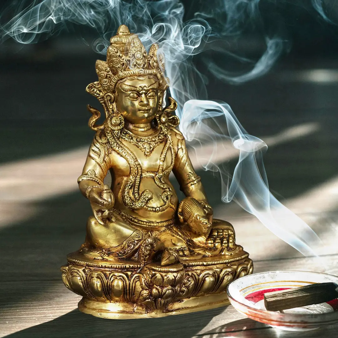 At the core of this brass sculpture lies the representation of Kubera, a revered deity in Tibetan Buddhism known as the Lord of Wealth and Guardian of the Northern Direction. With a profound understanding of the interplay between material abundance and spiritual enlightenment, Kubera symbolizes the harmonious balance between worldly prosperity and inner fulfillment. His presence infuses your environment with an aura of opulence, inspiring you to pursue not only material wealth but also the spiritual riches that enrich the soul - the gem in Kubera's left hand, symbolizing the intrinsic value of knowledge, enlightenment, and the wealth of wisdom and the mongoose resting on Kubera's right hand is an embodiment of auspiciousness and prosperity; Kubera on his Lotus plinth sits in a Lalitasana with a semi-wrathful expression over face.