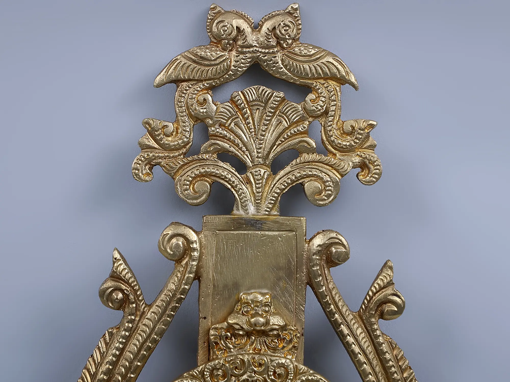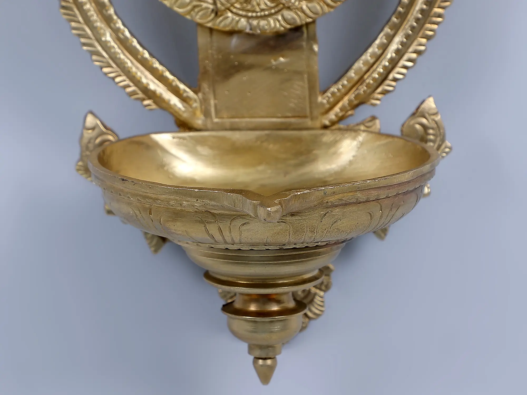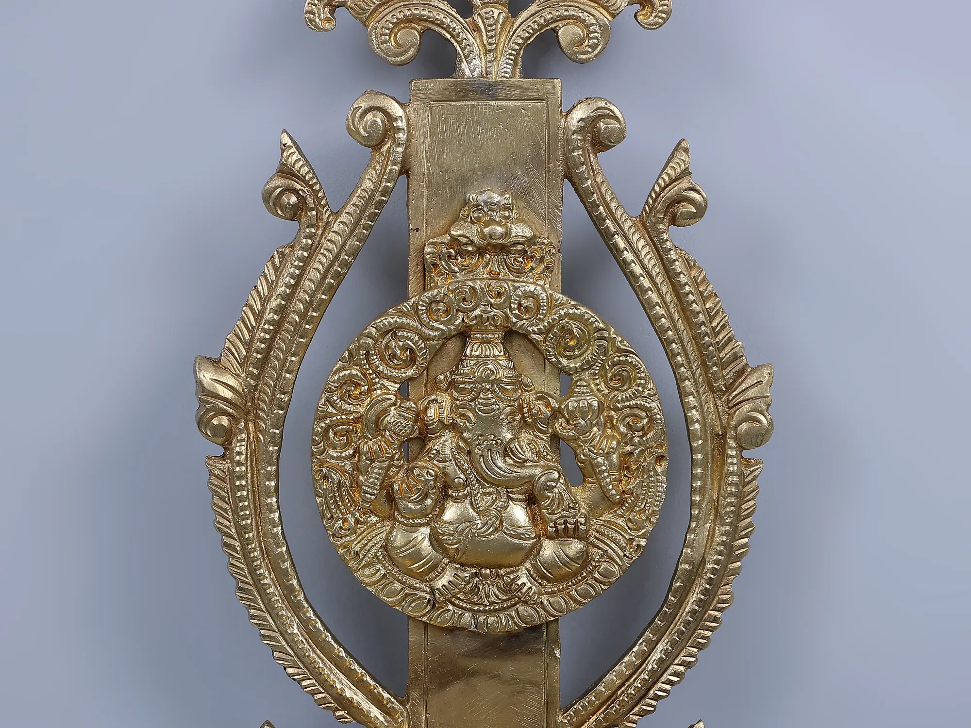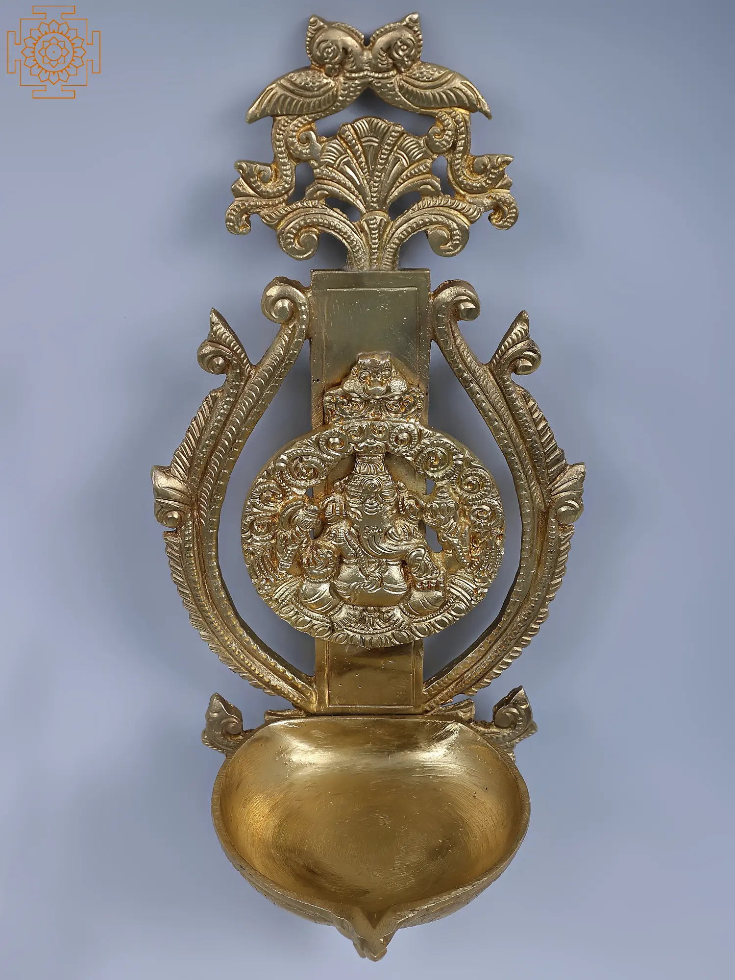 This Bronze lamp in the Hoysala style of craft is a dedication to the endless power and wisdom of Lord Ganesha. With a central motif of Lord Ganesha blessing his devotes and encircled by coiling vines, this single wick, wall mount lamp is a manifestation of all Shubh (holy). Lord Ganesh, with his curled elephant trunk and huge stature, whose brilliance rivals billions of suns in intensity, constantly eliminates all obstructions from my true endeavors and blesses all living beings through the warmth of the lamp. Two parrots atop the lamp symbolize growth and hence lighting this lamp is equivalent to paying Lord Ganesha with all treasured sincerity.