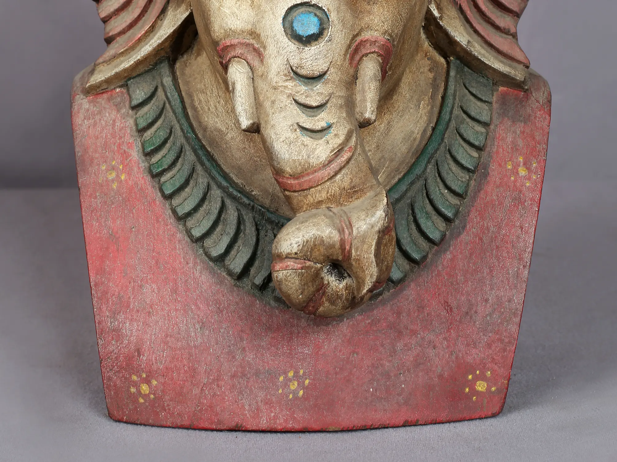 Crafted with unparalleled artistry, Ganesha’s presence is a symphony of colours that dance upon his serene countenance. His coiled trunk, like a sacred spiral of wisdom, exudes a mystical charm. Bulging eyes seem to hold the secrets of the universe, while his large ears echo with the whispers of devotion. A regal crown adorns his divine head, bestowing a majestic aura. This vivid wooden statue from Nepal is a portal to spirituality, a tribute to the boundless creativity and faith of its creators.