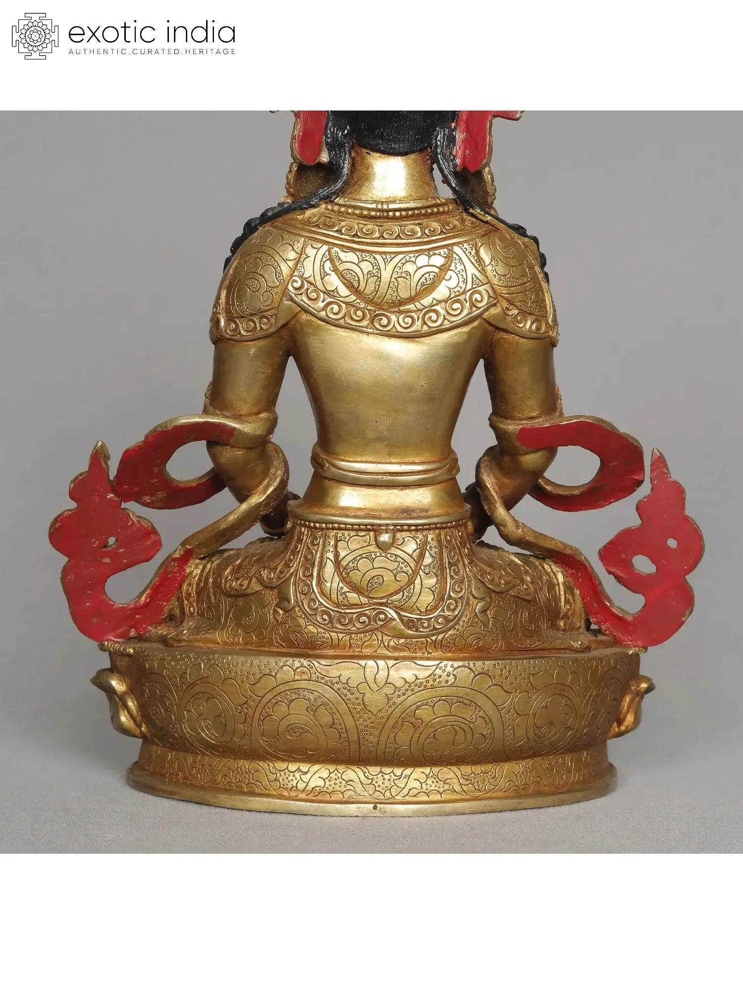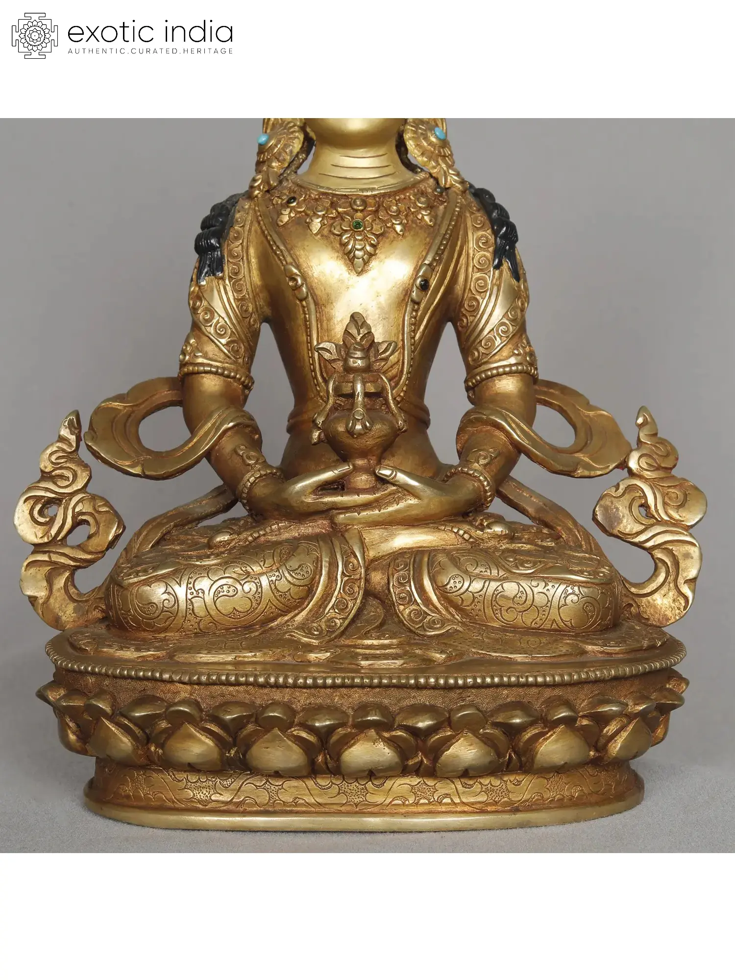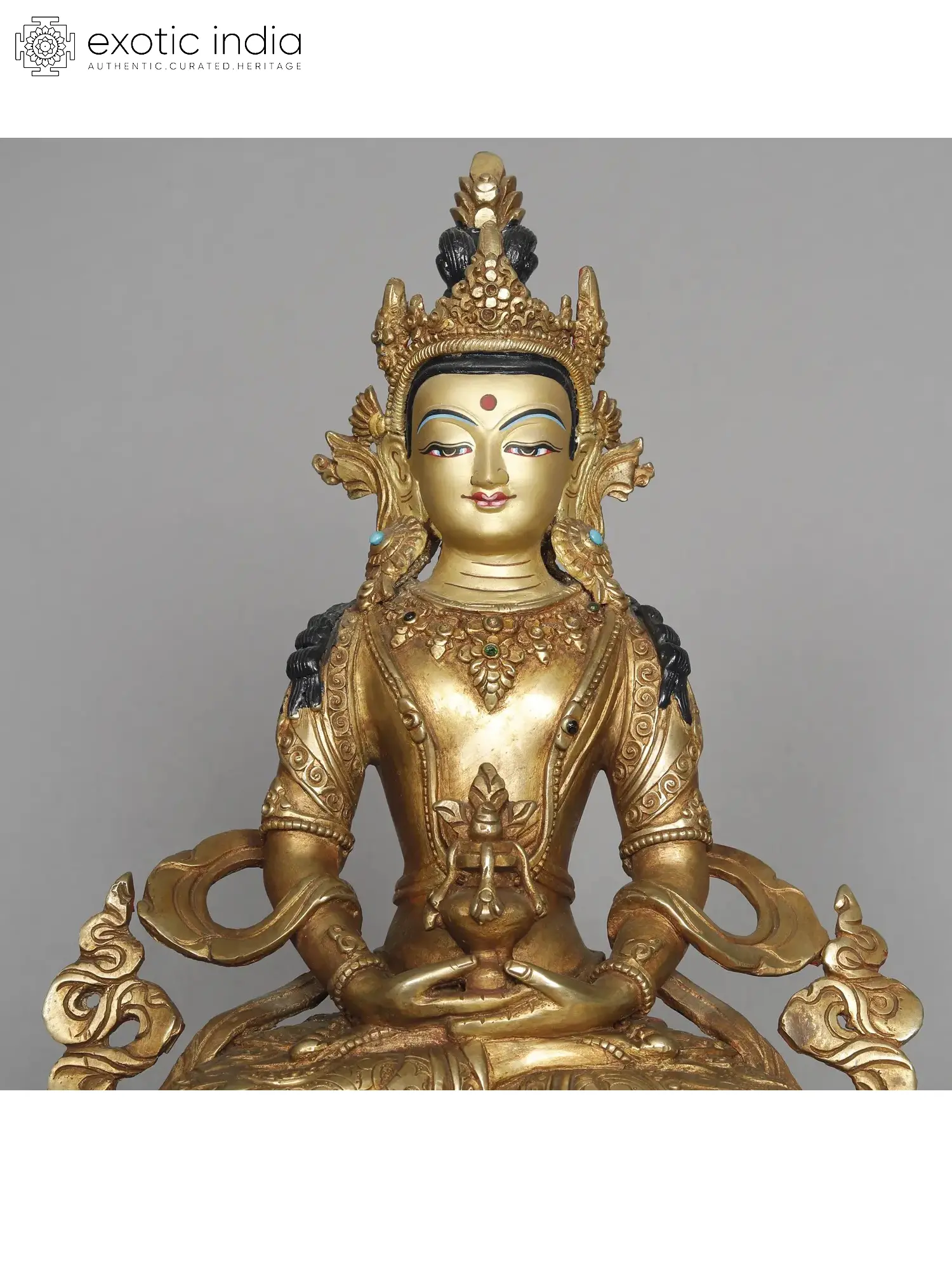 Recognized as the prime and eldest figure of Padmakula in the Buddhist tradition - Amitayu\Amitabha Buddha is the purest embodiment of Pancupadanakkhandhā and promises to guide those who seek his blessings in morbid moments. Seated on a blooming Padma in Dhyana Mudra, this Nepalese copper sculpture of Amitabha Buddha carries the vass of immortality representative of ultimate liberation.