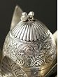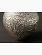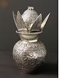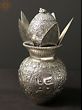 Purna-Ghata, the pot of plenty is one of the most ancient and auspicious symbols of Hindu culture, which contains within itself multiple motifs of fortune and abundance. Inspired by the Purnaghata placed on the Puja altars, this decorative Kalash is exquisitely adorned with rich vegetation patterns all over and empowered by the symbol of Om. Coconut fruit which represents fecundity in life along with fresh Aamra (mango leaves) are also added to the Kalasha. Miniature bells on the top of the coconut bring to this composition the propitiousness of divine sound. Sheathed with an antiquated silver finish, this copper Kalash is a sacred component, perfect to be added to your place of worship.
