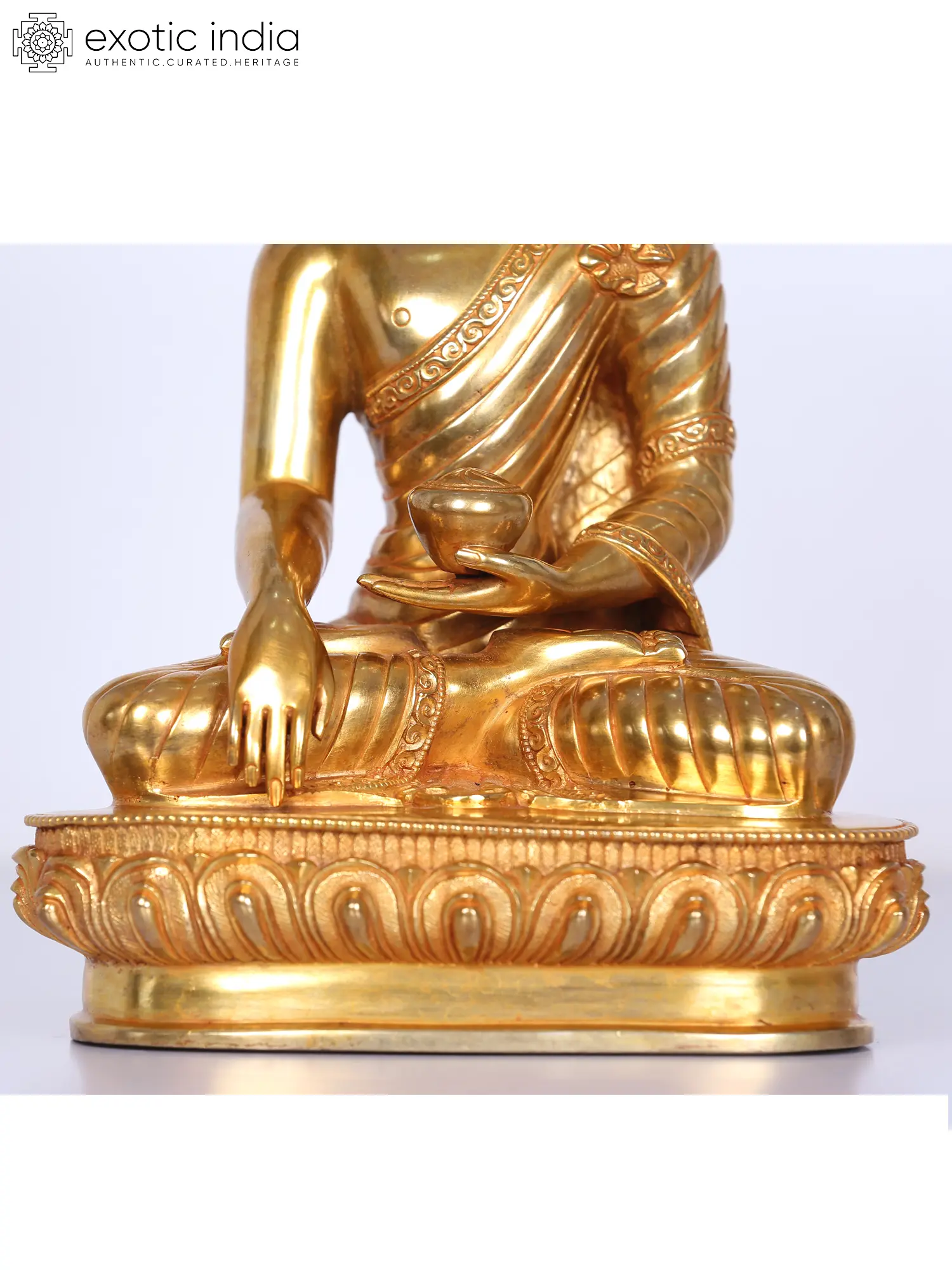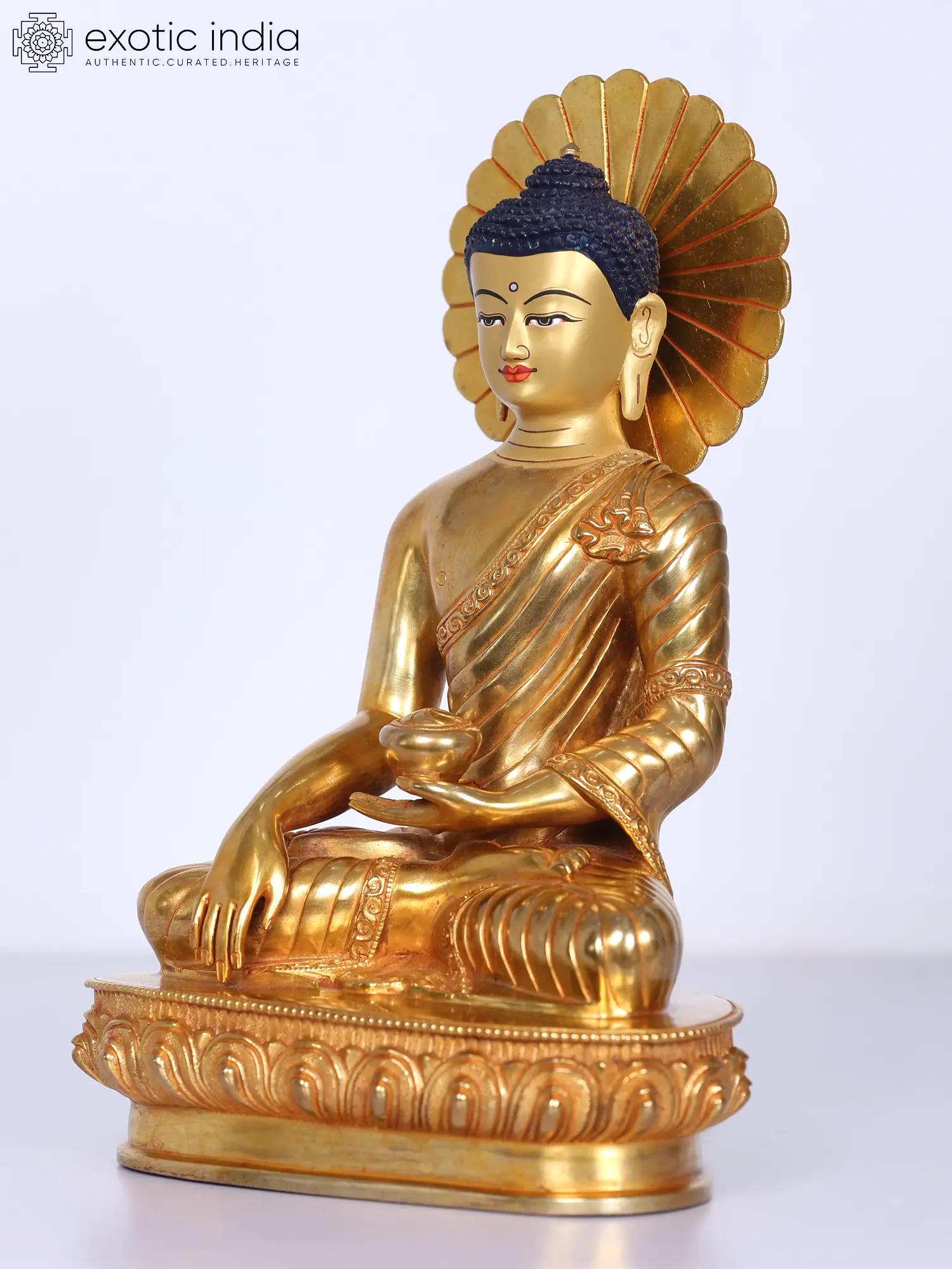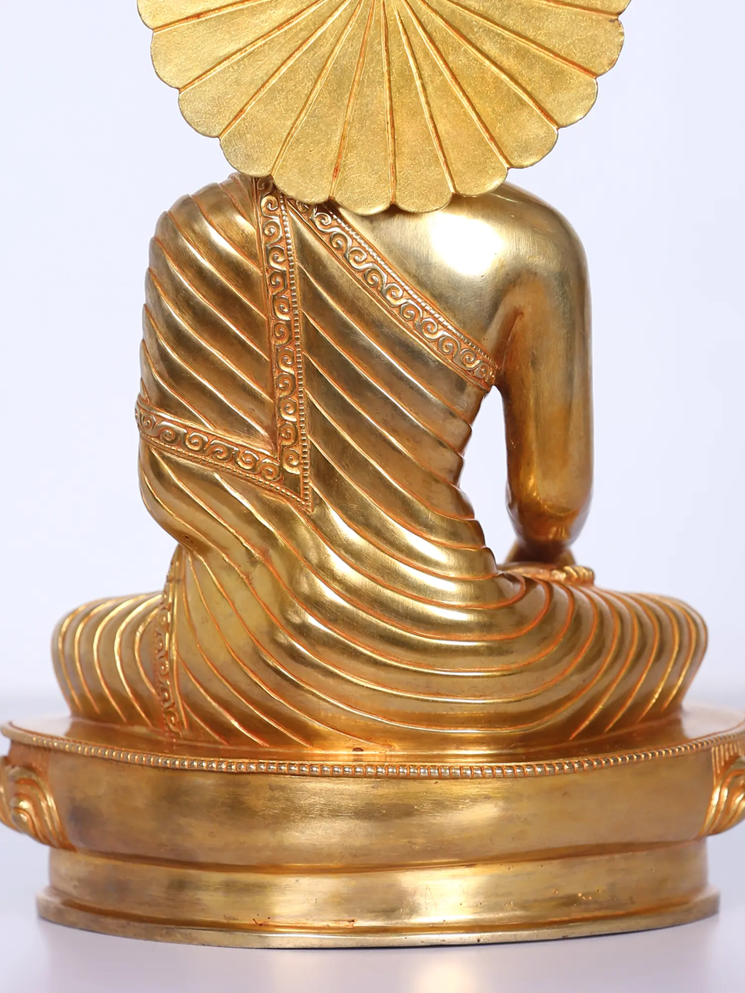 Adorned with snailshell curls and elongated earlobes, his visage exudes divine grace. Clad in the kasaya robe, he sits beneath the ethereal halo of a chakra, “the circle of enlightenment,” an emblem of cosmic unity. This enlightened form of Lord Buddha, carved in copper and gilded with gold, invites contemplation on the profound journey from earthly attachments to the boundless realm of spiritual illumination.