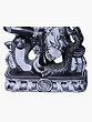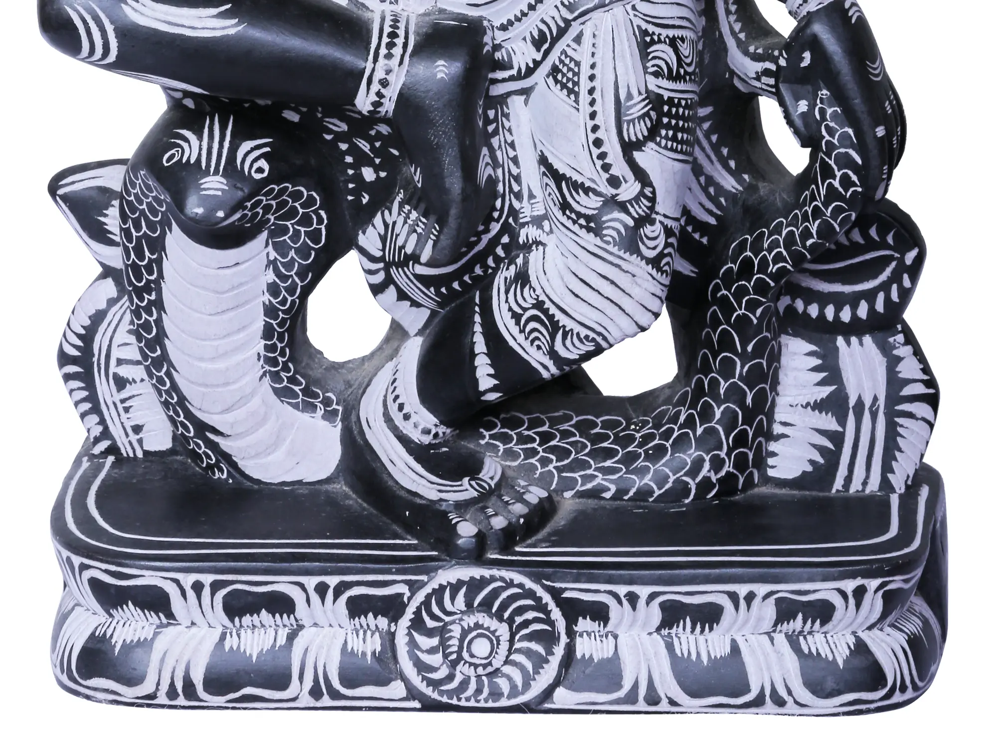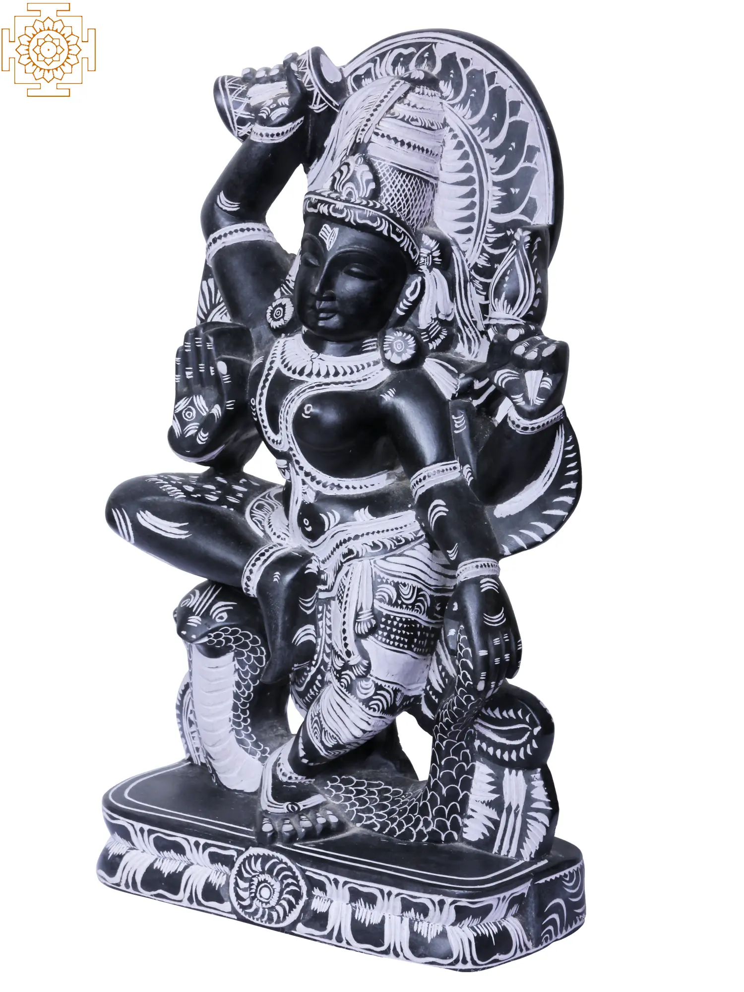This exquisite stone statue, originating from the renowned artistic hub of Mahabalipuram in South India, captures the profound symbolism of Ardhanarishvara, a composite form of Lord Shiva and Goddess Parvati. Ardhanarishvara represents the perfect fusion of masculine and feminine energies, the ultimate unity and balance that pervades the cosmos. This deity signifies that the universe is a harmonious interplay of complementary forces, where creation and destruction, consciousness and energy, are inseparable. The artistry of this piece is a testament to the rich sculptural heritage of the region. Carved from dark stone, its intricate details are brought to life with contrasting white paint, highlighting the divine form and its symbolic accoutrements. The sculptor has masterfully rendered the dual nature of the deity, with the left half embodying the feminine grace of Parvati and the right half the potent power of Shiva. This duality is not one of opposition but of perfect complementarity, a visual representation of how opposites attract and create wholeness.