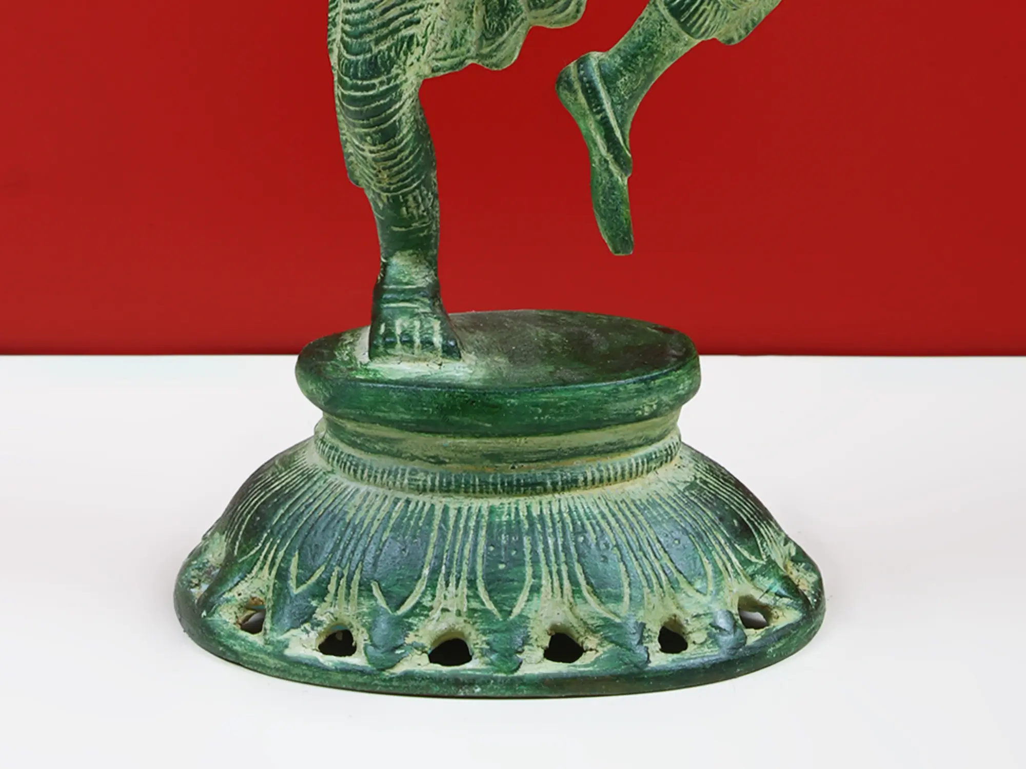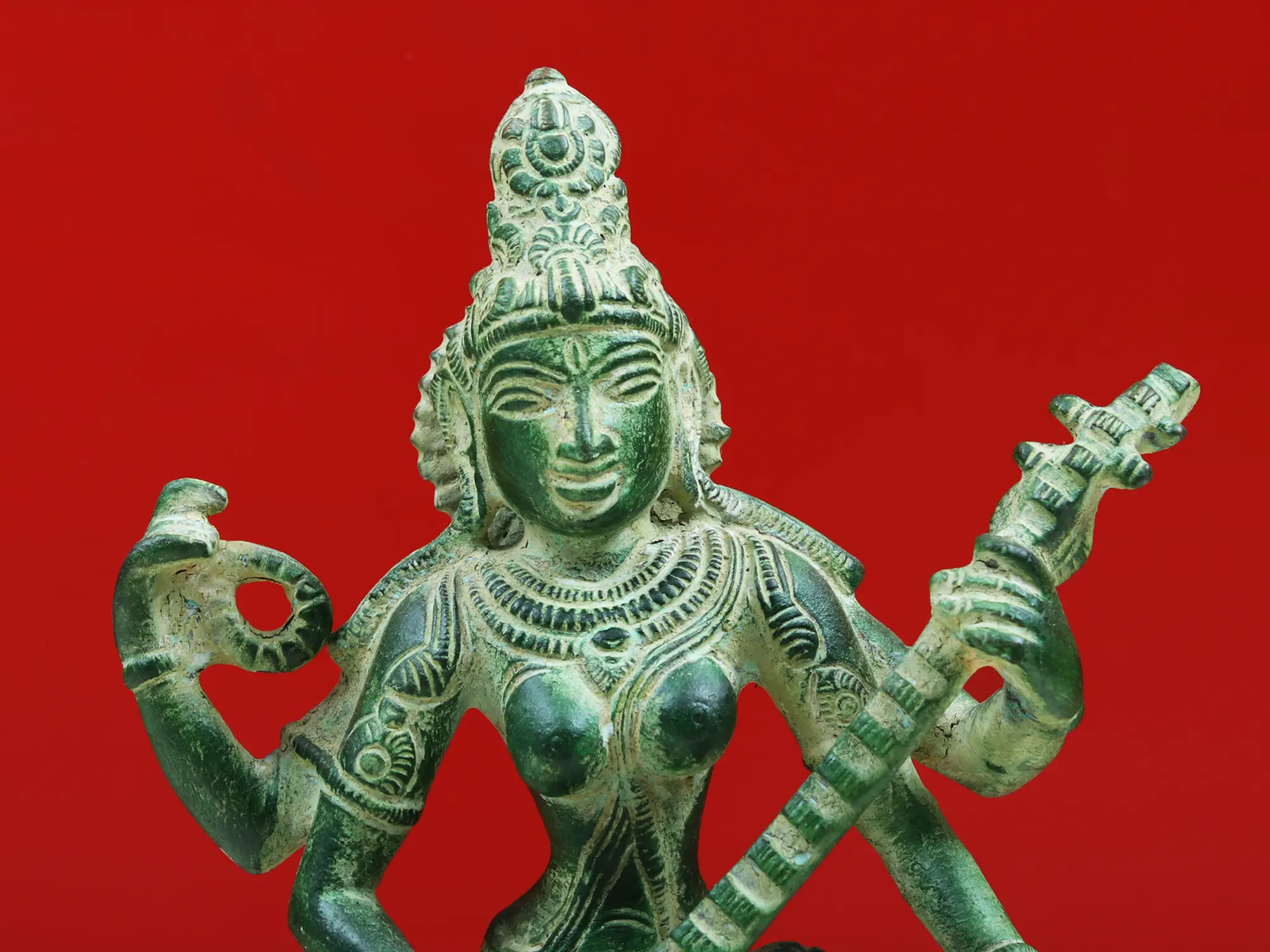 On a blossomed lotus that represents the origin of Srishti, the inspiration of Lord Brahma and his potency that led him through the task of creation- goddess Saraswati, dances mesmerically. The brass statue delineates the goddess in a blissful mood, with four arms, playing her Veena. The visual balance of Devi’s form in dynamic movement is beautifully achieved by the sculptors, making this a heavenly murti of Veenavadini.