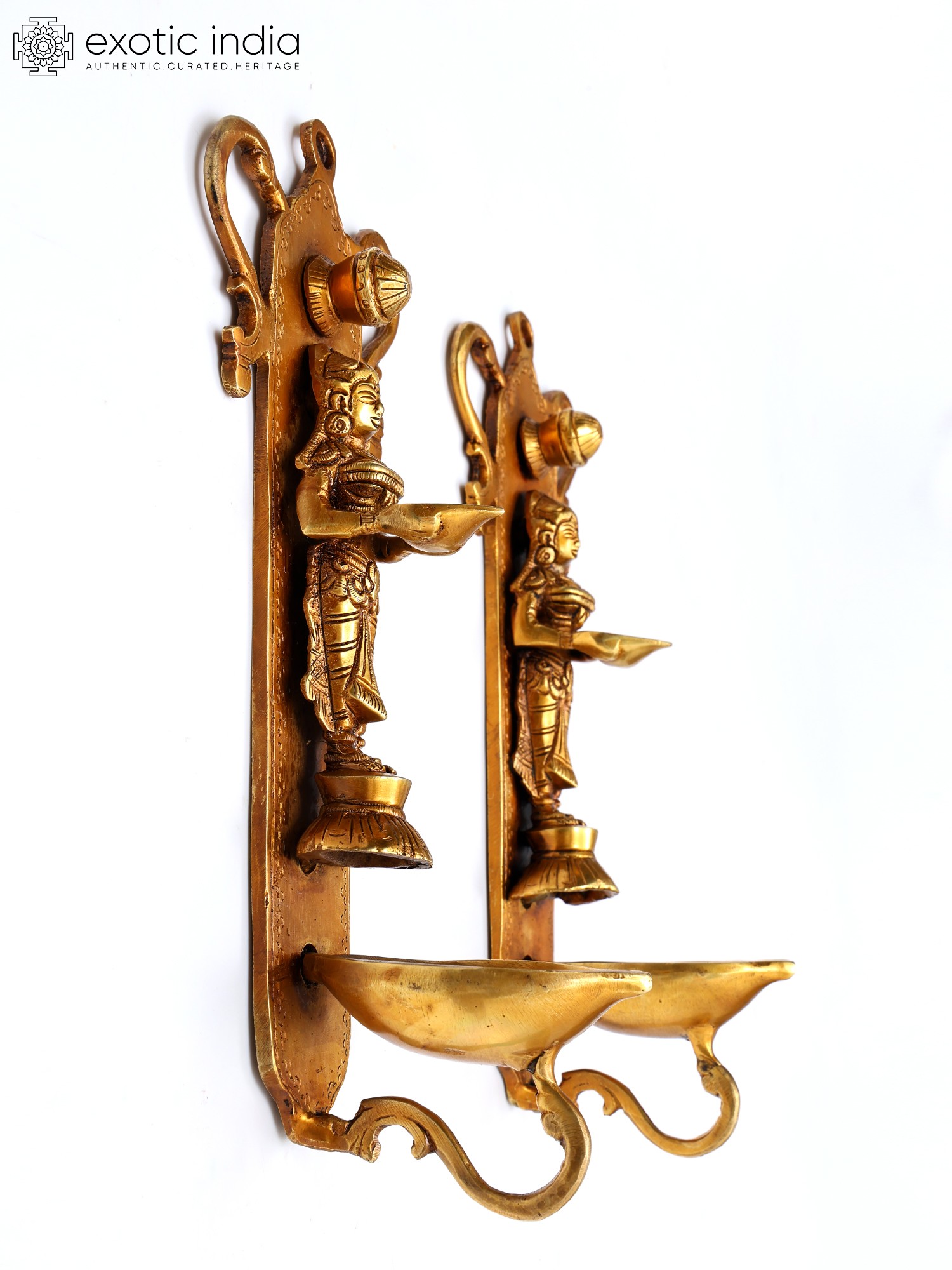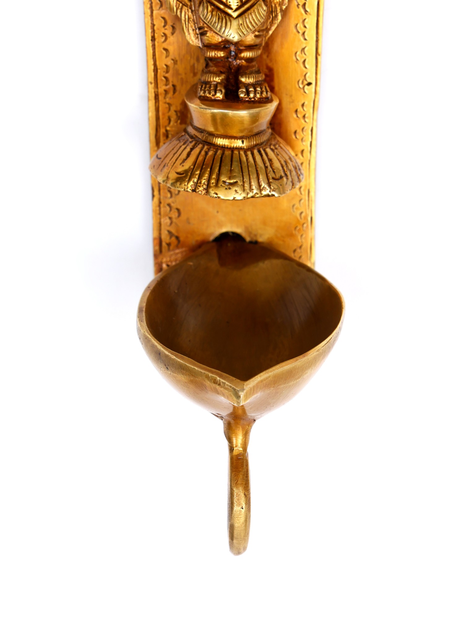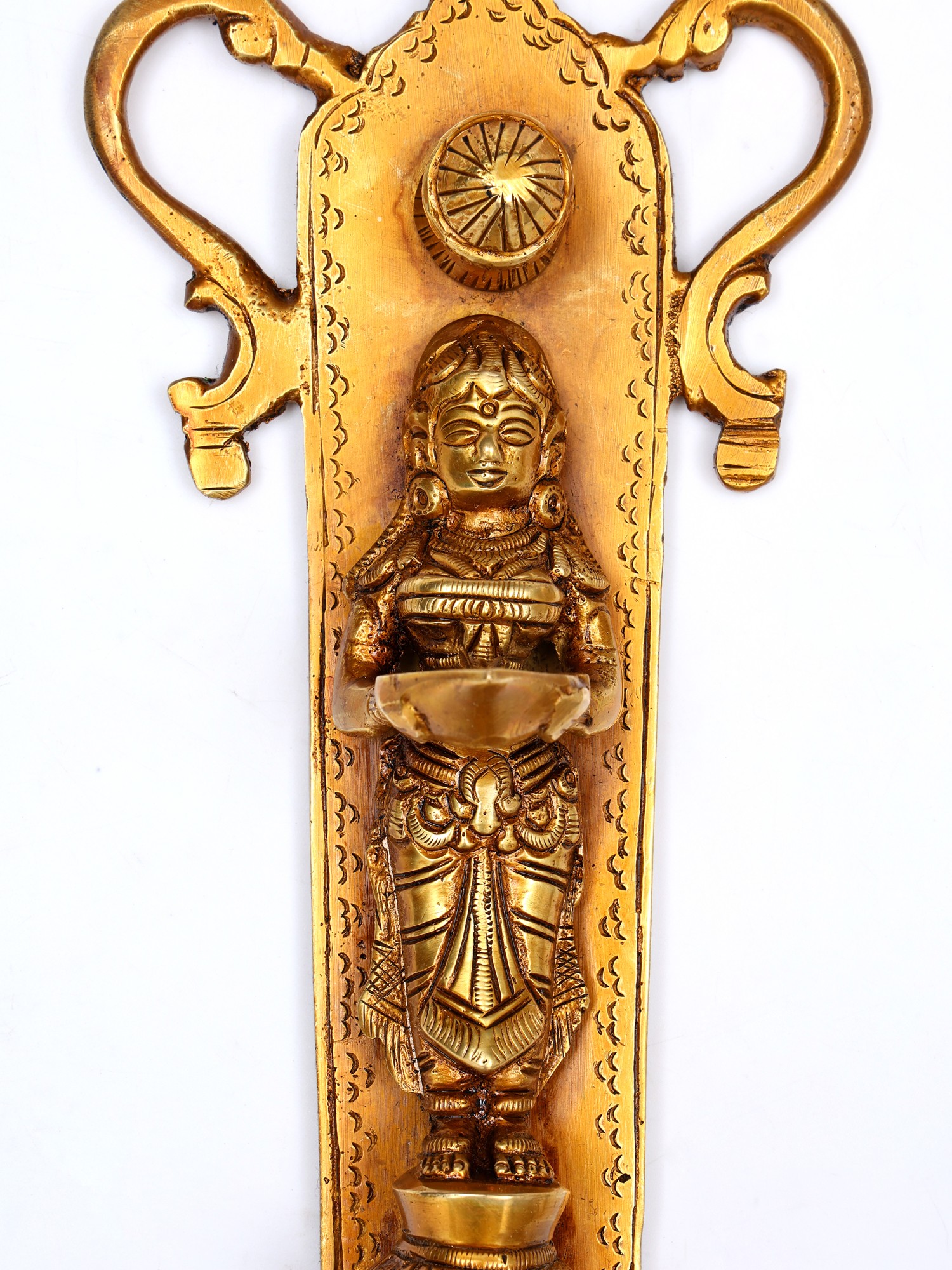 This brass wall hanging is also adorned with a Deepalakshmi. Deepalakshmi is the heavenly woman who personifies elegance and prosperity. The Deepalakshmi does not represent Goddess Lakshmi, but rather the function of Hindu society's goddesses. This lamp's woman is dressed in elaborate attire and jewelry. The valuables used to depict her position as a wealthy woman also highlight their significance as a conduit through which the same traits may be conveyed if the statues are put in the house and the lights in her hands are lit on important occasions.