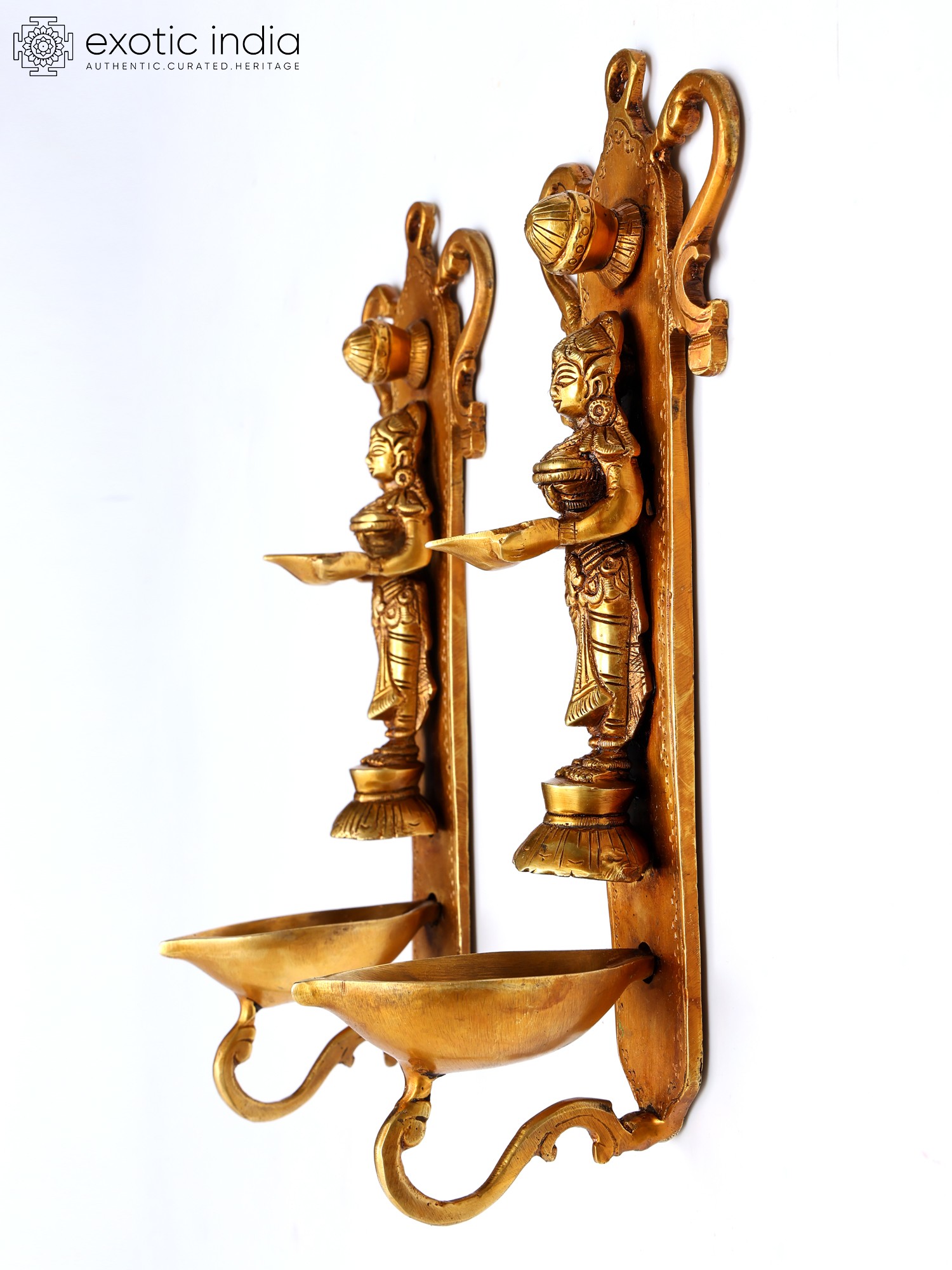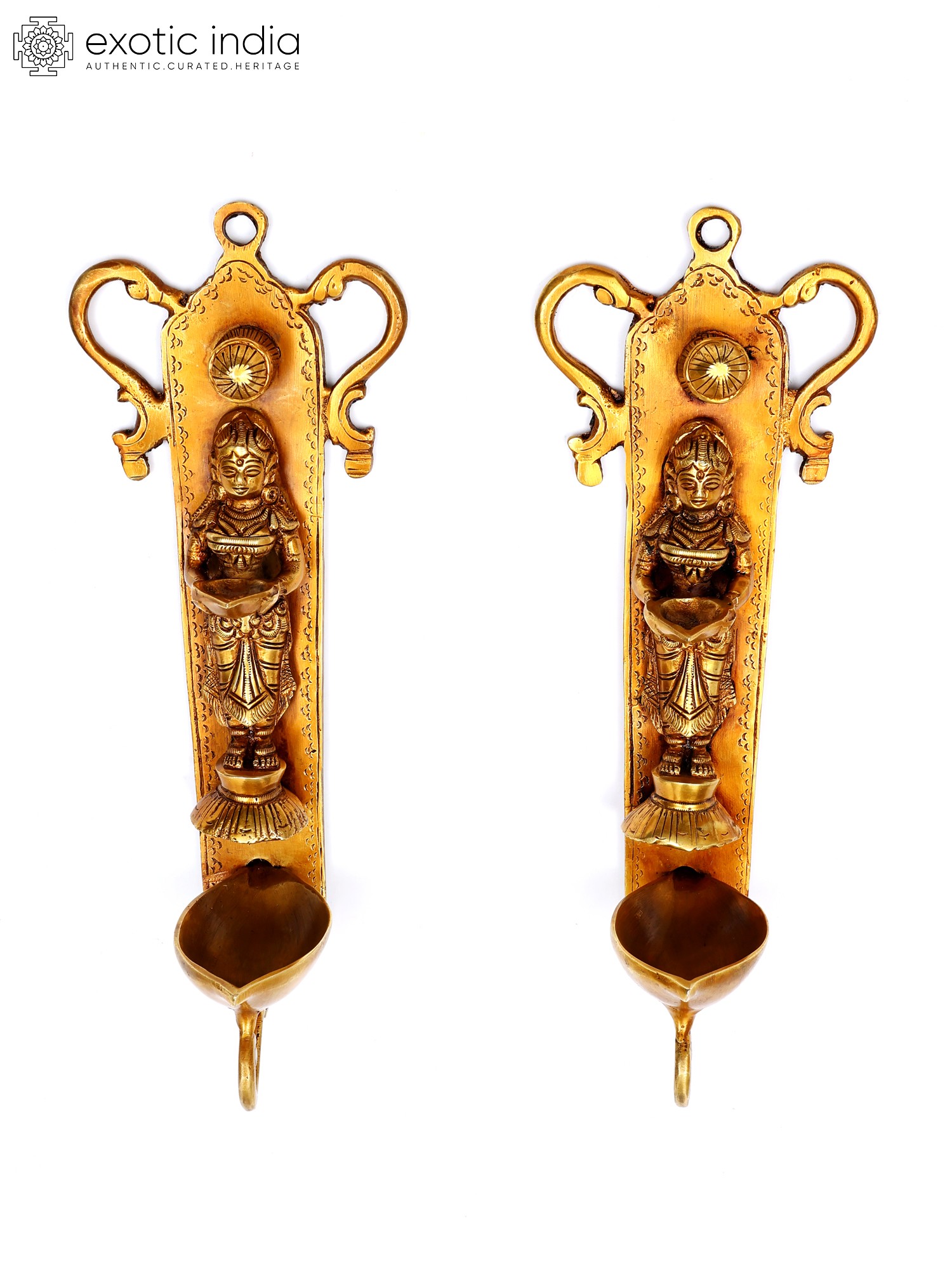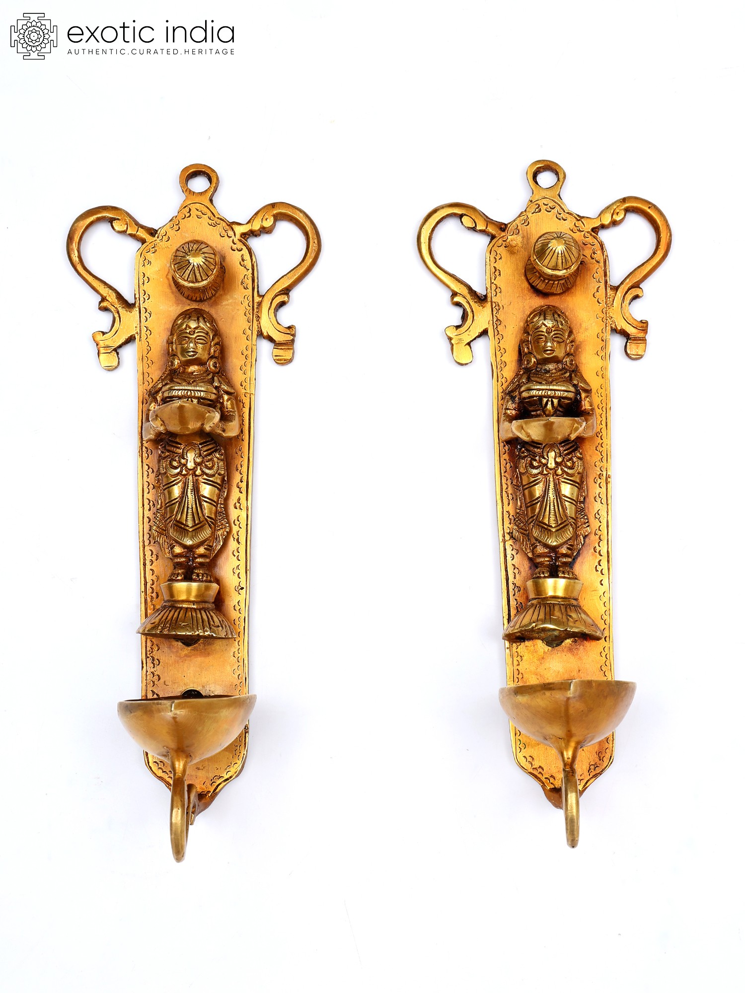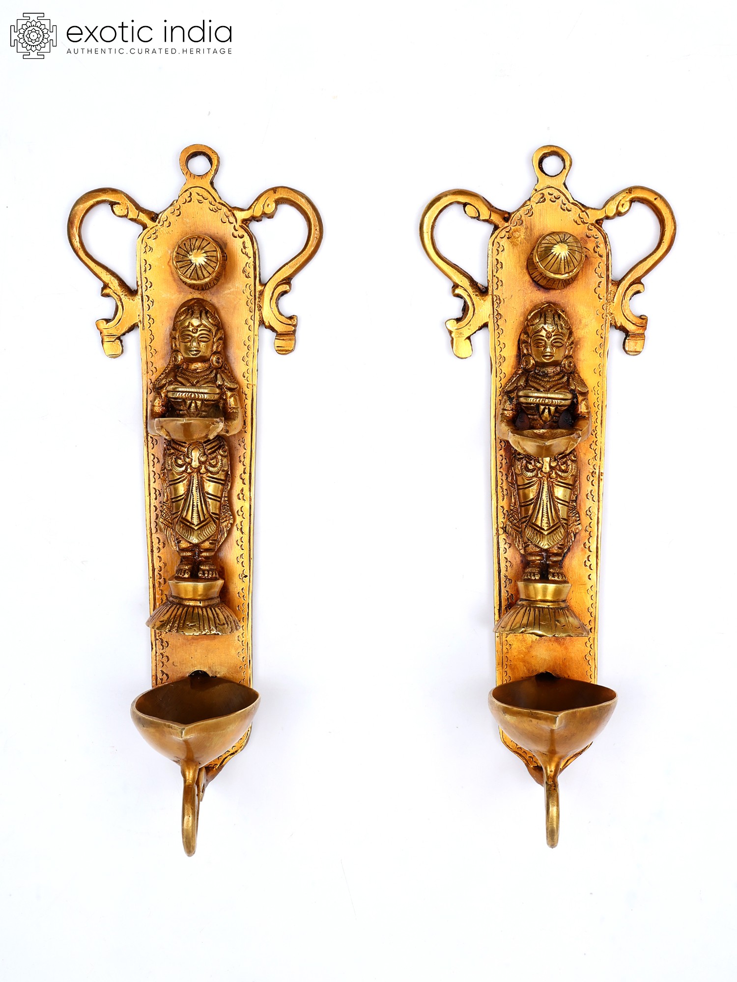 This brass wall hanging is also adorned with a Deepalakshmi. Deepalakshmi is the heavenly woman who personifies elegance and prosperity. The Deepalakshmi does not represent Goddess Lakshmi, but rather the function of Hindu society's goddesses. This lamp's woman is dressed in elaborate attire and jewelry. The valuables used to depict her position as a wealthy woman also highlight their significance as a conduit through which the same traits may be conveyed if the statues are put in the house and the lights in her hands are lit on important occasions.