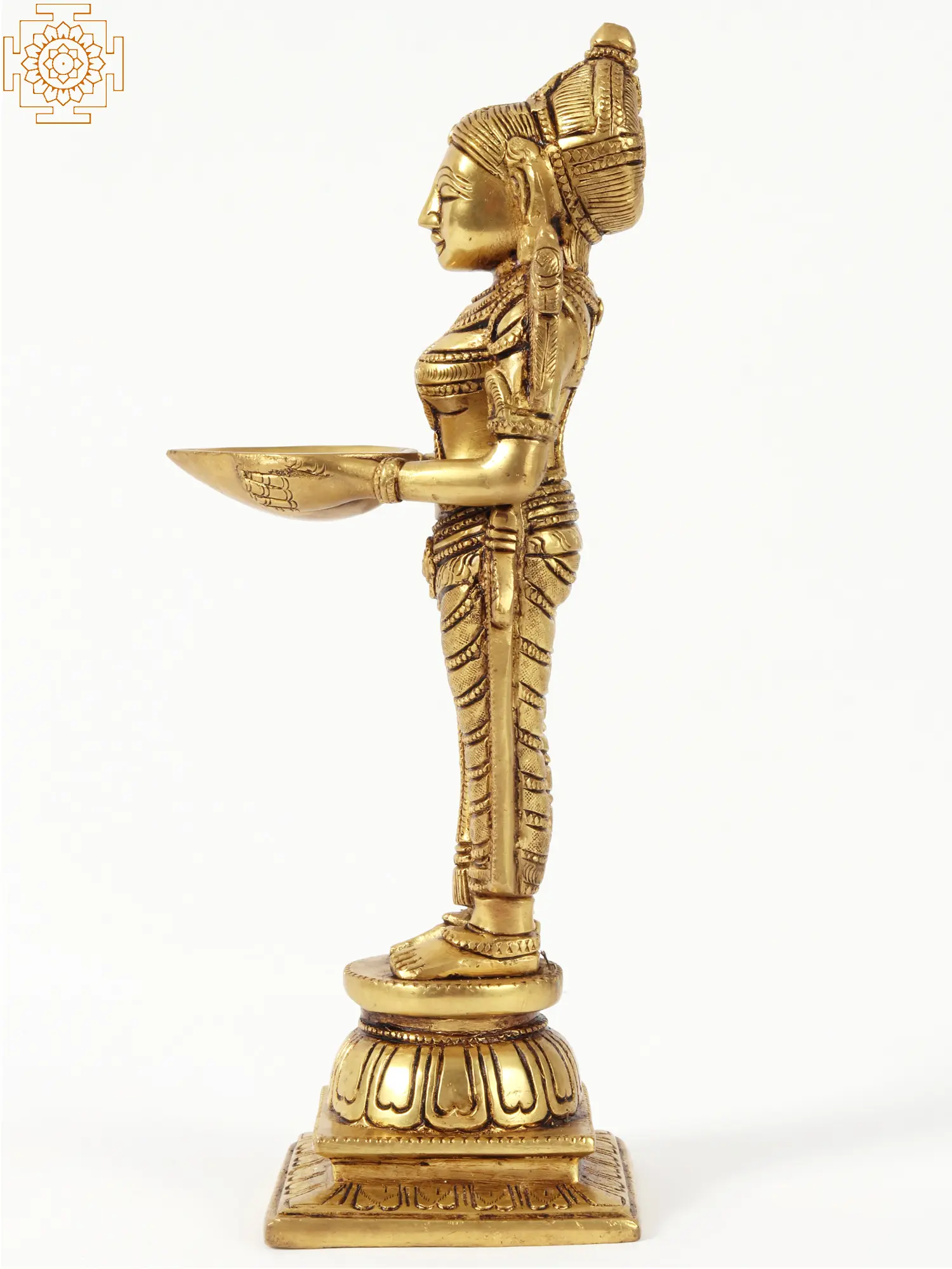 This exquisite brass statue captures the essence of Deeplakshmi, a revered figure embodying prosperity, light, and good fortune. Crafted with meticulous detail by skilled artisans, the standing figure holds aloft a vessel, ready to be lit, symbolizing the dispelling of darkness and the ushering in of auspiciousness. The rich golden hue of the brass lends an aura of divinity and timeless elegance to this piece, making it a captivating addition to any sacred space or home decor. Deeplakshmi, also known as Alakshmi's opposite, is invoked during festivals and daily rituals to invite blessings and ward off negativity. Her presence is said to bring wealth, abundance, and domestic harmony. In many traditions, she is associated with Lakshmi, the goddess of wealth, and is venerated for her power to illuminate lives both literally and figuratively. The act of lighting a lamp in her honor is a profound ritual, signifying the triumph of knowledge over ignorance and hope over despair.